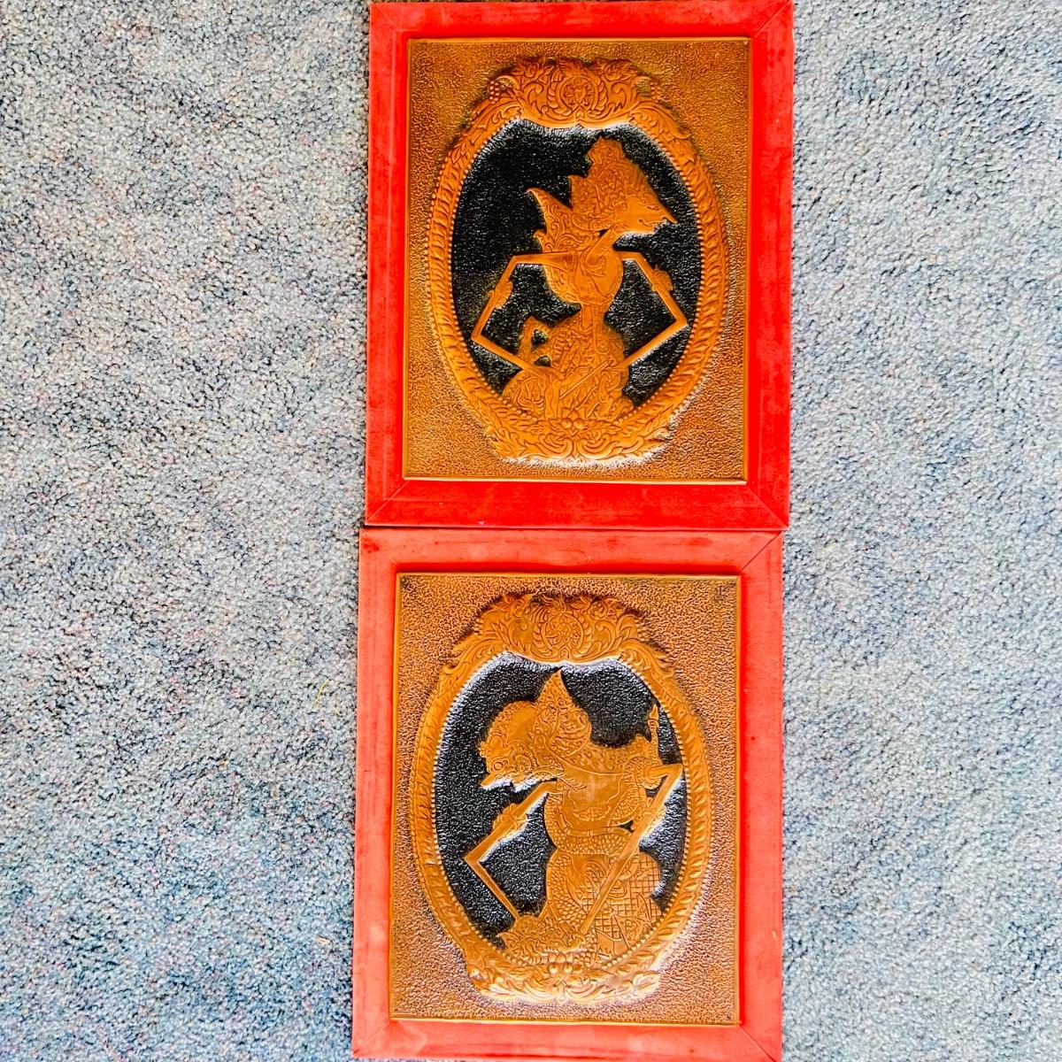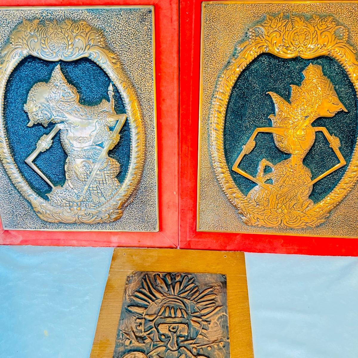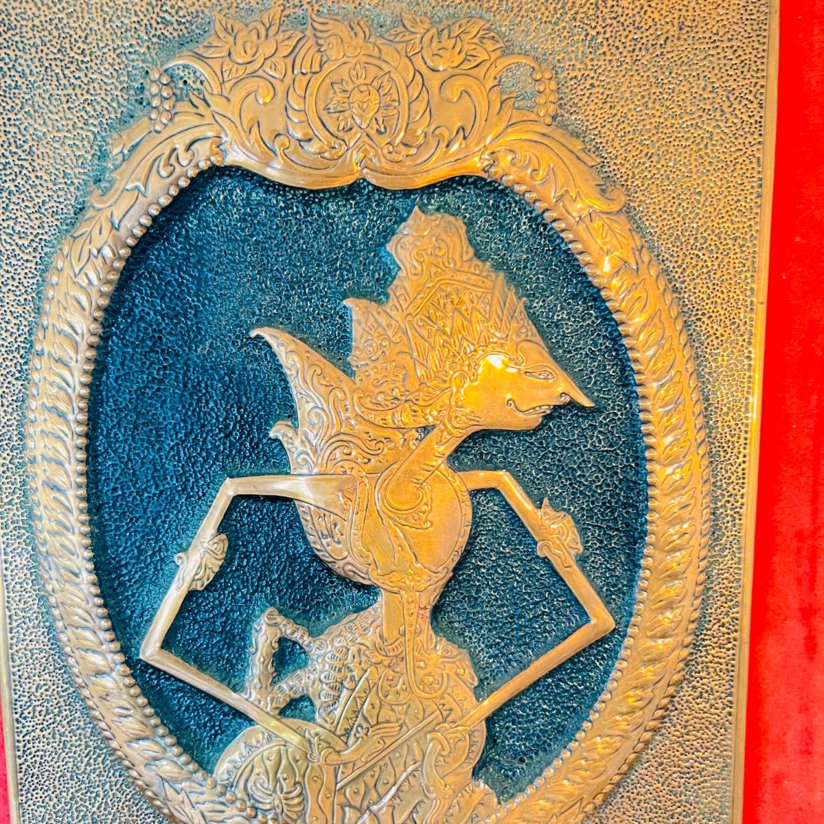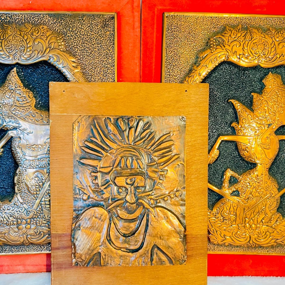 Three Indonesian style wall hangings. Two larger pieces measure 13”x16” including the red velvet matting which is faded. Smaller piece appears to be copper measures 6”x8” and is mounted on a thin piece of wood.