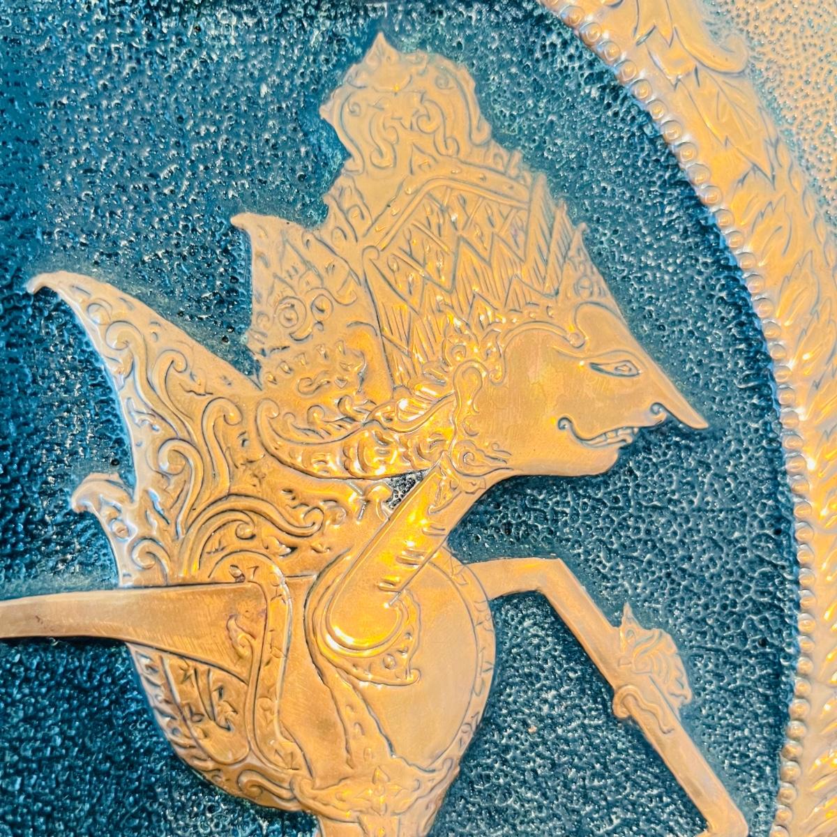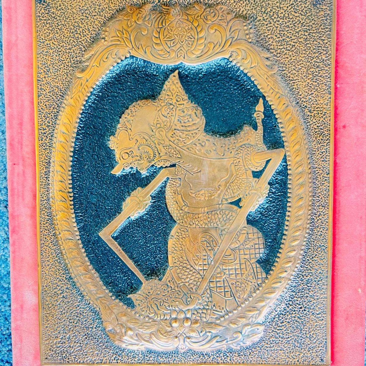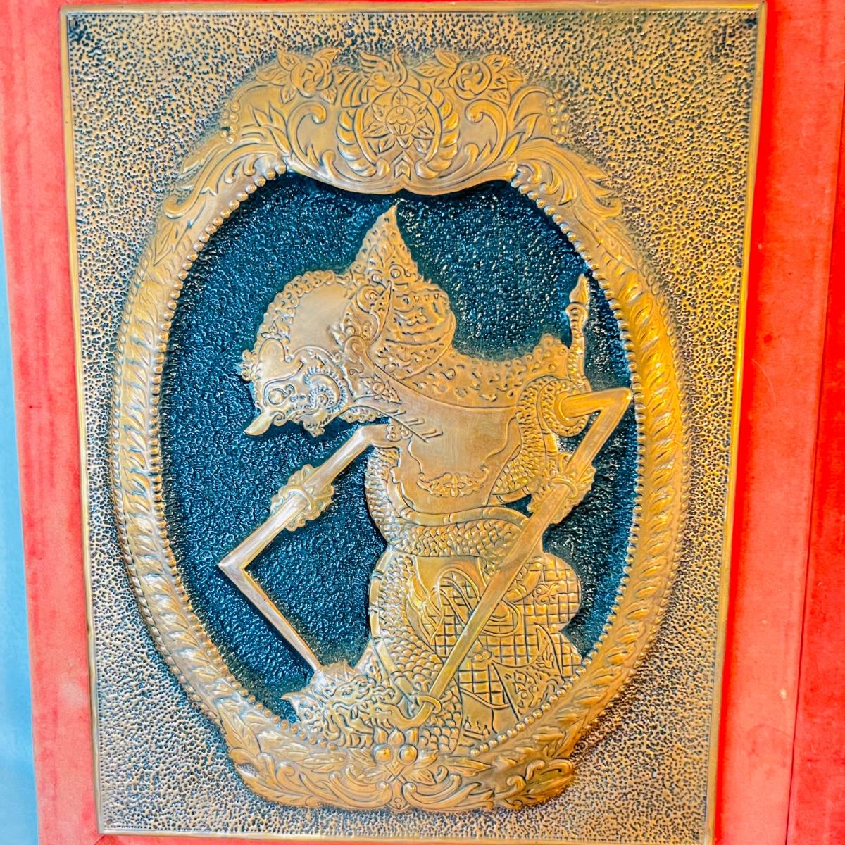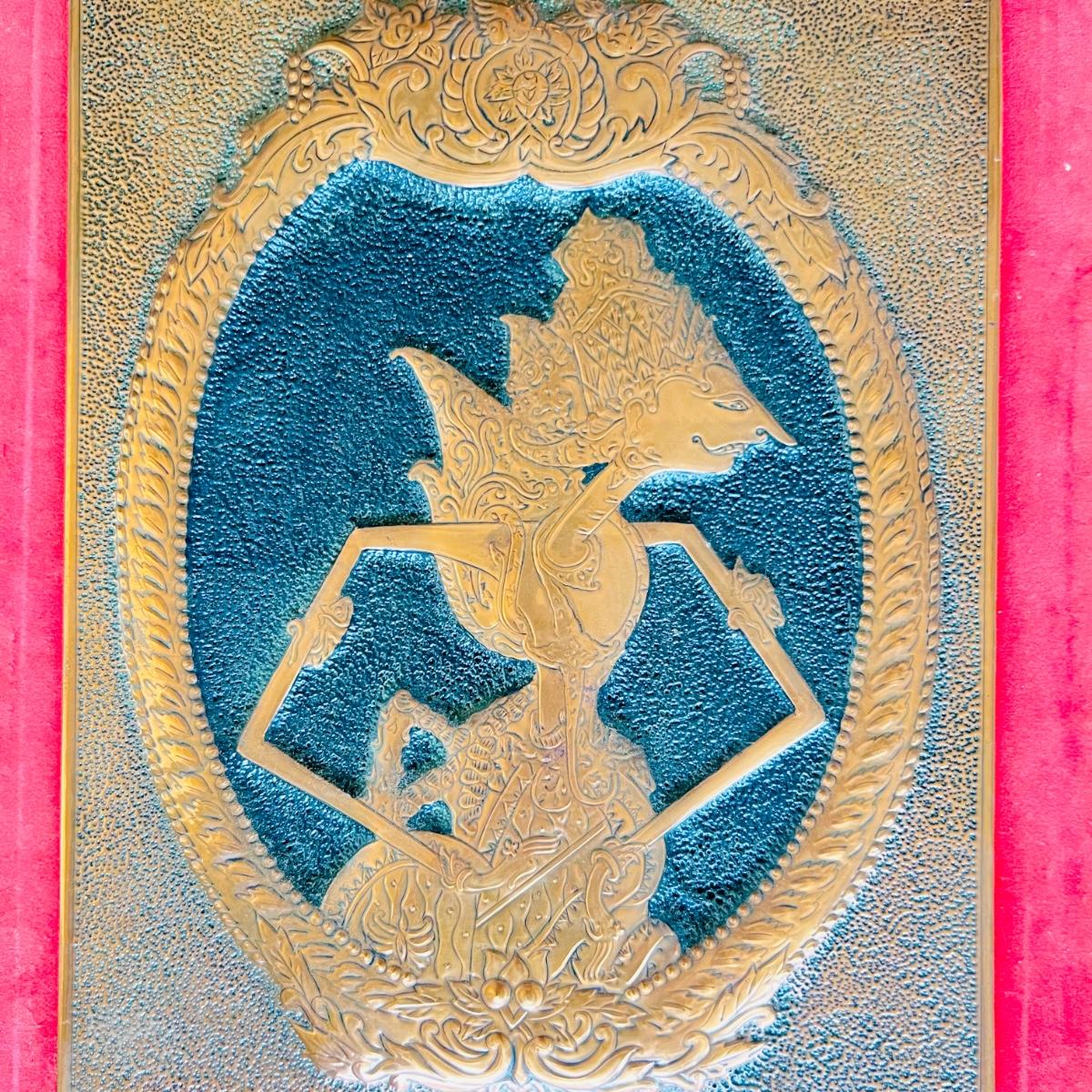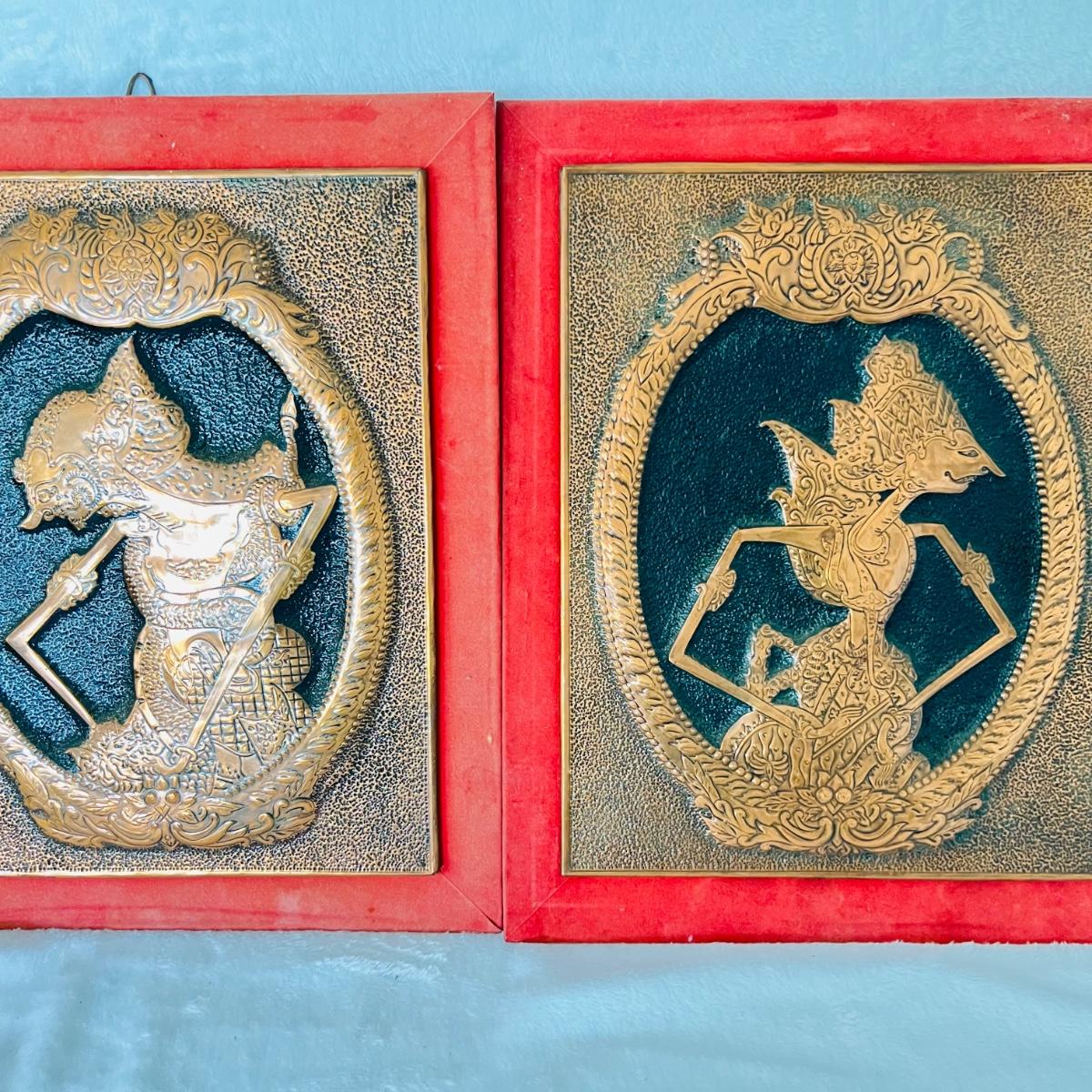 Three Indonesian style wall hangings. Two larger pieces measure 13”x16” including the red velvet matting which is faded. Smaller piece appears to be copper measures 6”x8” and is mounted on a thin piece of wood.