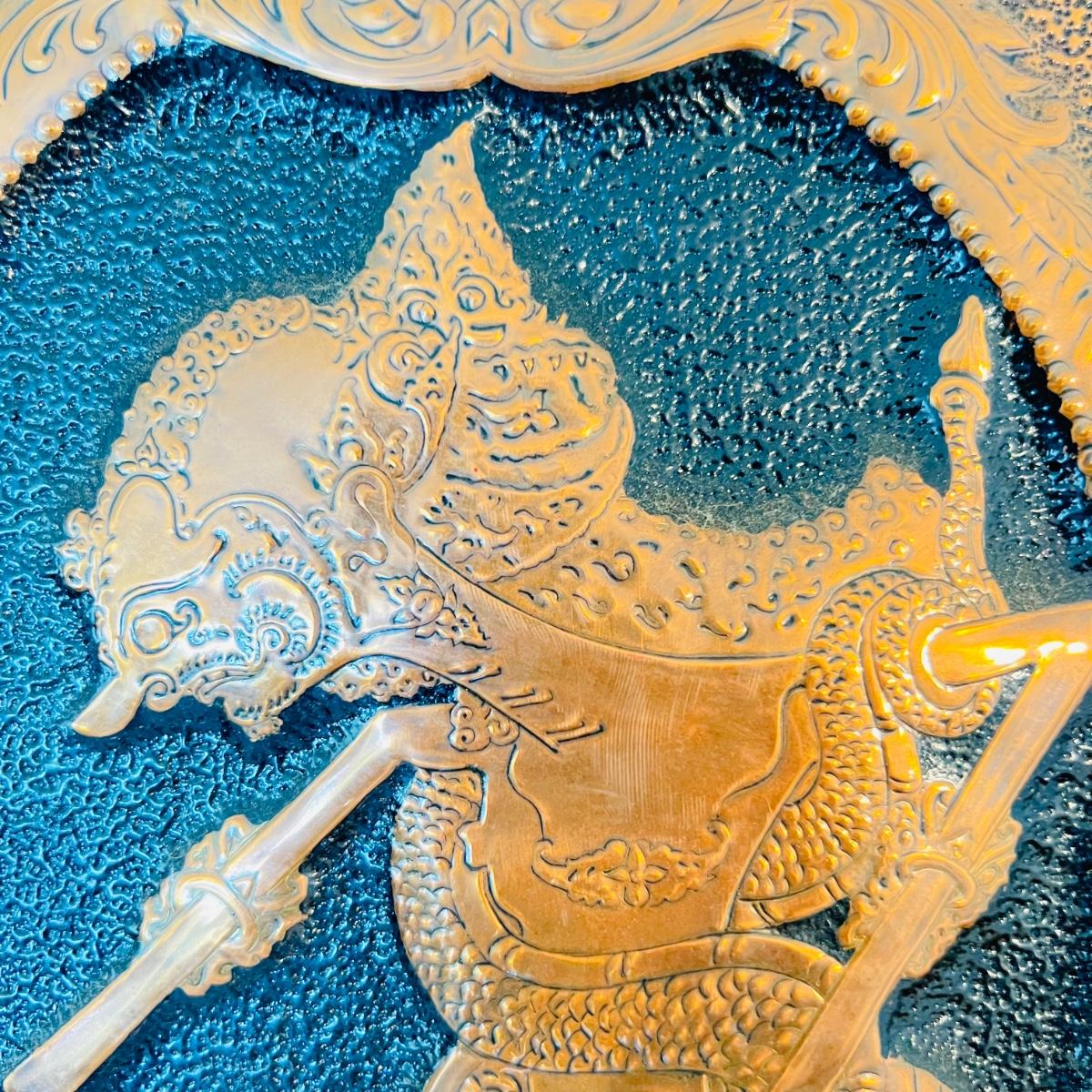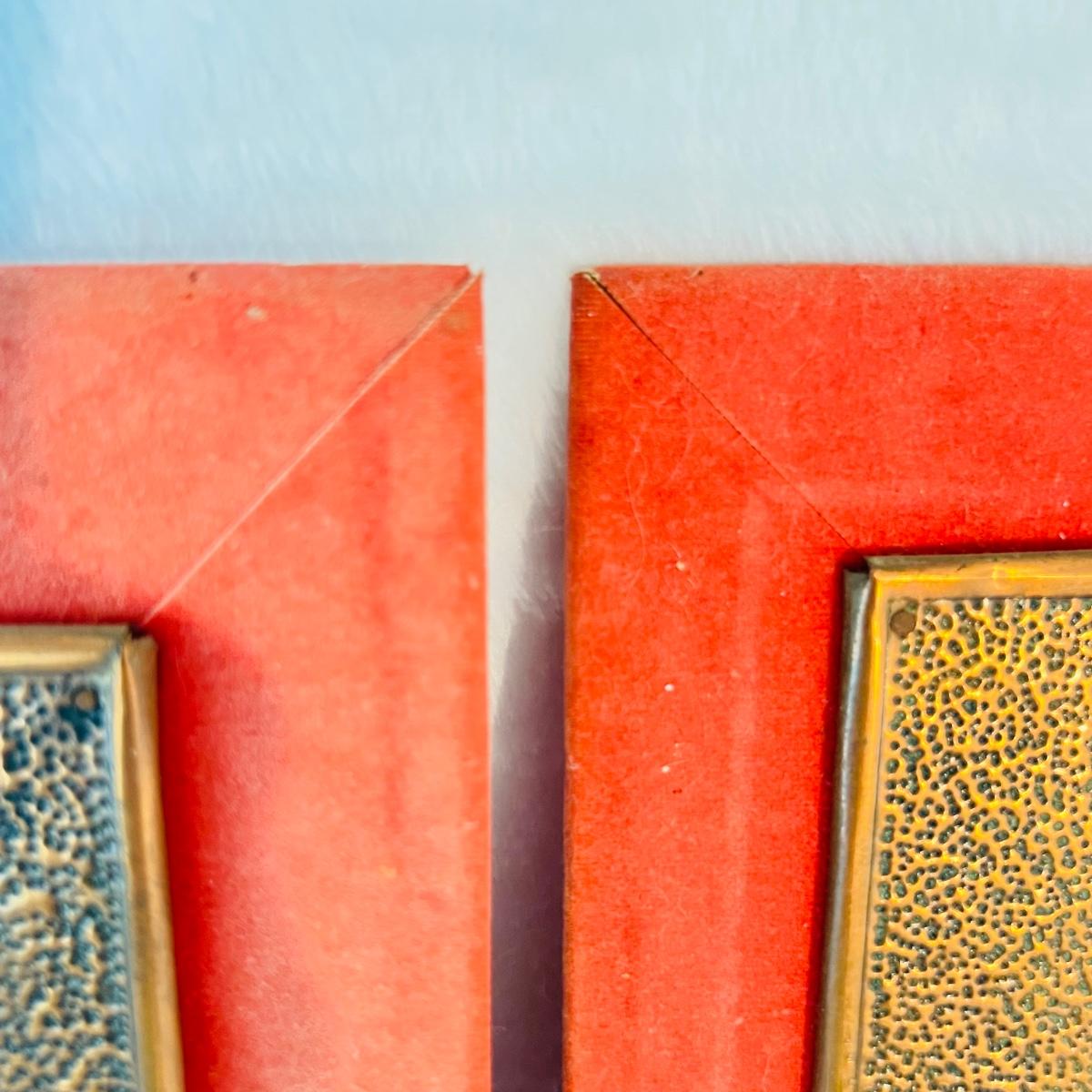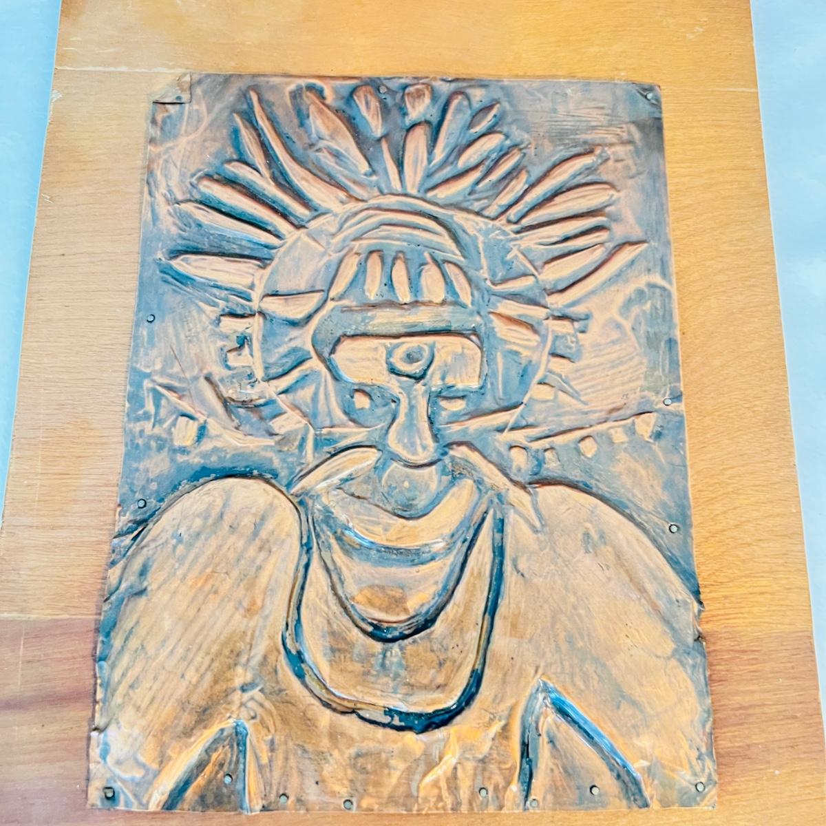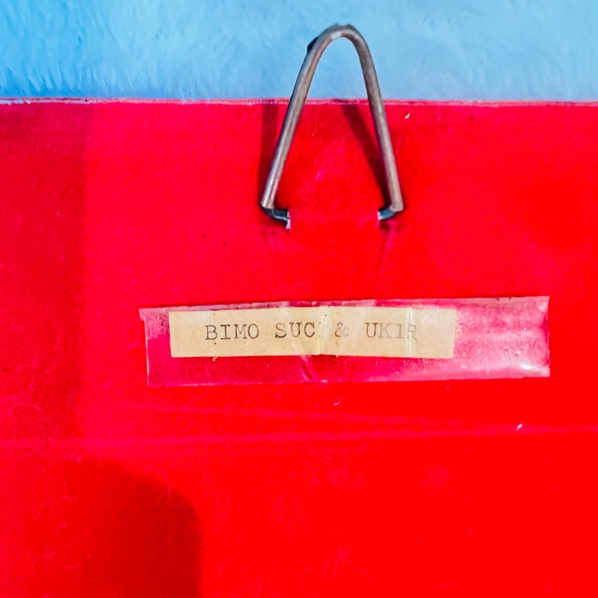Three Indonesian style wall hangings. Two larger pieces measure 13”x16” including the red velvet matting which is faded. Smaller piece appears to be copper measures 6”x8” and is mounted on a thin piece of wood.
