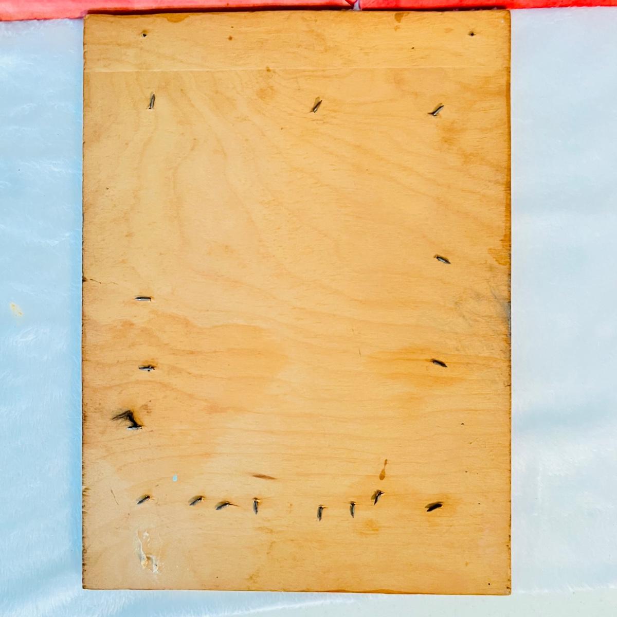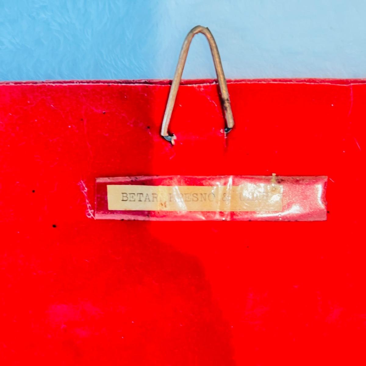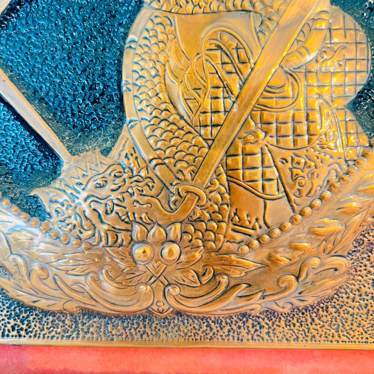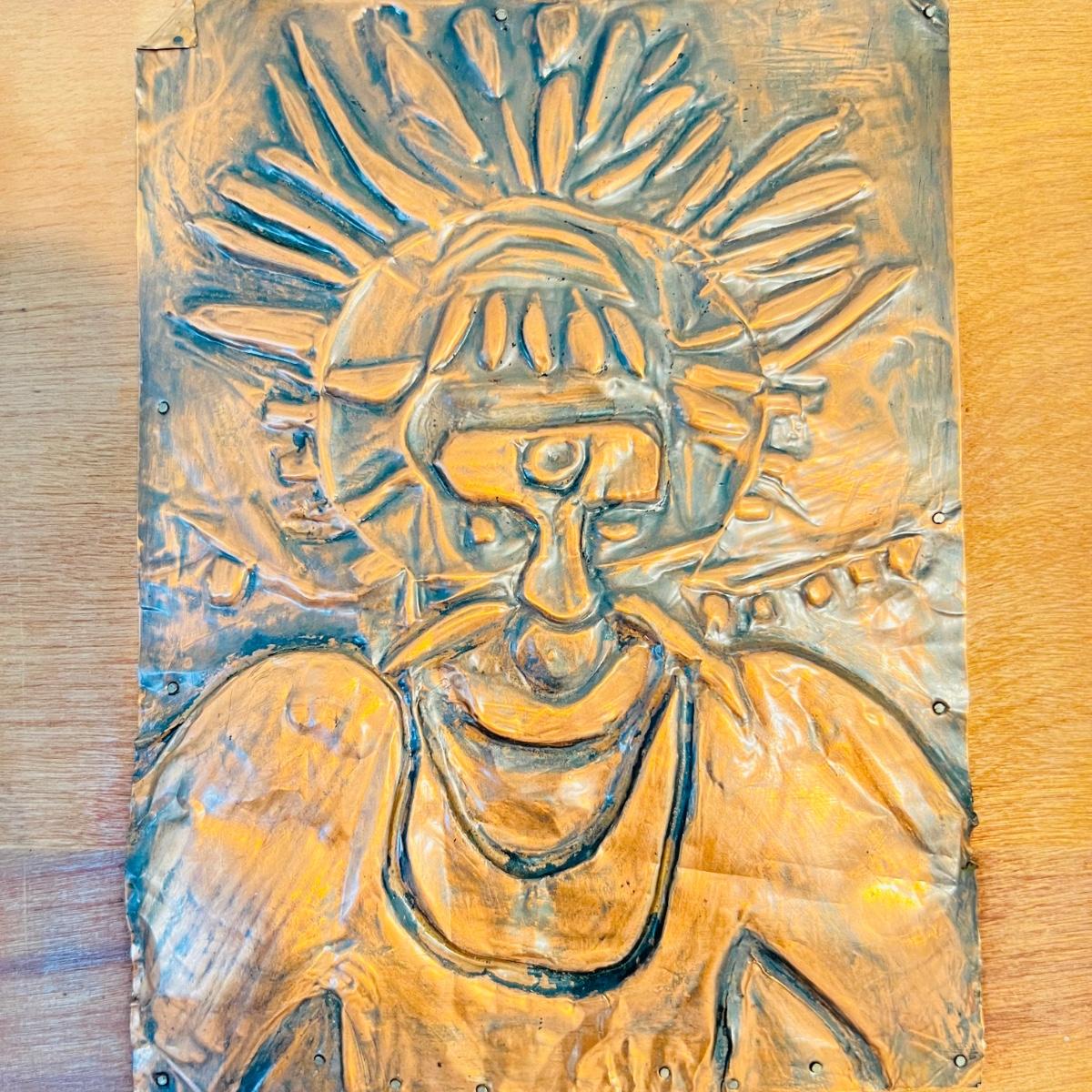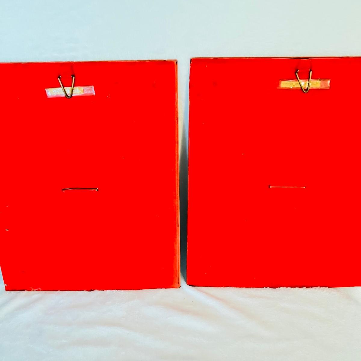 Three Indonesian style wall hangings. Two larger pieces measure 13”x16” including the red velvet matting which is faded. Smaller piece appears to be copper measures 6”x8” and is mounted on a thin piece of wood.