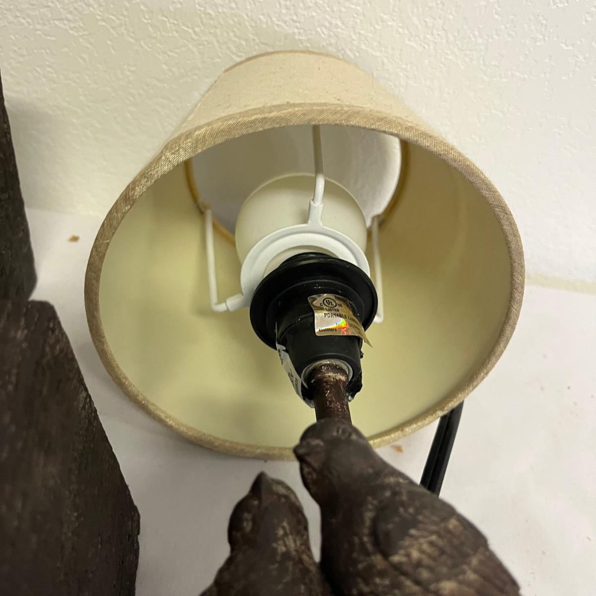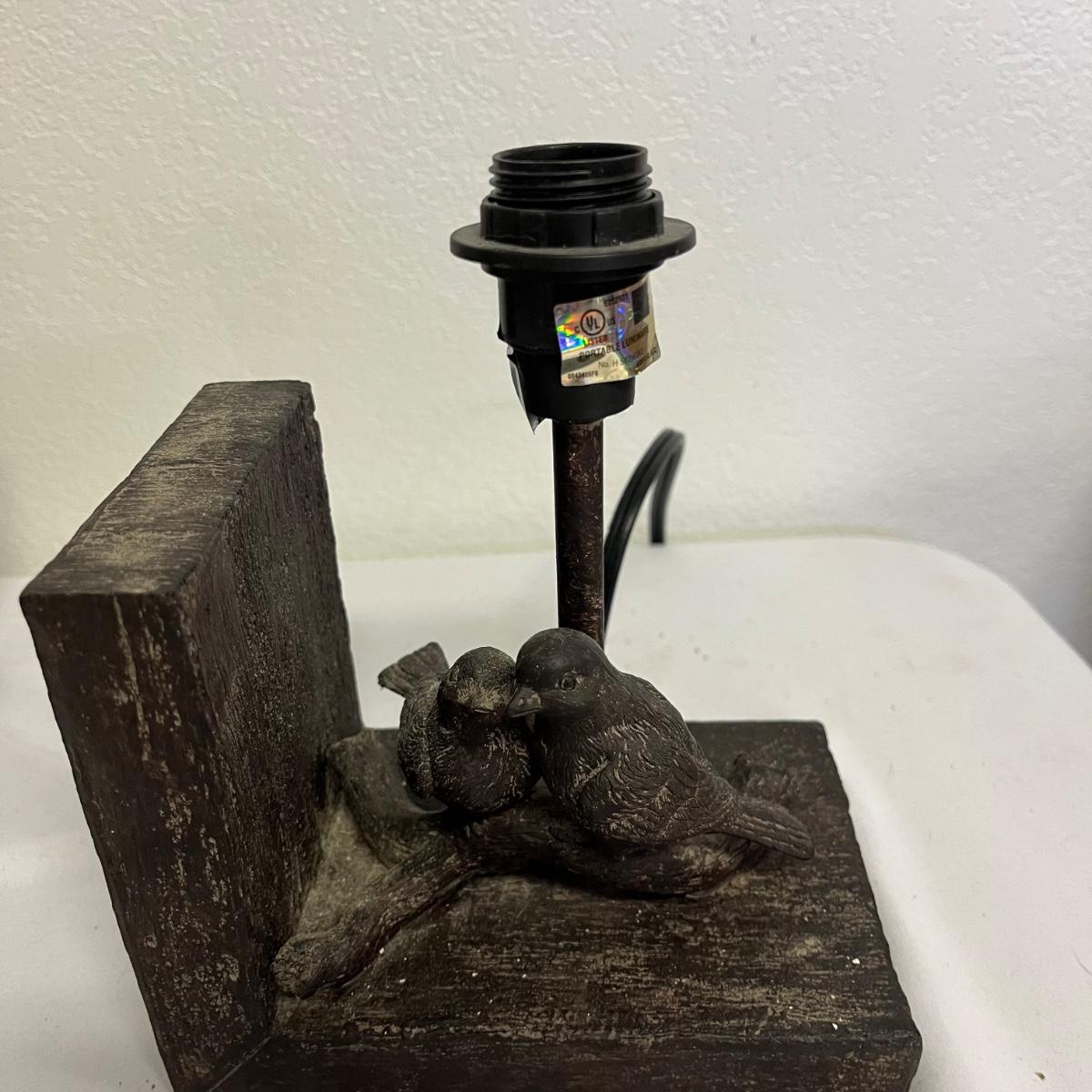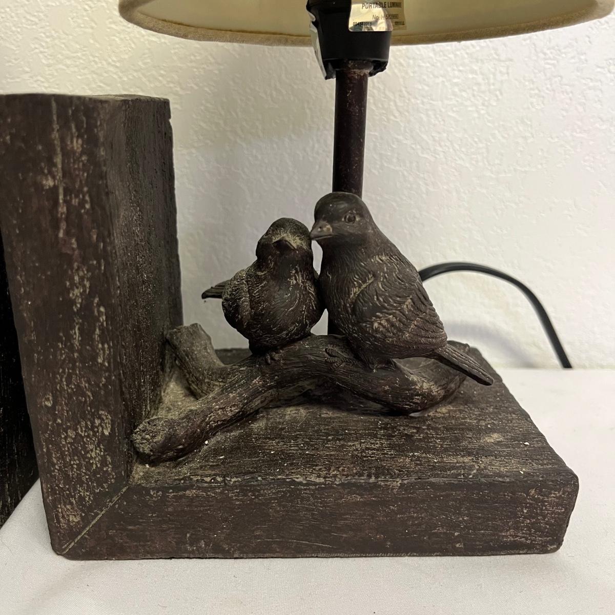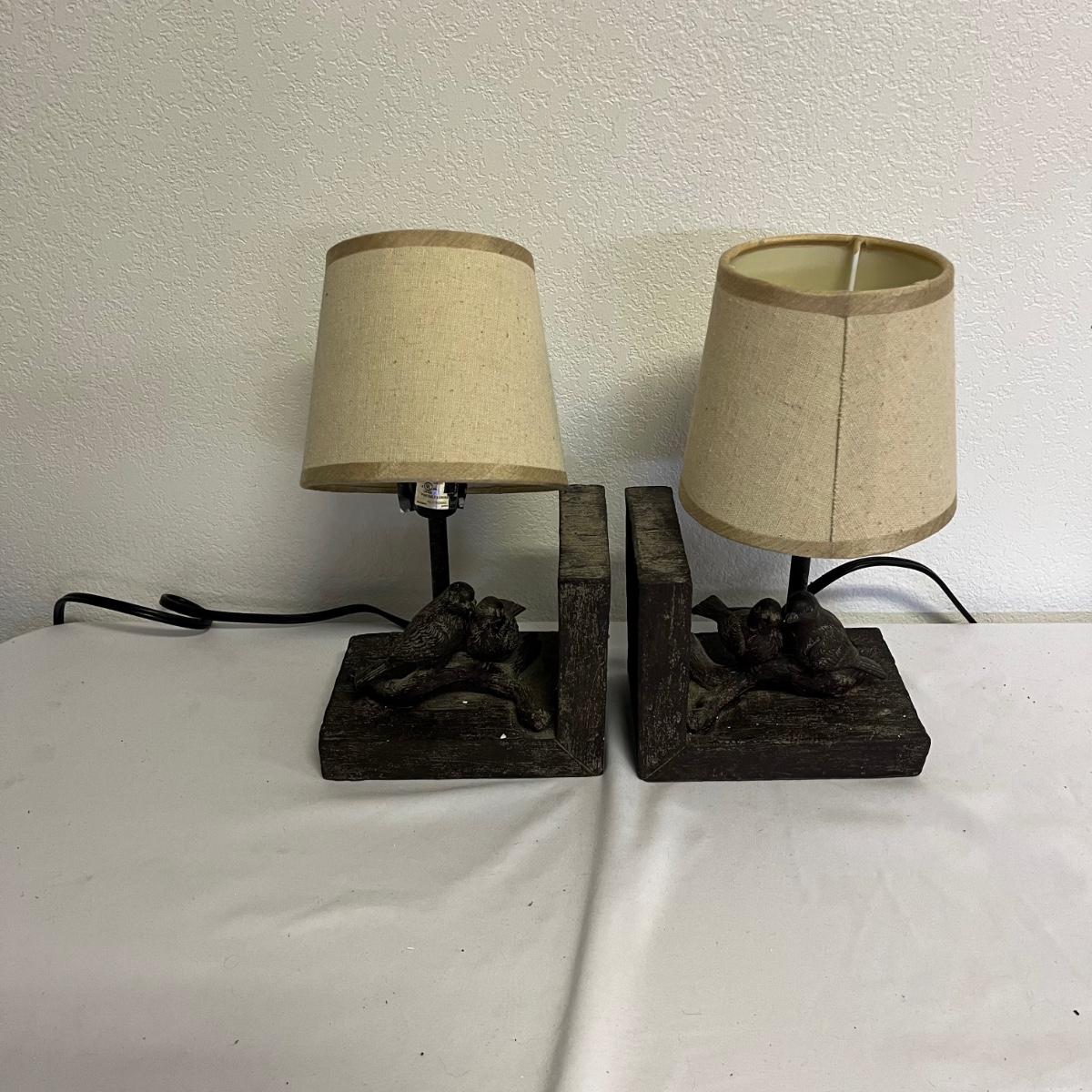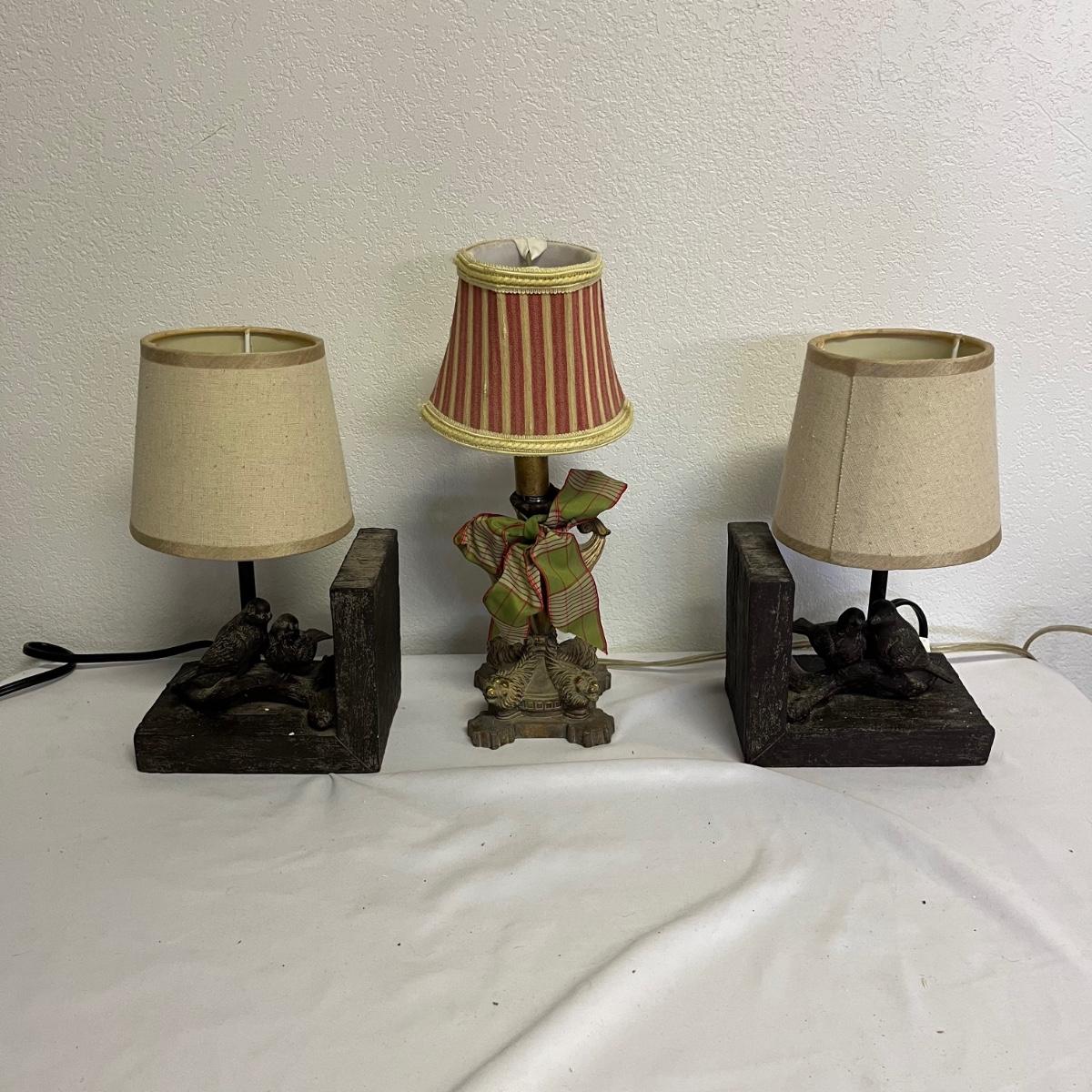 Lot includes a pair of lamp bookends with a bird design in resin and a metal lamp. All lamps have in- line switches and worked when tested. Bookends measure 4” x 6” x 10”.