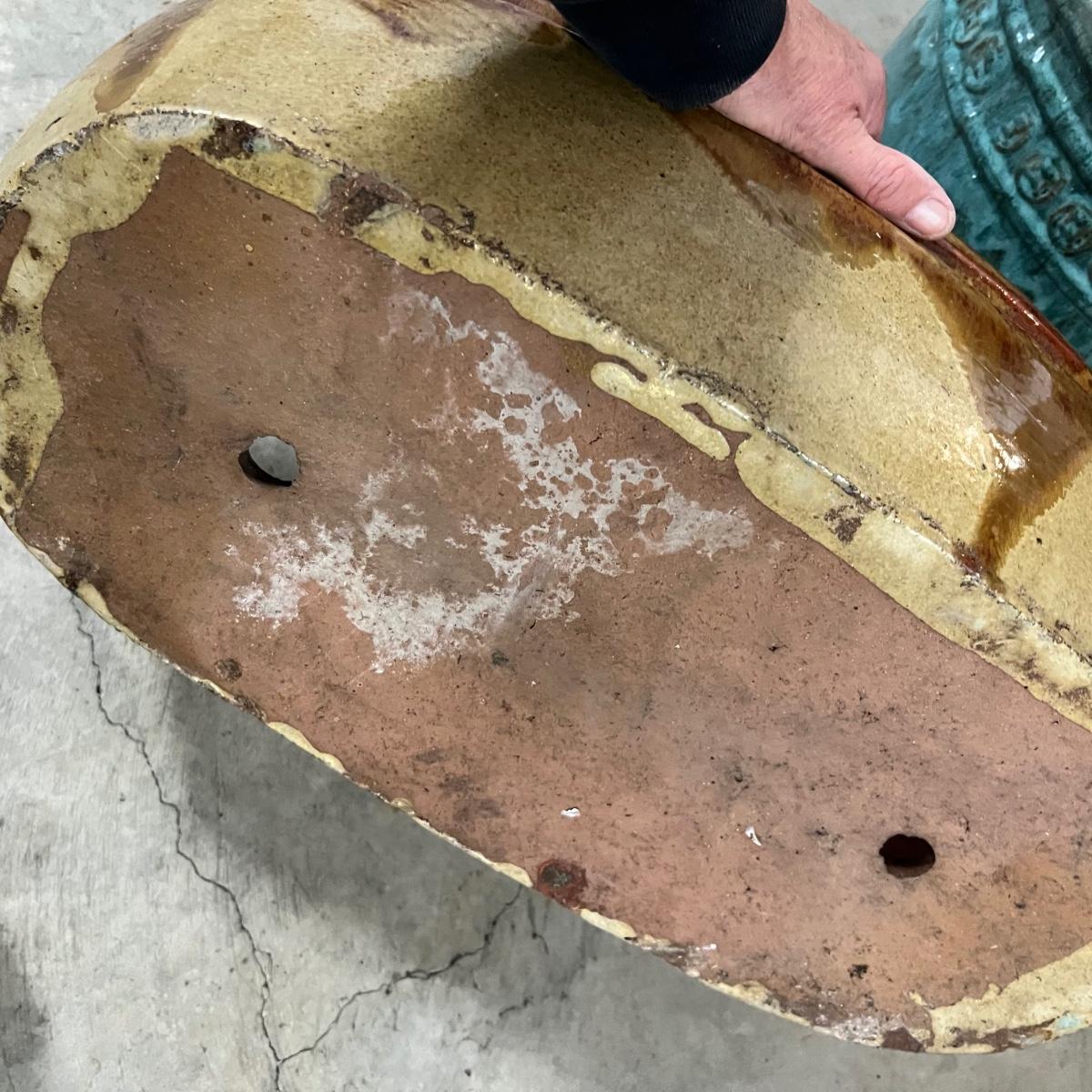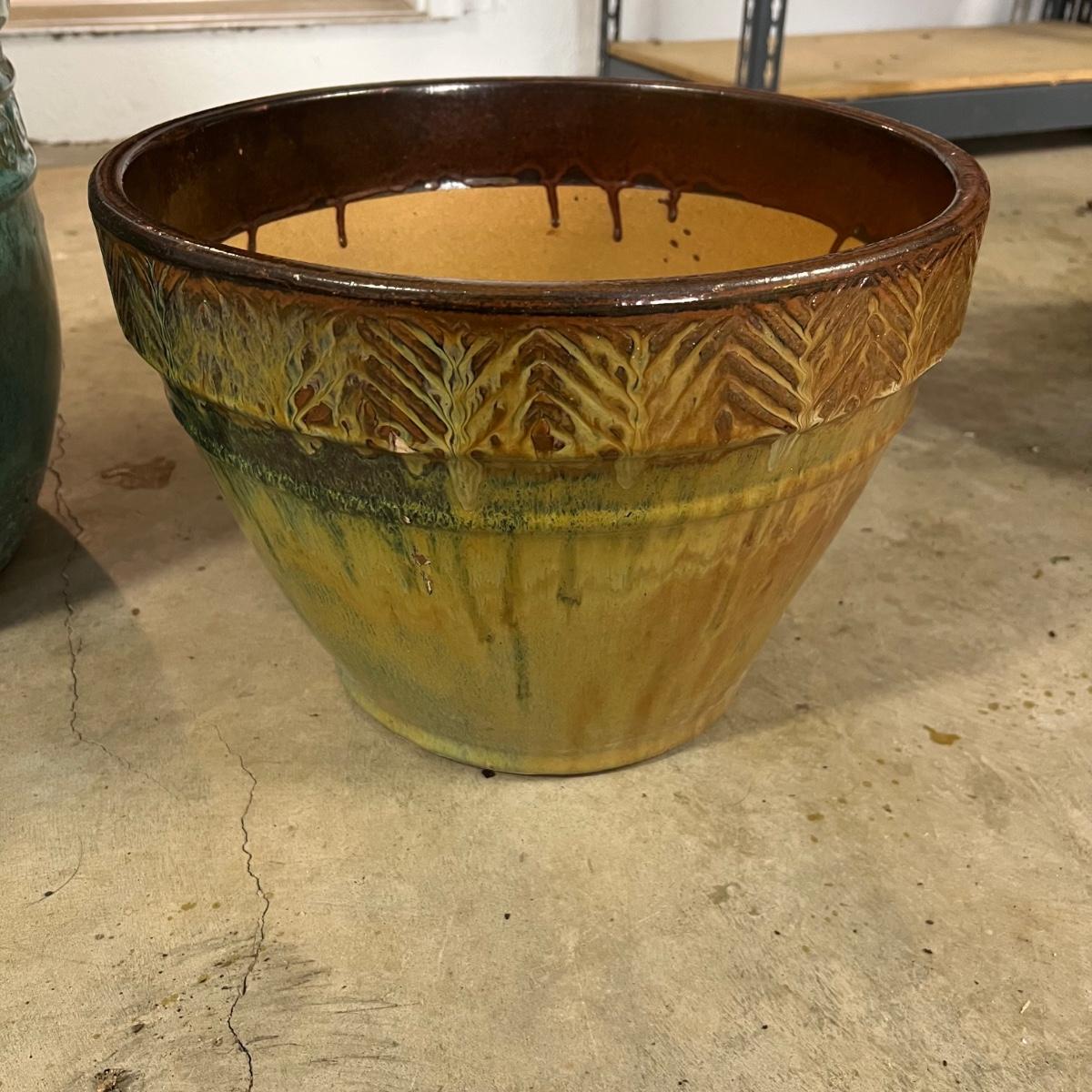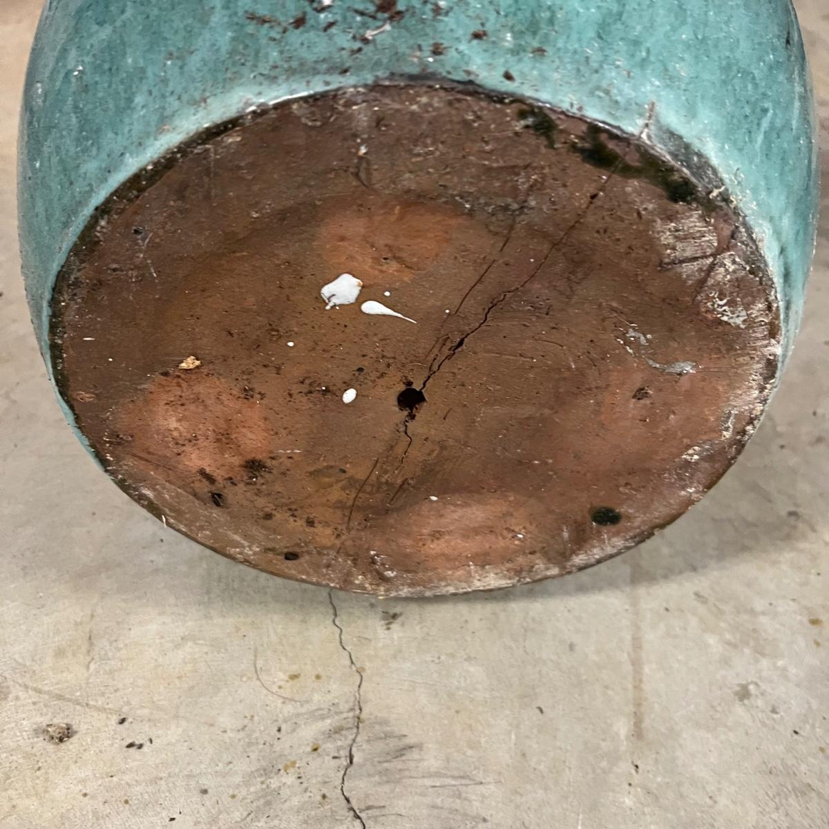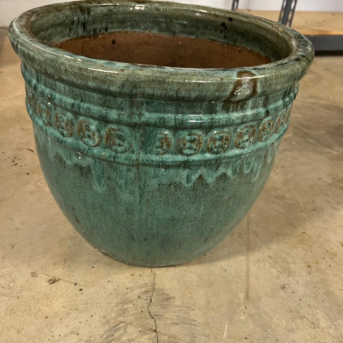 Three large plant pots all have drainage holes. The teal blue pot measures 14”D x 12”H.