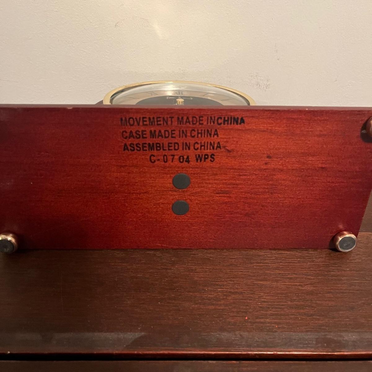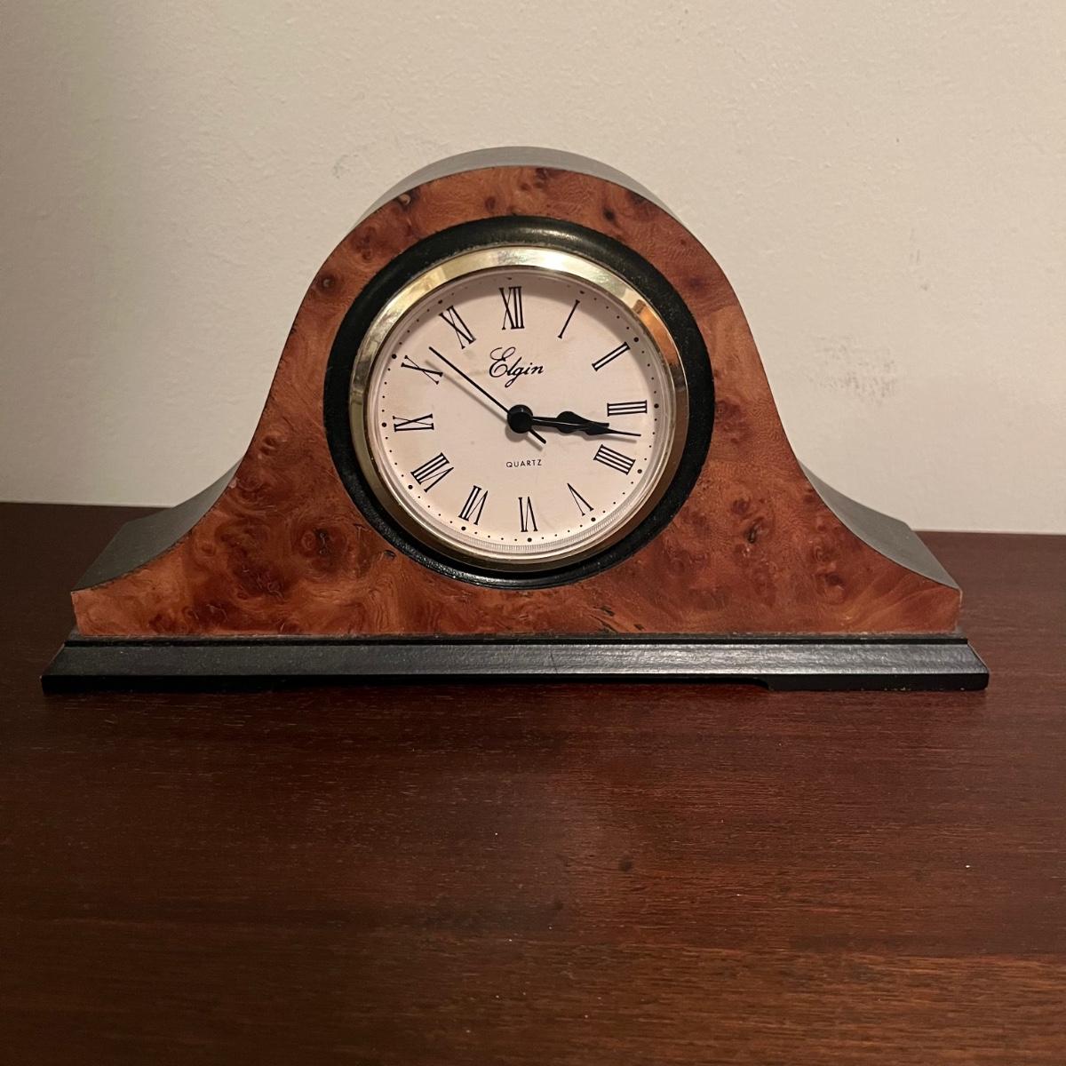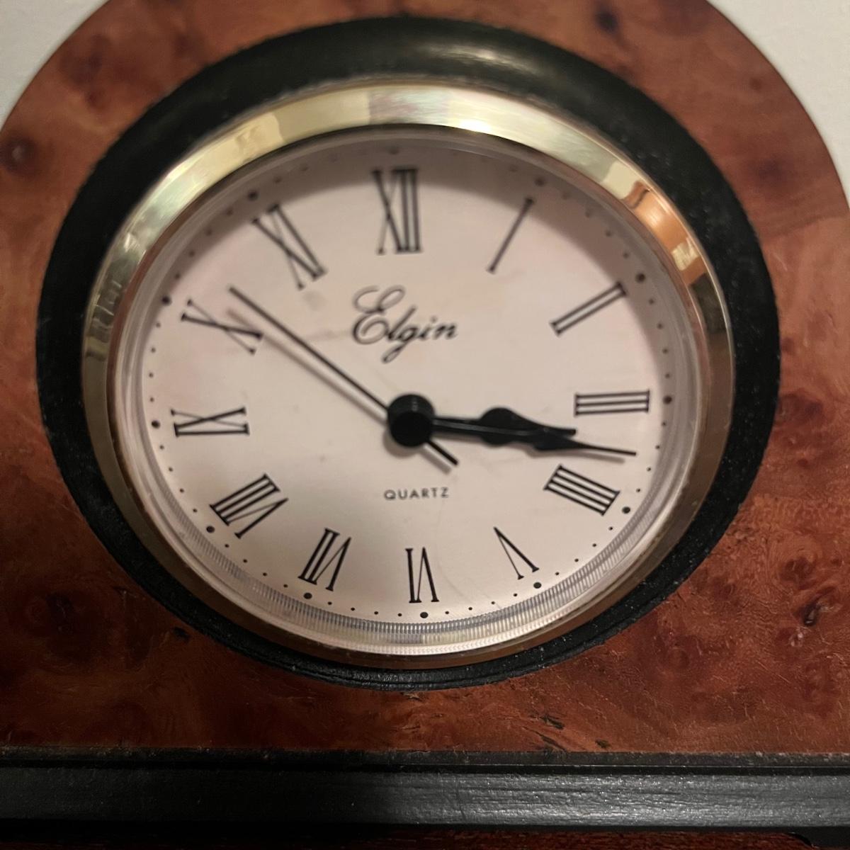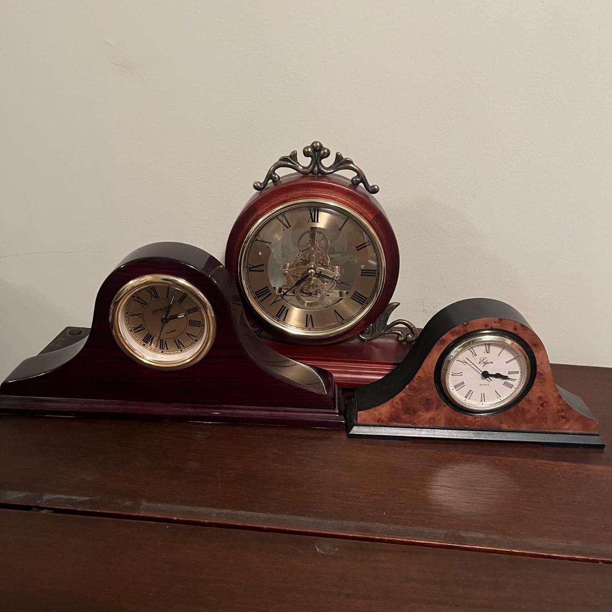 Lot includes a Danbury quartz cloth clock in a wooden body, Elgin quartz clock in a MDF body and a unbranded clock with a wooden base and body. Largest clock measures 4.5” x 10” x 8.5”. We cannot confirm if clocks function or not as they have no batteries to test.