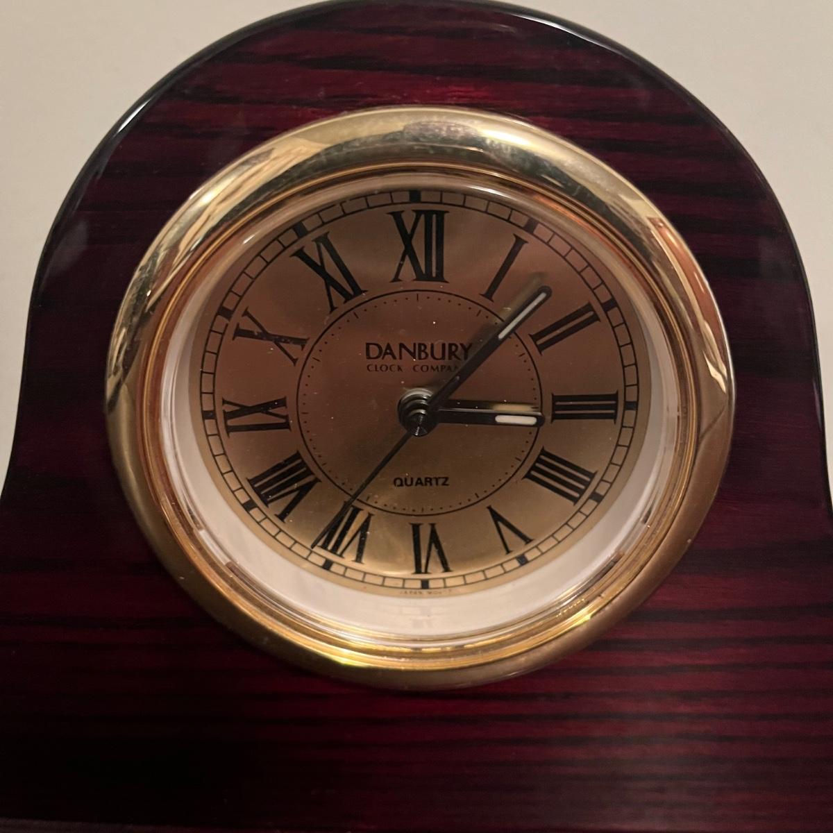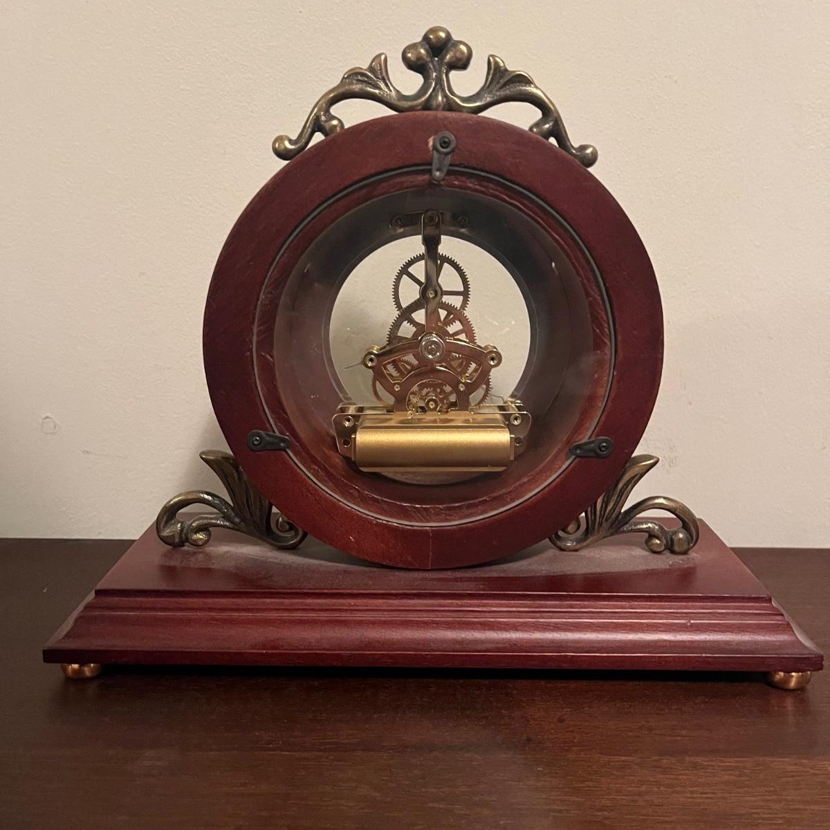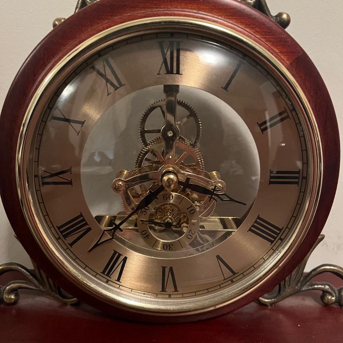 Lot includes a Danbury quartz cloth clock in a wooden body, Elgin quartz clock in a MDF body and a unbranded clock with a wooden base and body. Largest clock measures 4.5” x 10” x 8.5”. We cannot confirm if clocks function or not as they have no batteries to test.