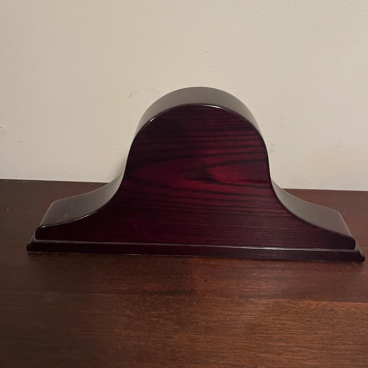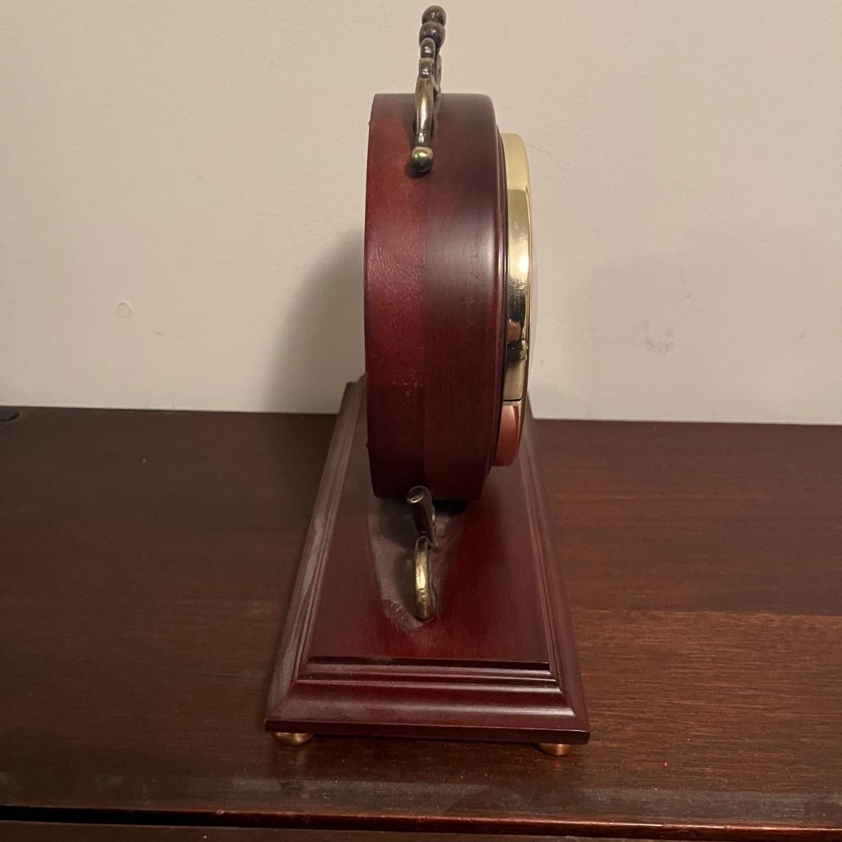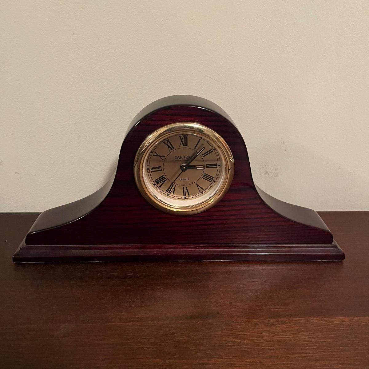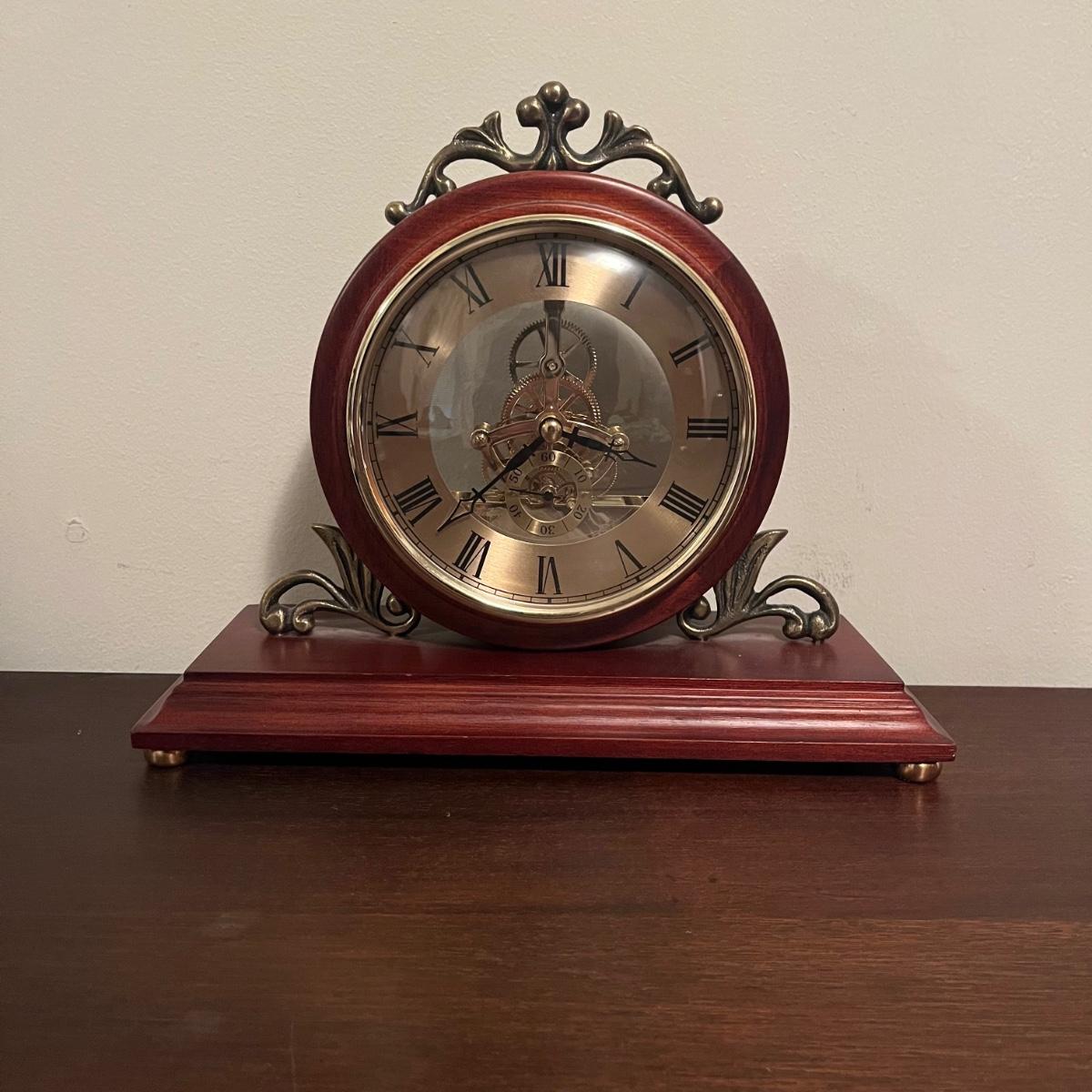 Lot includes a Danbury quartz cloth clock in a wooden body, Elgin quartz clock in a MDF body and a unbranded clock with a wooden base and body. Largest clock measures 4.5” x 10” x 8.5”. We cannot confirm if clocks function or not as they have no batteries to test.