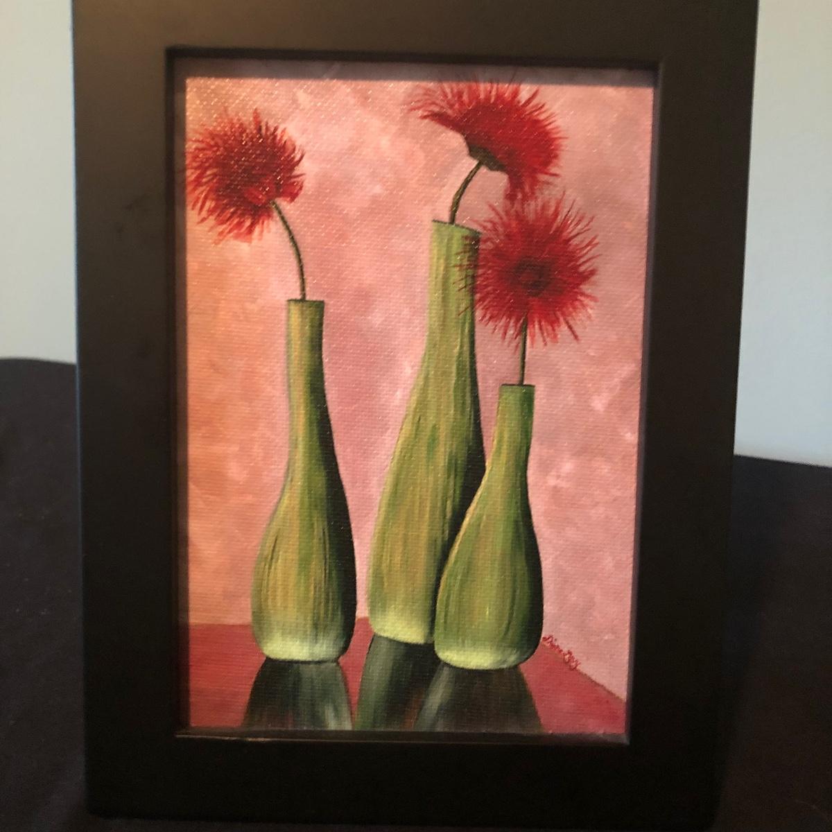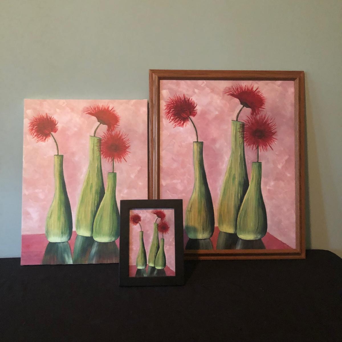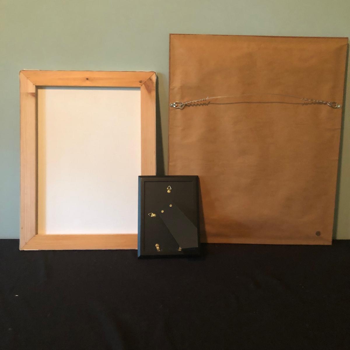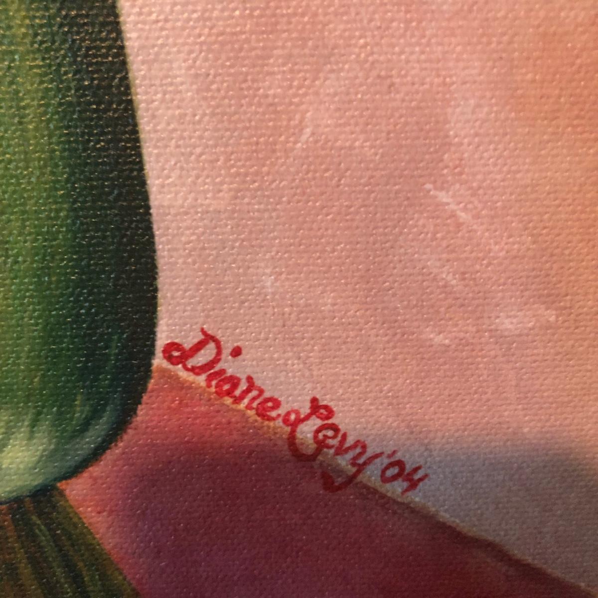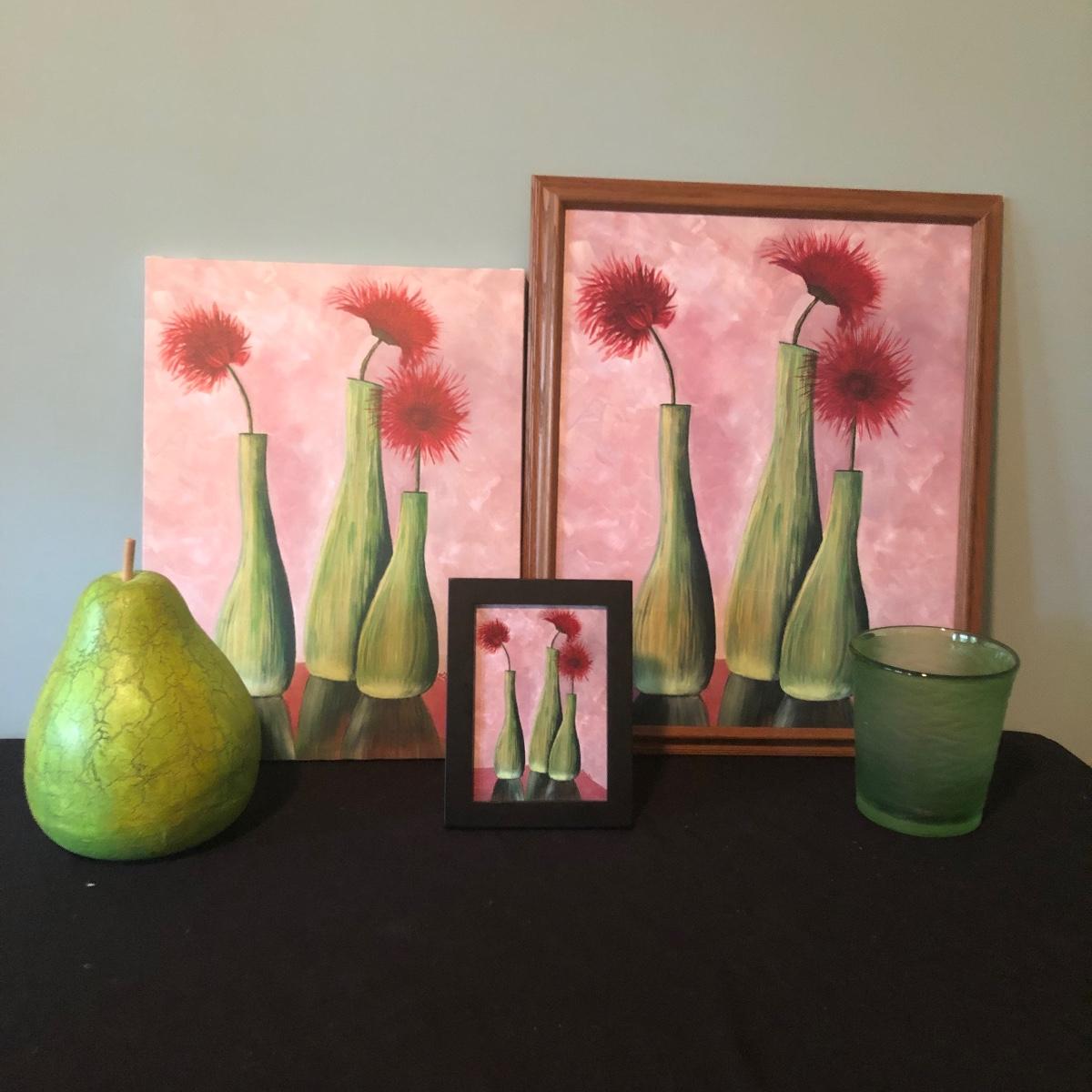 Lot includes three matching pieces in three different sizes with two being signed by artis Diane Levy, decorative pear of unknown material and a glass vase. Largest frame measures 18” x 22”.