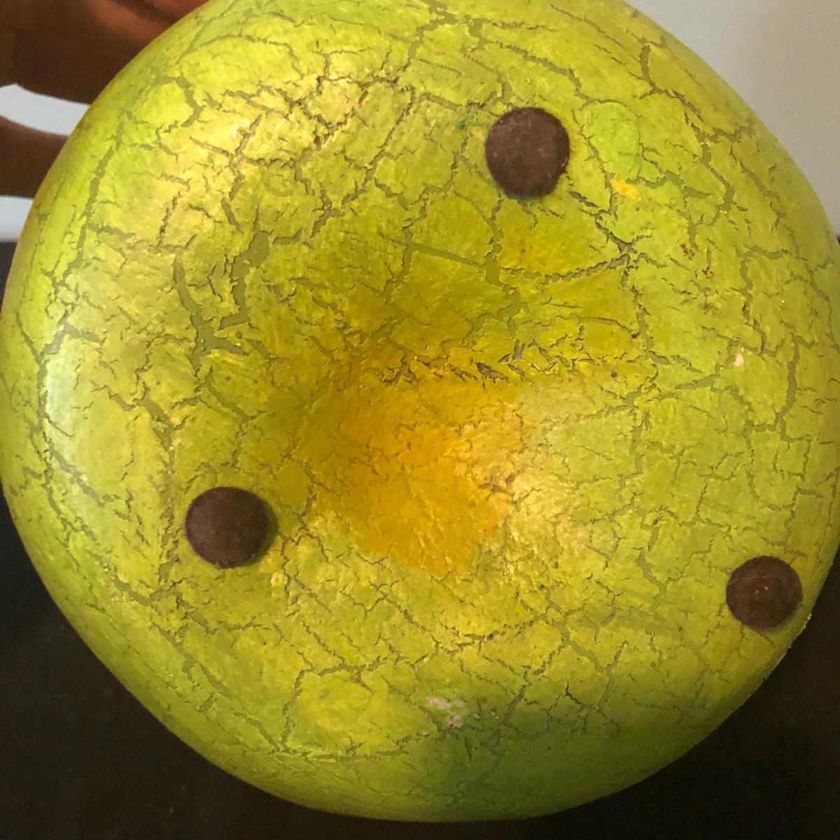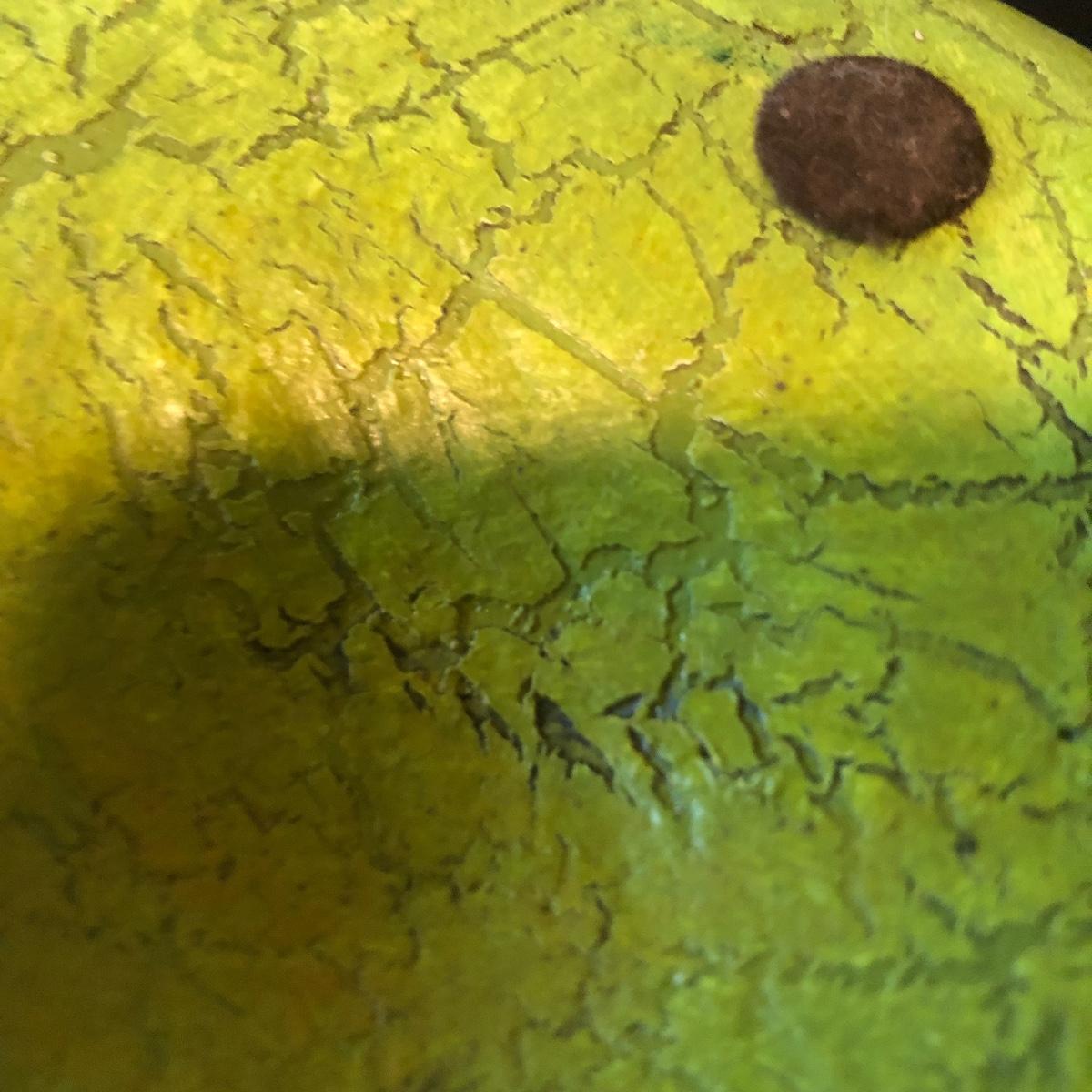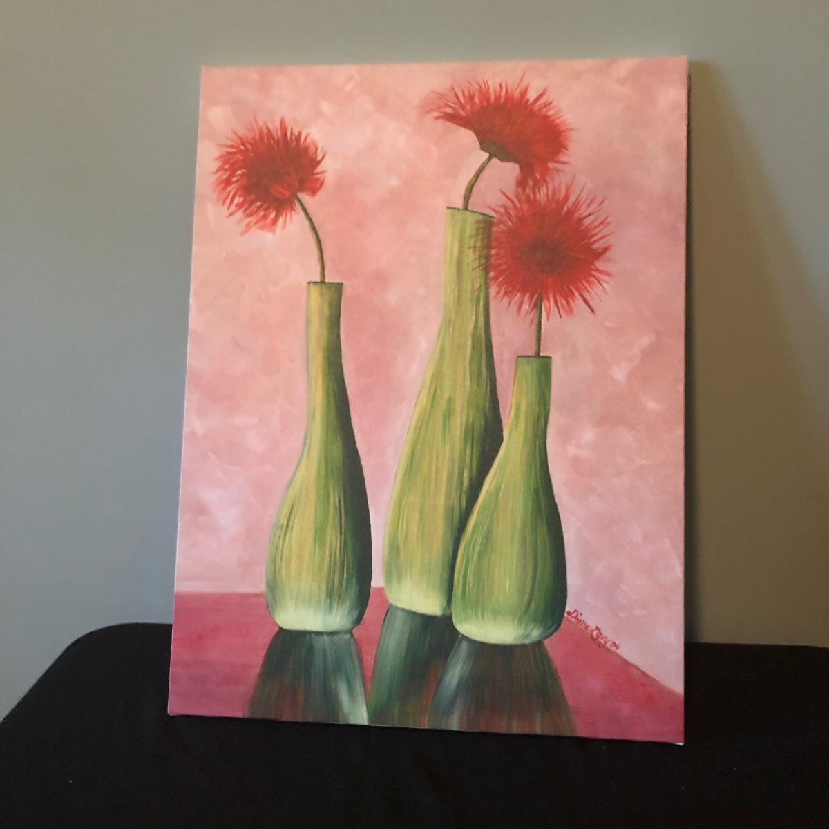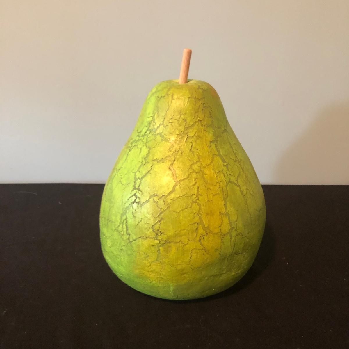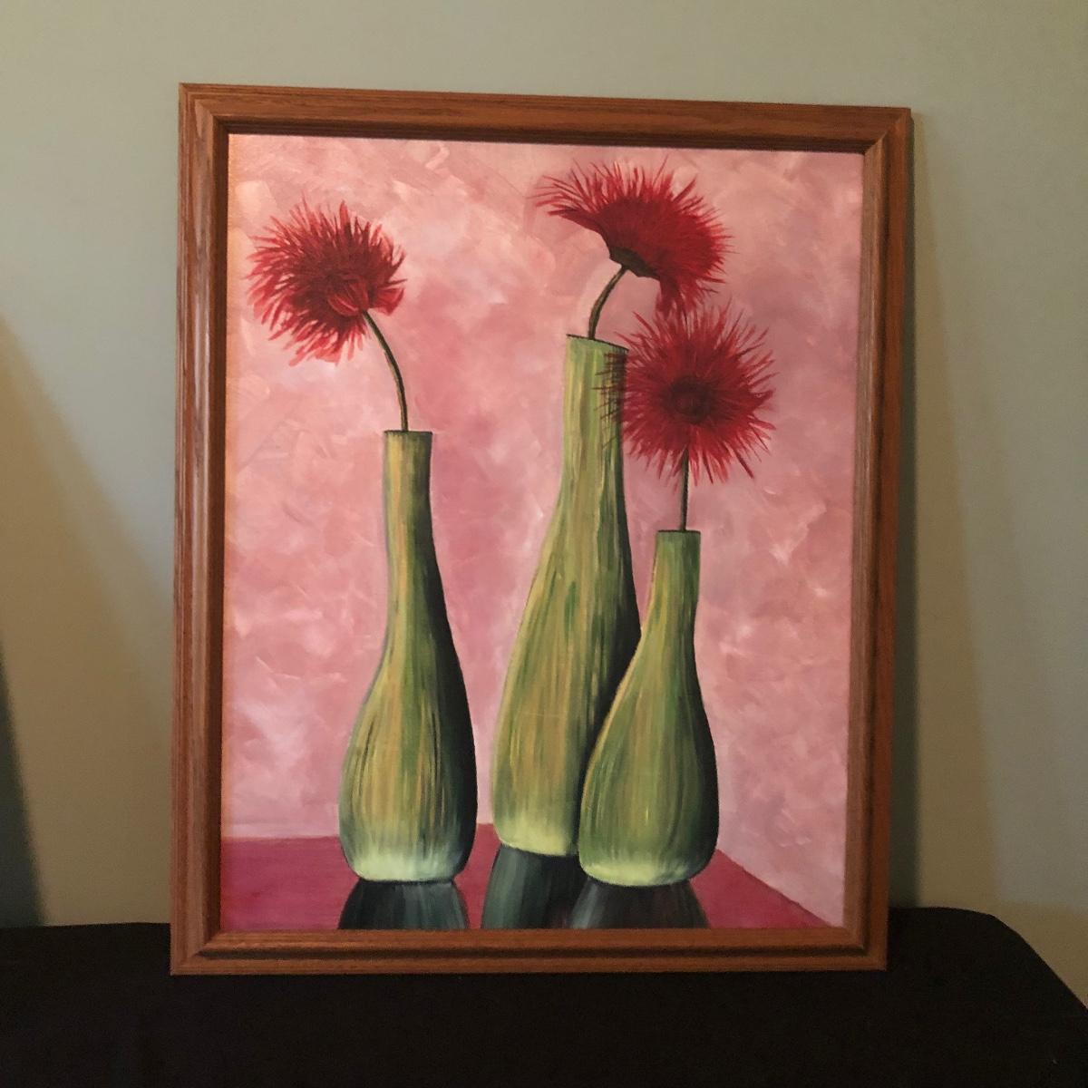 Lot includes three matching pieces in three different sizes with two being signed by artis Diane Levy, decorative pear of unknown material and a glass vase. Largest frame measures 18” x 22”.
