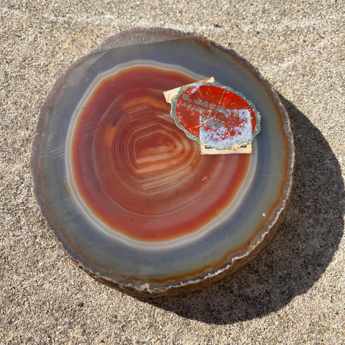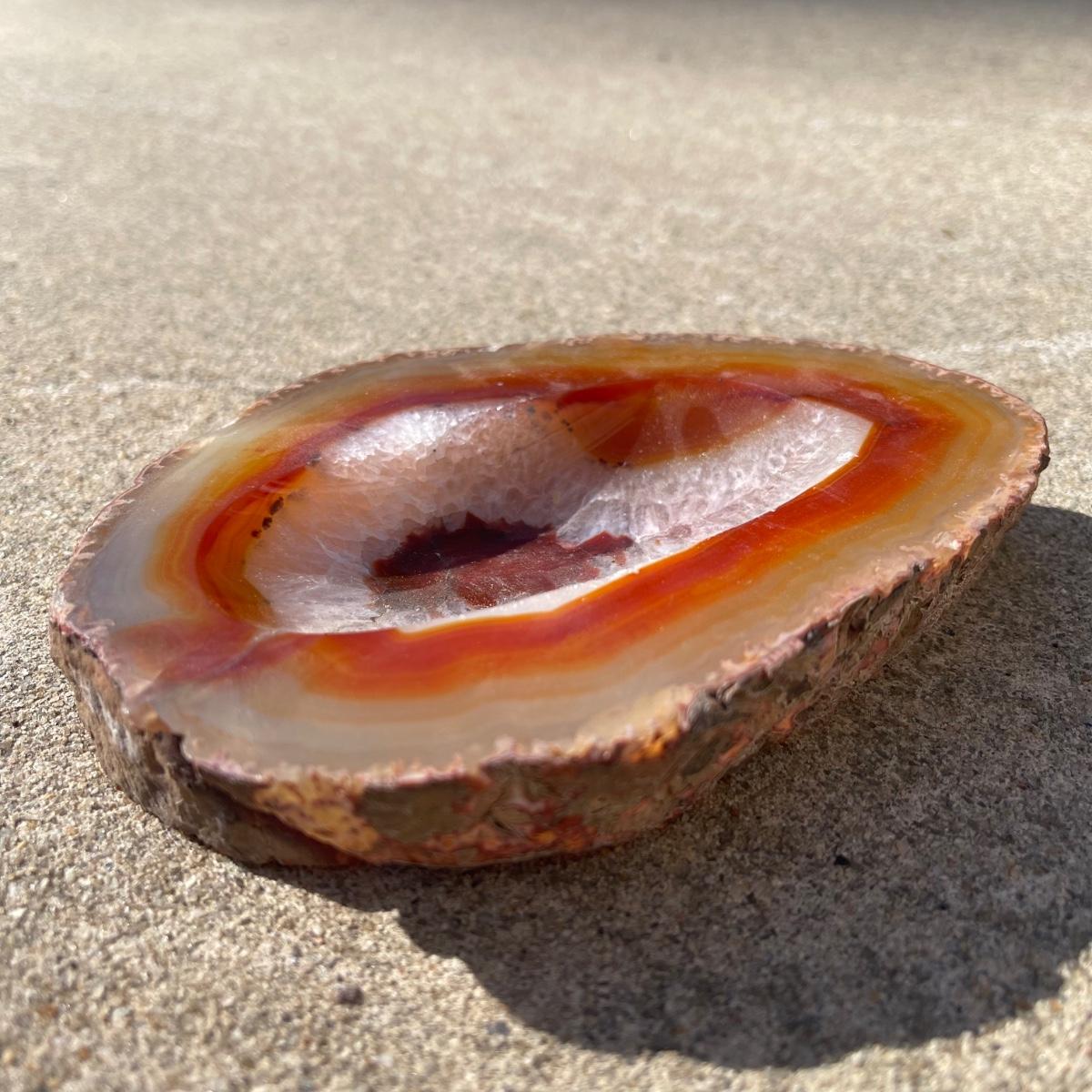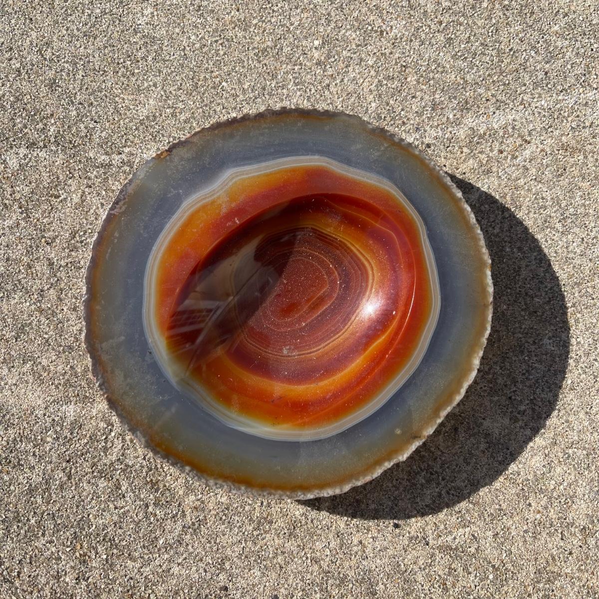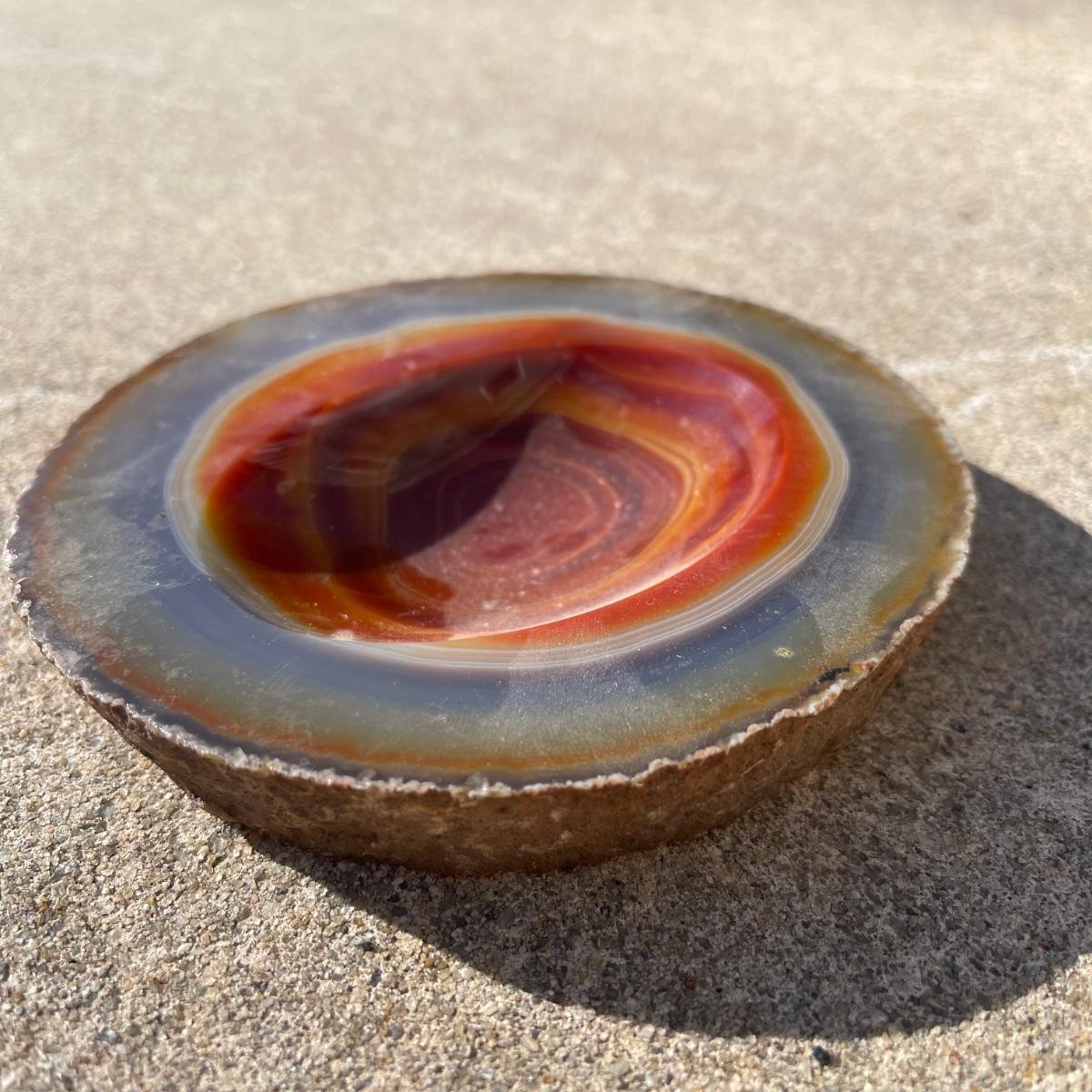 This trio of natural agate stone dishes includes a large grey and white slab that measures 10” at its longest point, a ringed slab with red and white measuring 5” across, and an orange and grey ringed slab of agate measuring 6” across. All three have an ovular dip in the center.