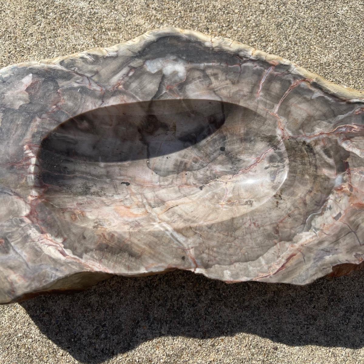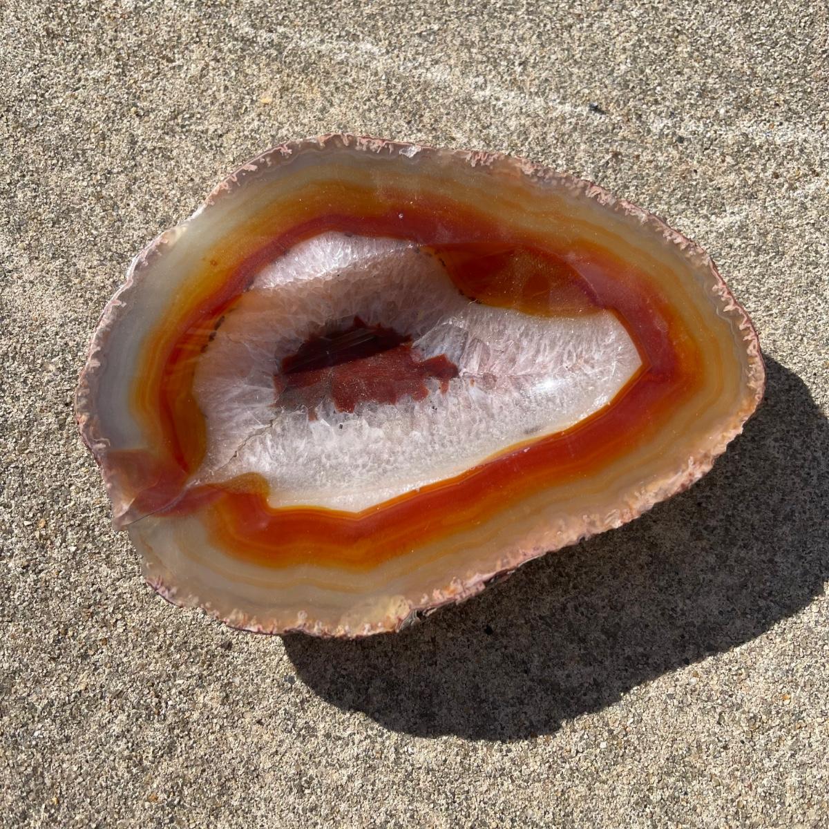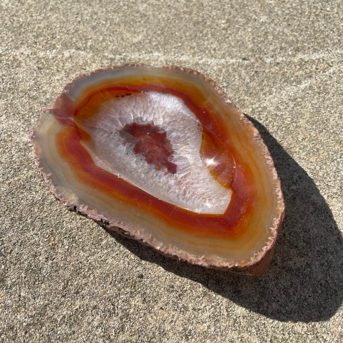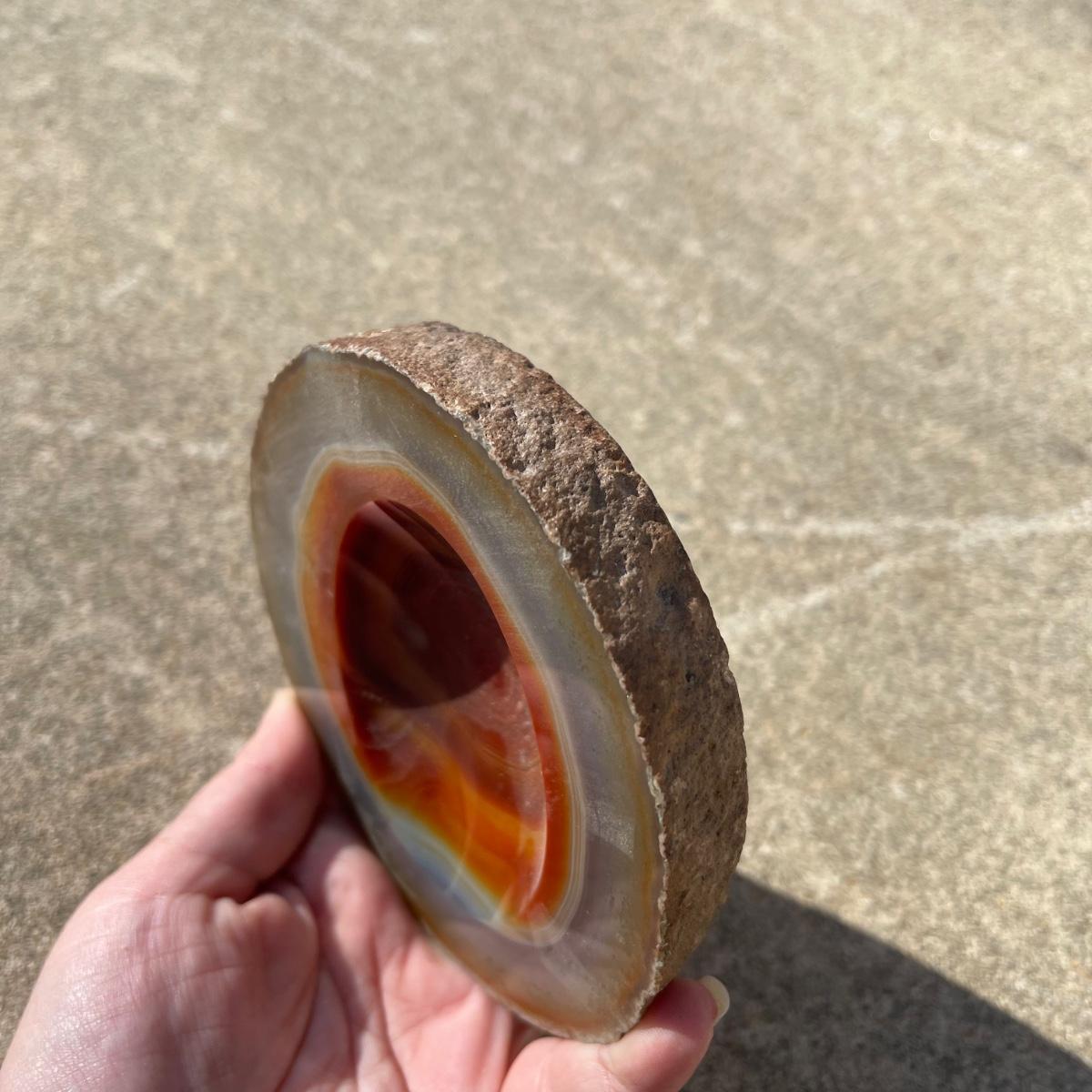This trio of natural agate stone dishes includes a large grey and white slab that measures 10” at its longest point, a ringed slab with red and white measuring 5” across, and an orange and grey ringed slab of agate measuring 6” across. All three have an ovular dip in the center.