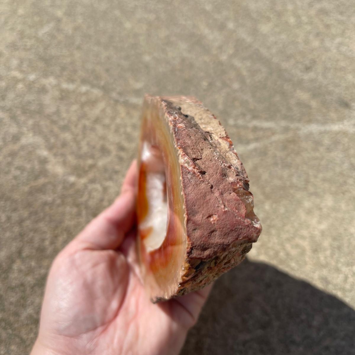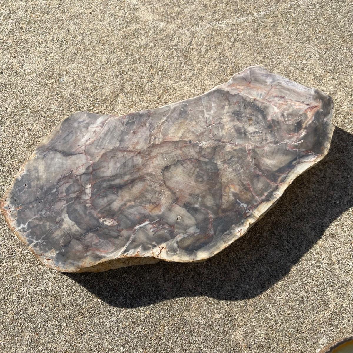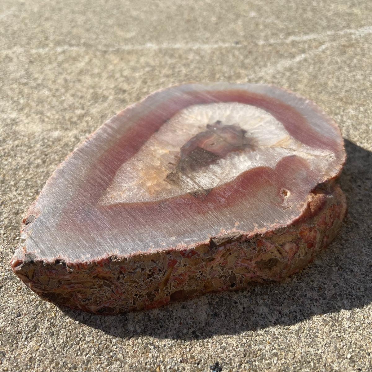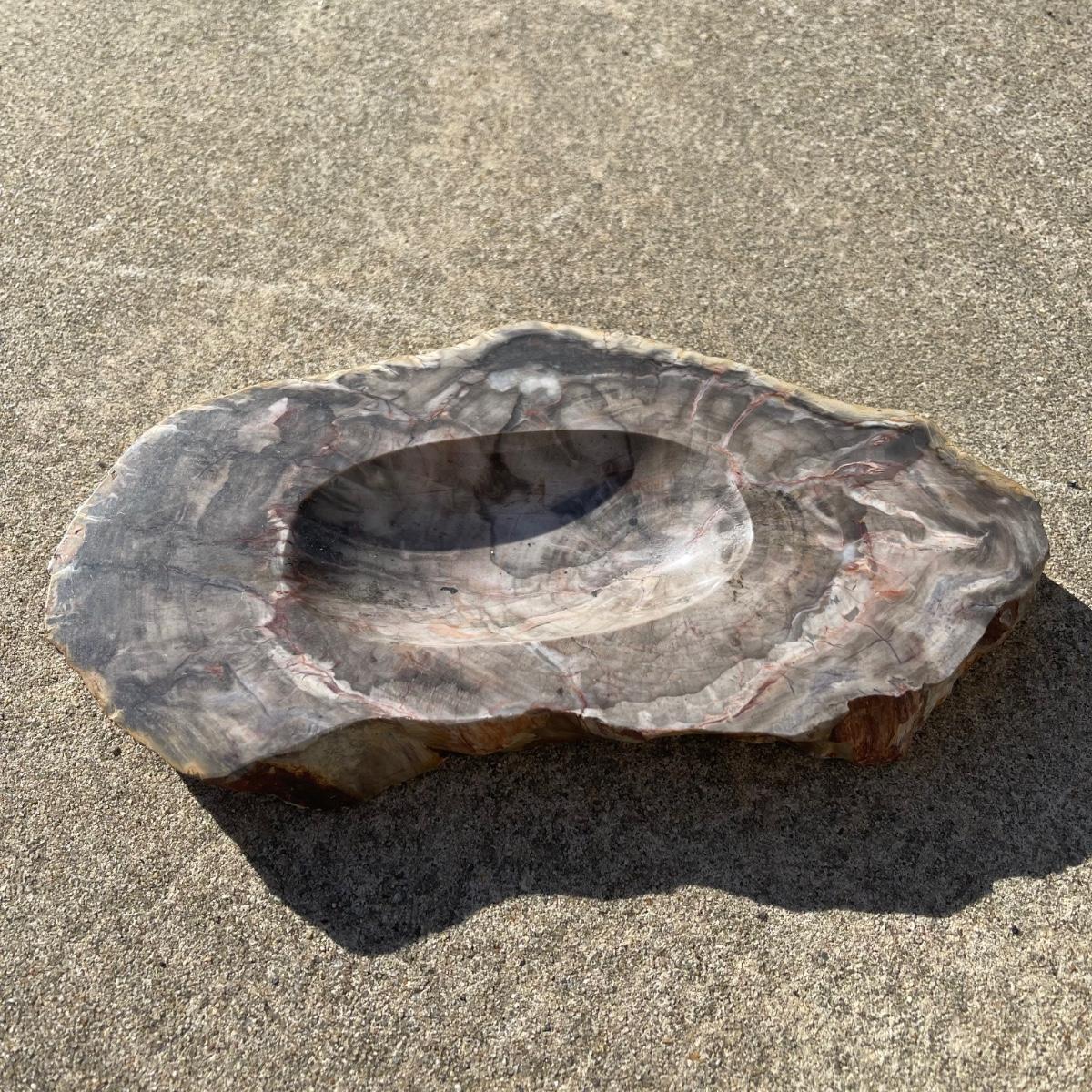 This trio of natural agate stone dishes includes a large grey and white slab that measures 10” at its longest point, a ringed slab with red and white measuring 5” across, and an orange and grey ringed slab of agate measuring 6” across. All three have an ovular dip in the center.