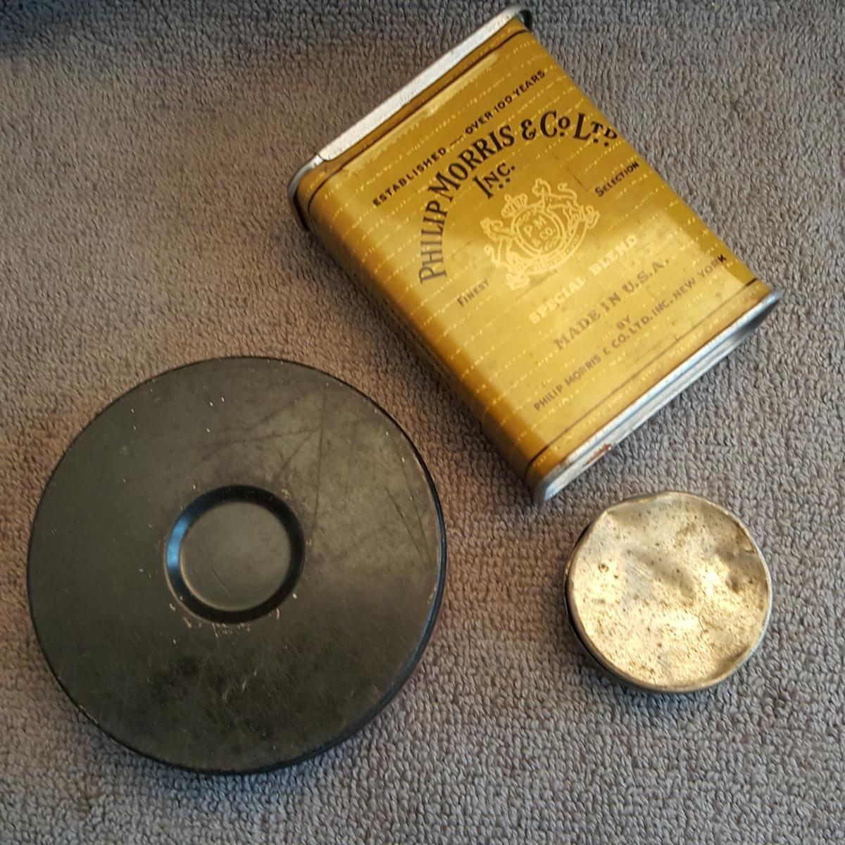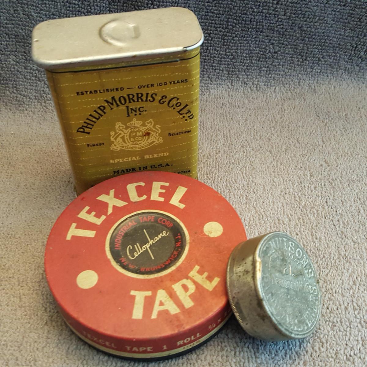This auction lot is for a Trio of Old Tins. The tins include a Philip Morris & Company Tobacco/Cigarette container, a Texcel Cellphane Tape container and a small Dennison Paper Fastener keeper. Where you gonna find 'em.