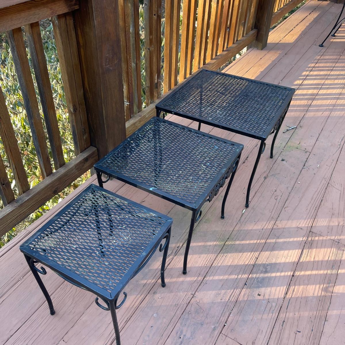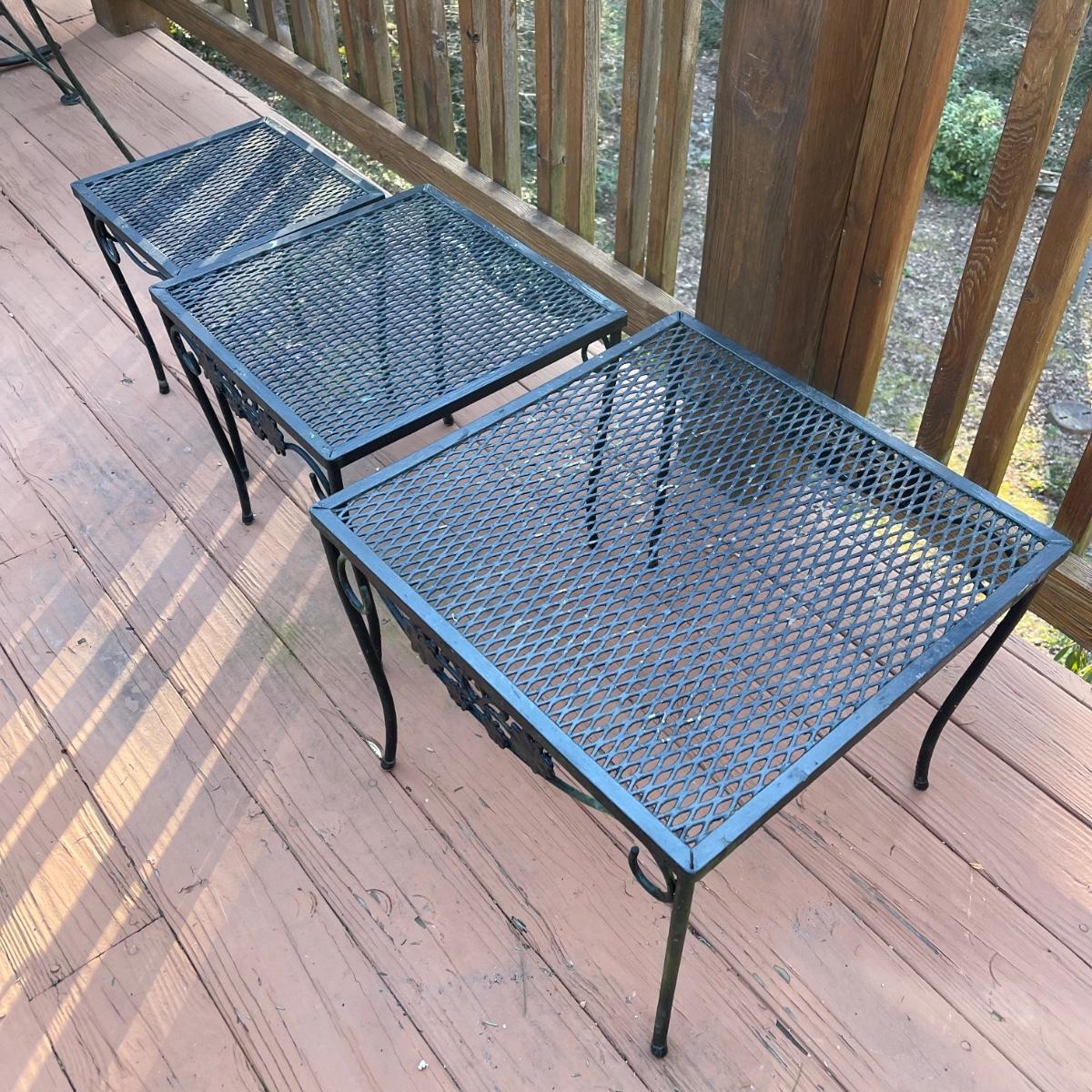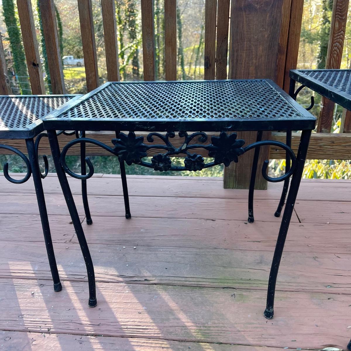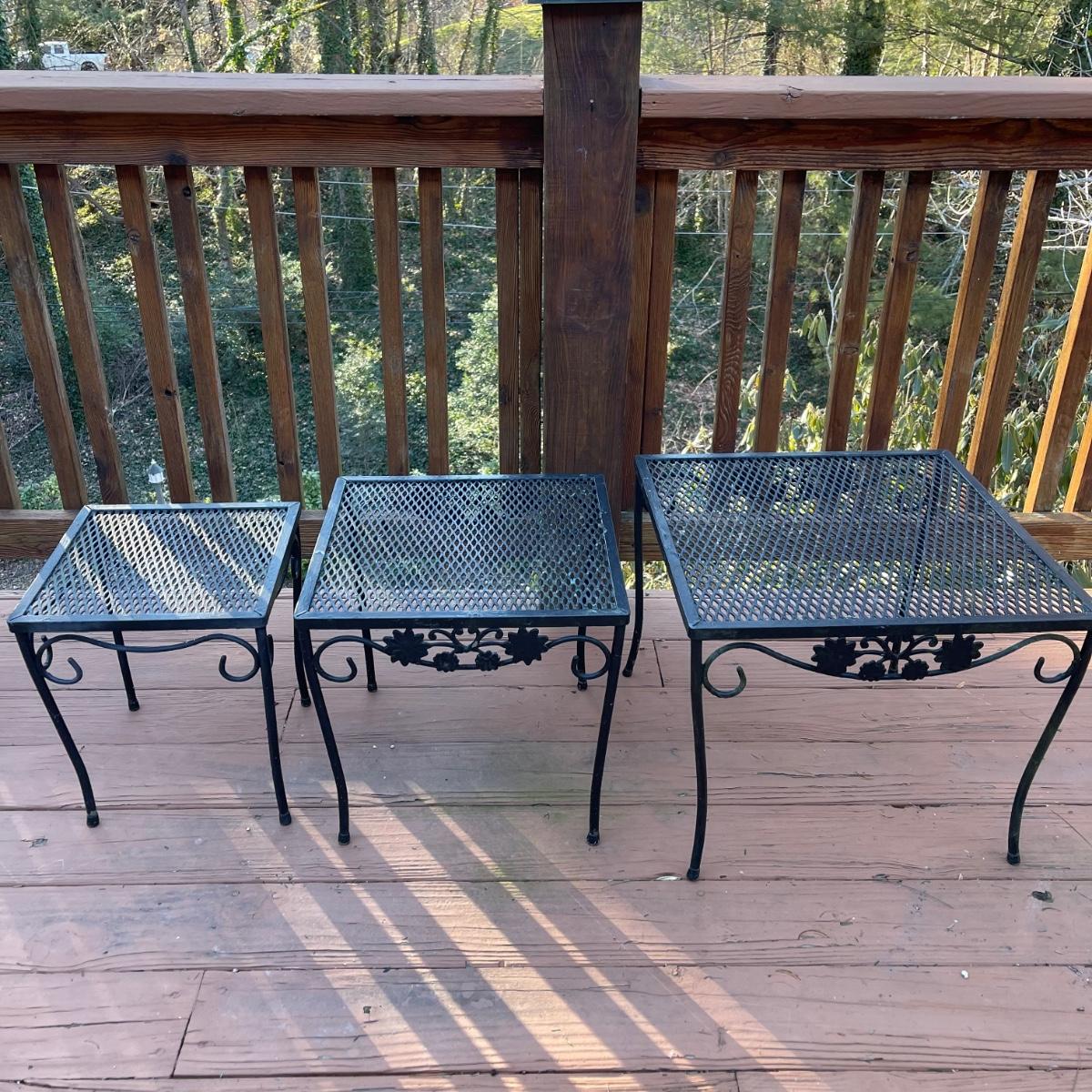 Three metal nesting tables. The smallest is 14” tall and it’s square top is 12.5” x 12.5”. The middle sized one is 15” tall and it’s top is 16” x 16”. The largest is 16” tall and the top is 19.5” x 19.5”. The matching metal chairs and bench are also in the sale.
