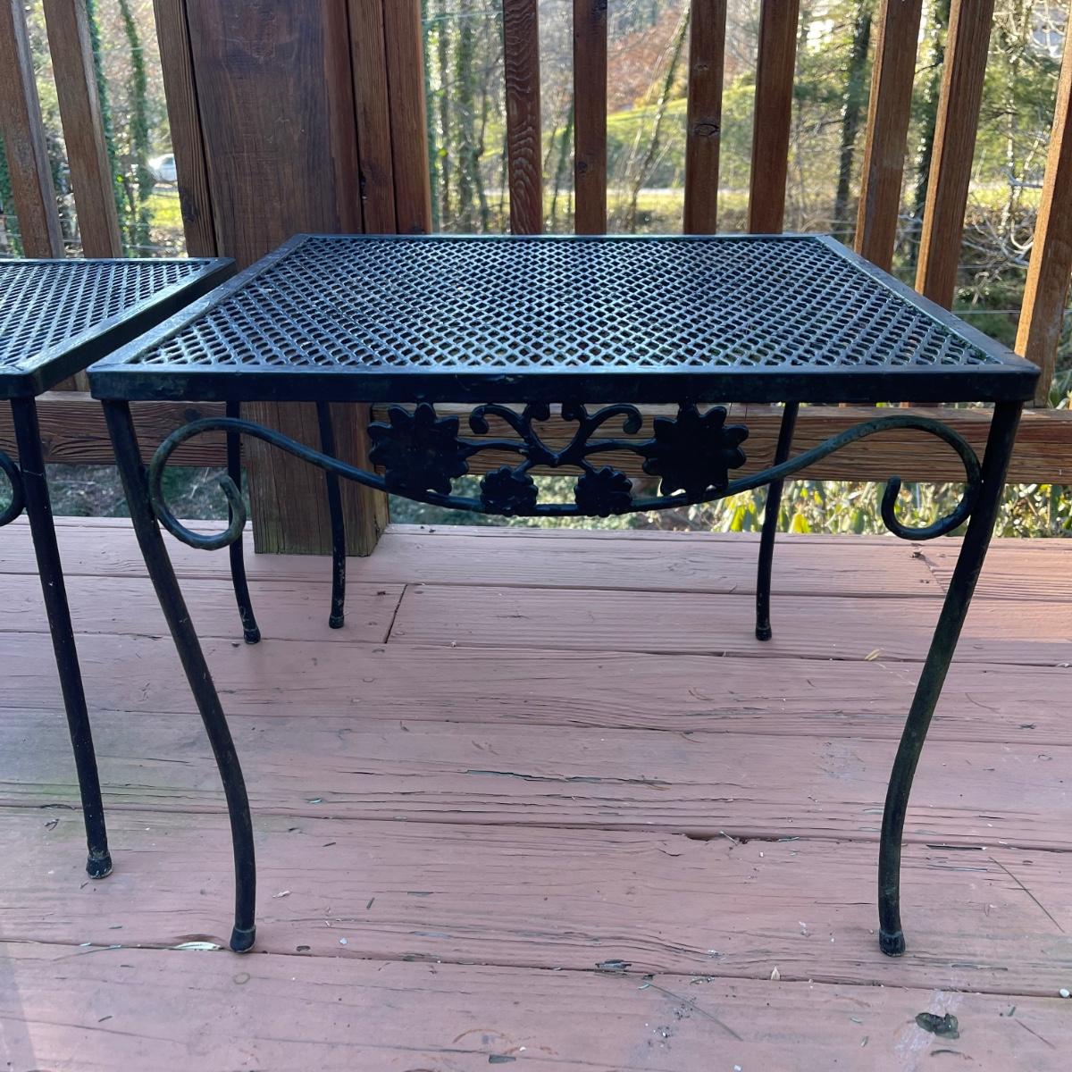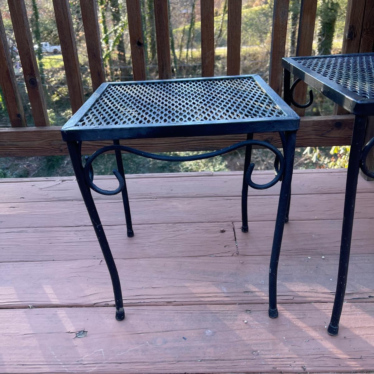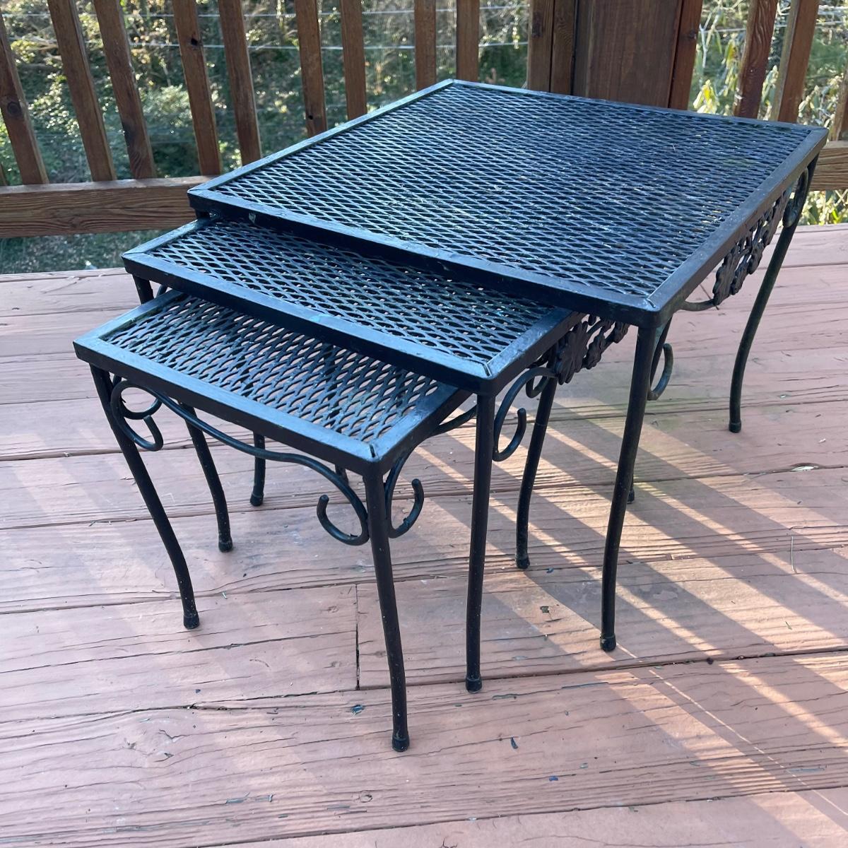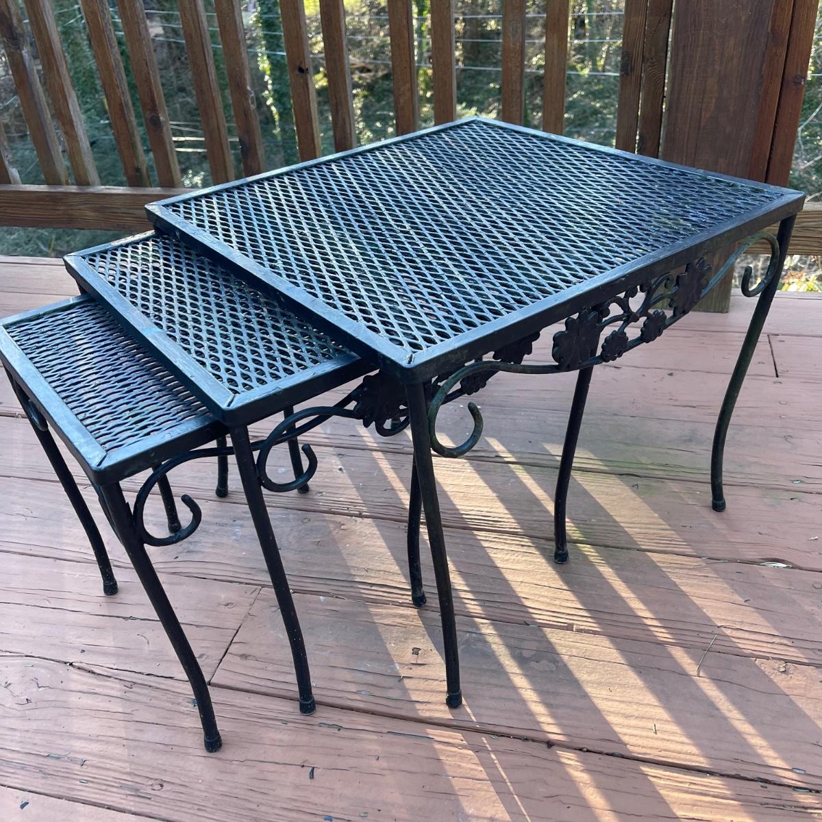 Three metal nesting tables. The smallest is 14” tall and it’s square top is 12.5” x 12.5”. The middle sized one is 15” tall and it’s top is 16” x 16”. The largest is 16” tall and the top is 19.5” x 19.5”. The matching metal chairs and bench are also in the sale.