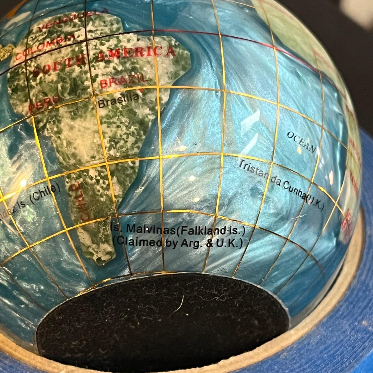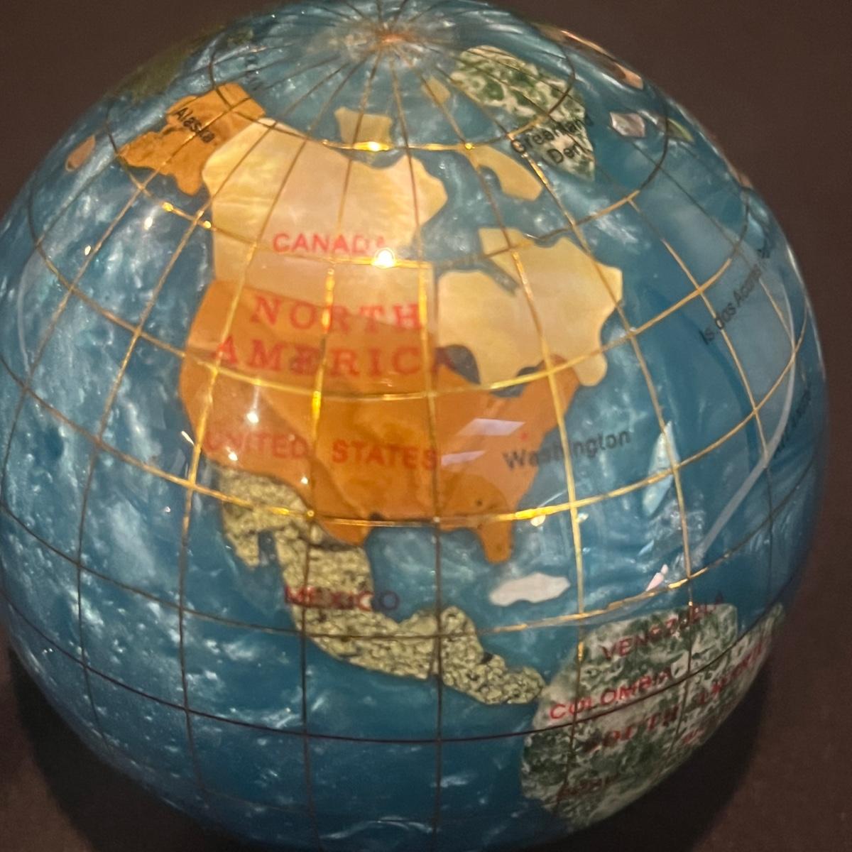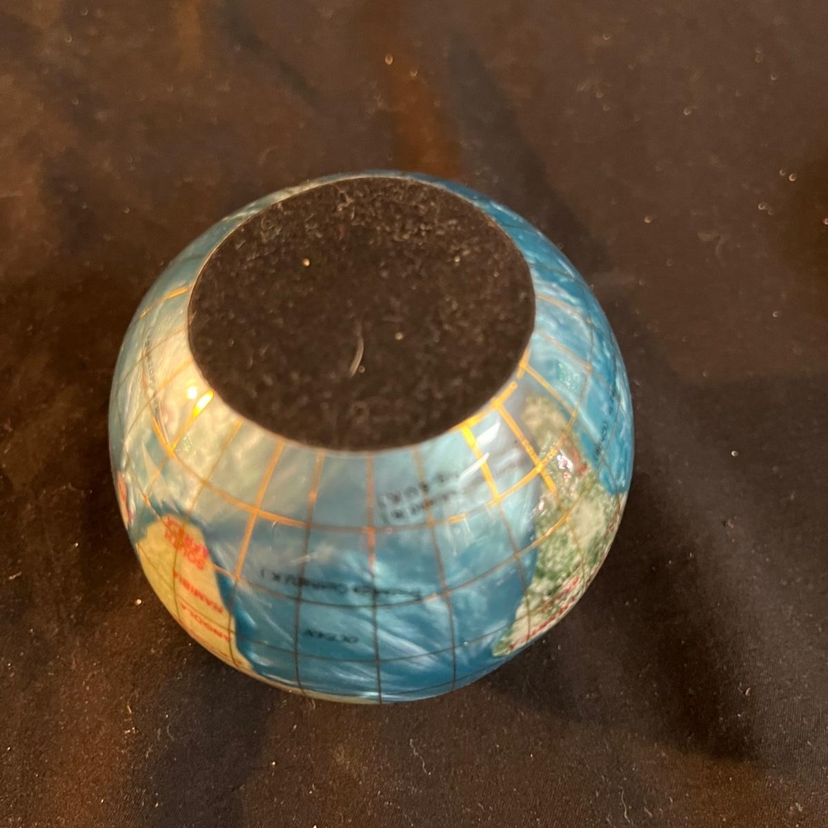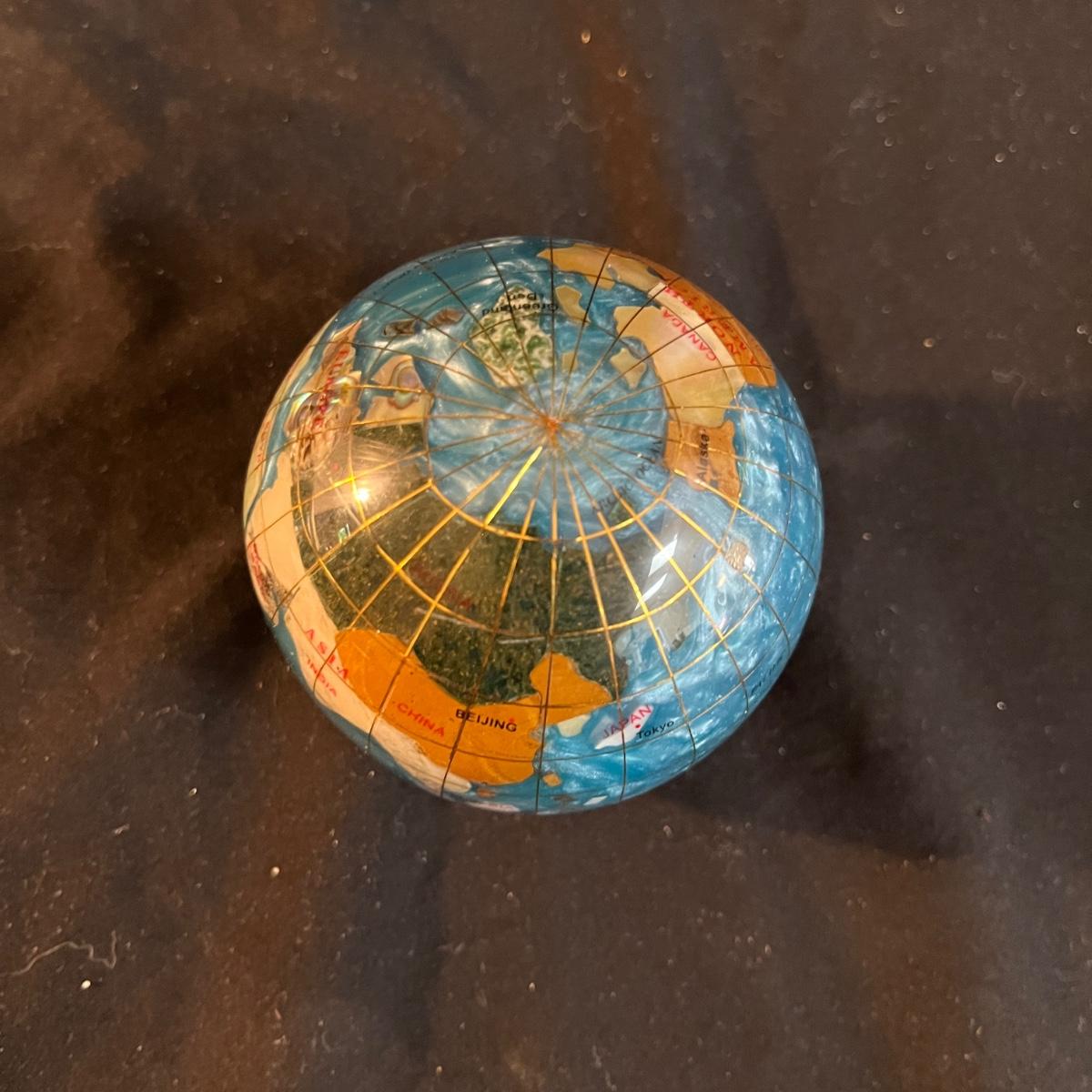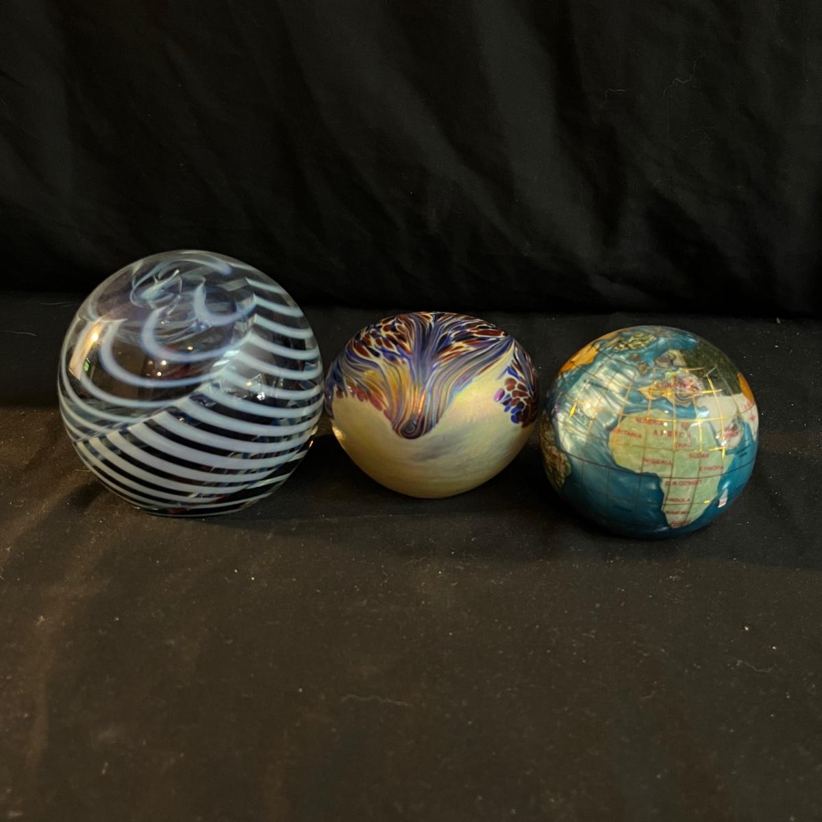 Lot includes a signed Nuance painted glass paperweight, semi precious stone paperweight and a glass paperweight with a unique design inside. Largest paperweight measures 4”D x 4”H.