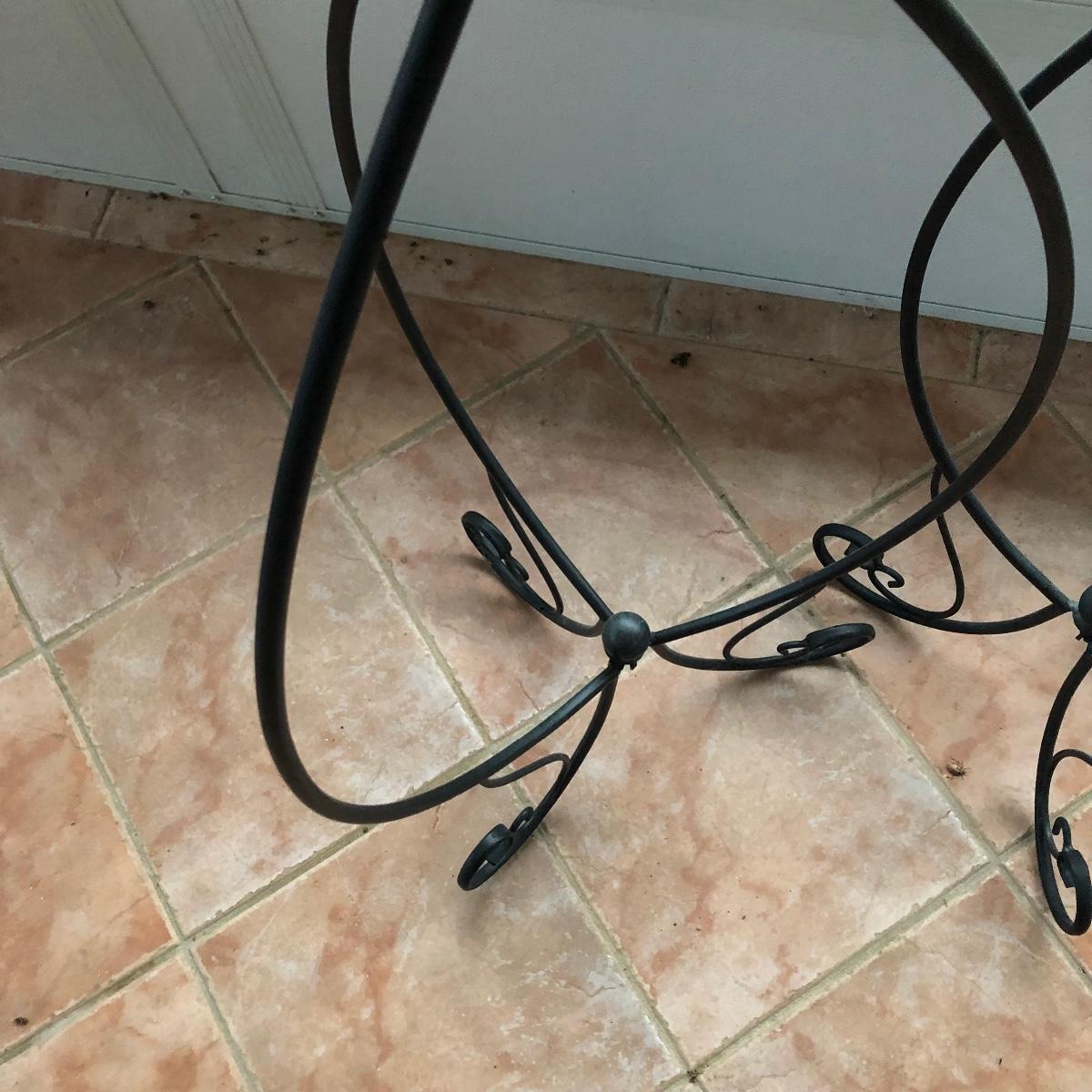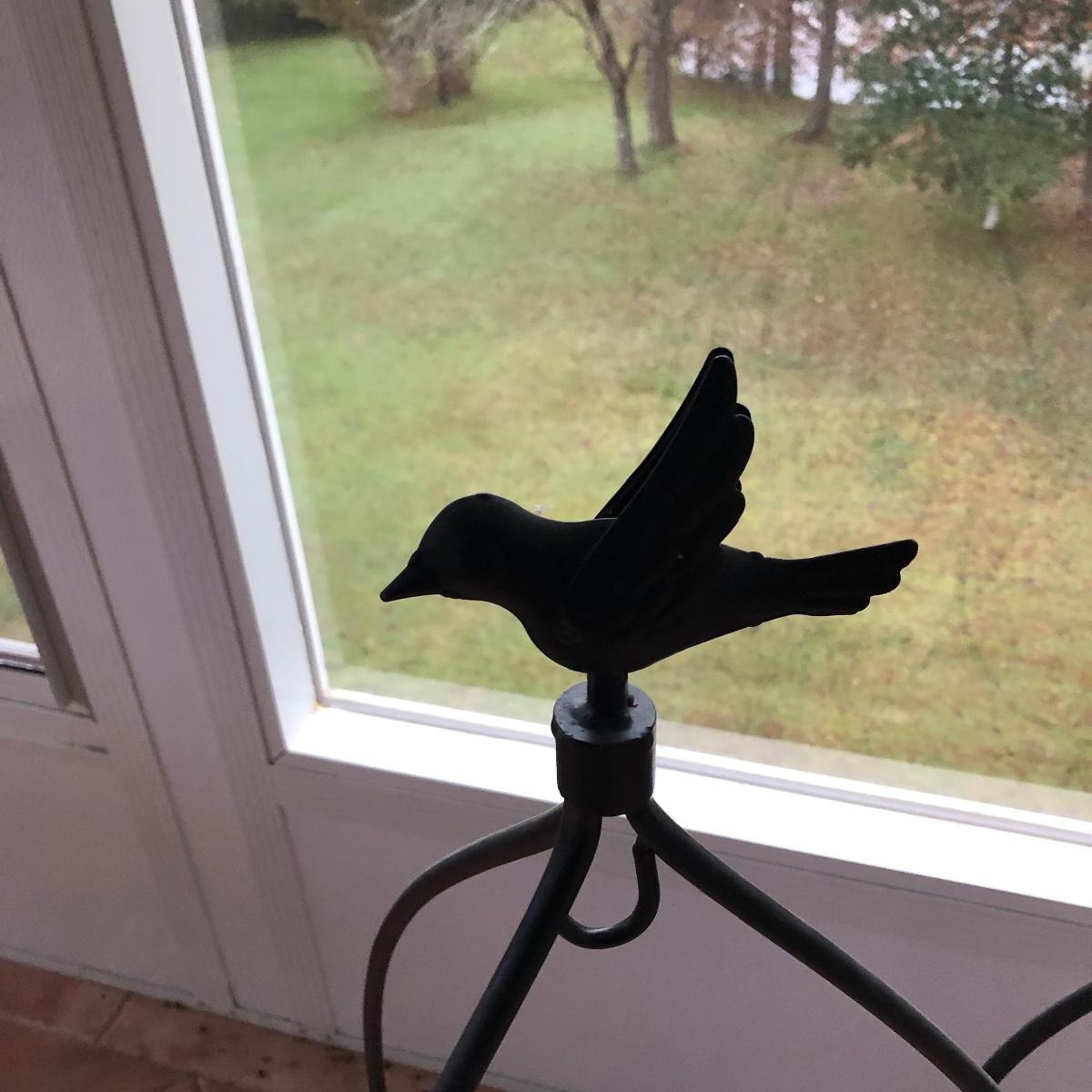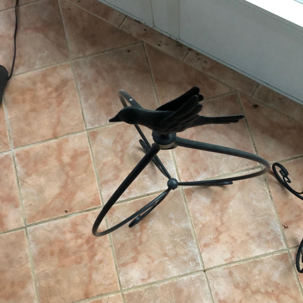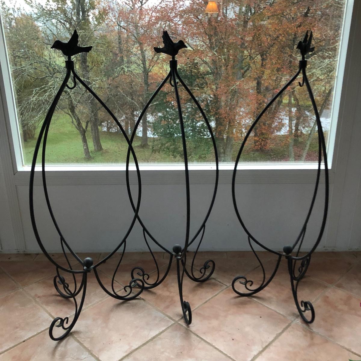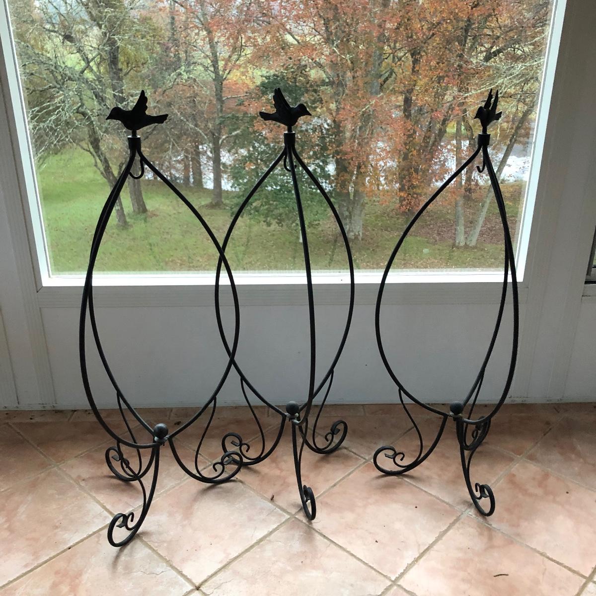 Lot includes three black metal plant hanger stands with a bird on top. Stands measure 14”D x 39” tall.