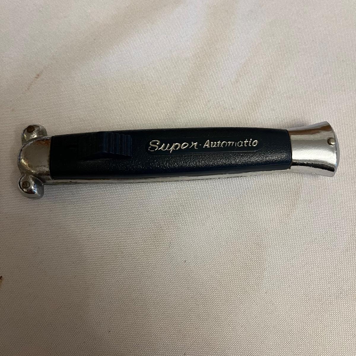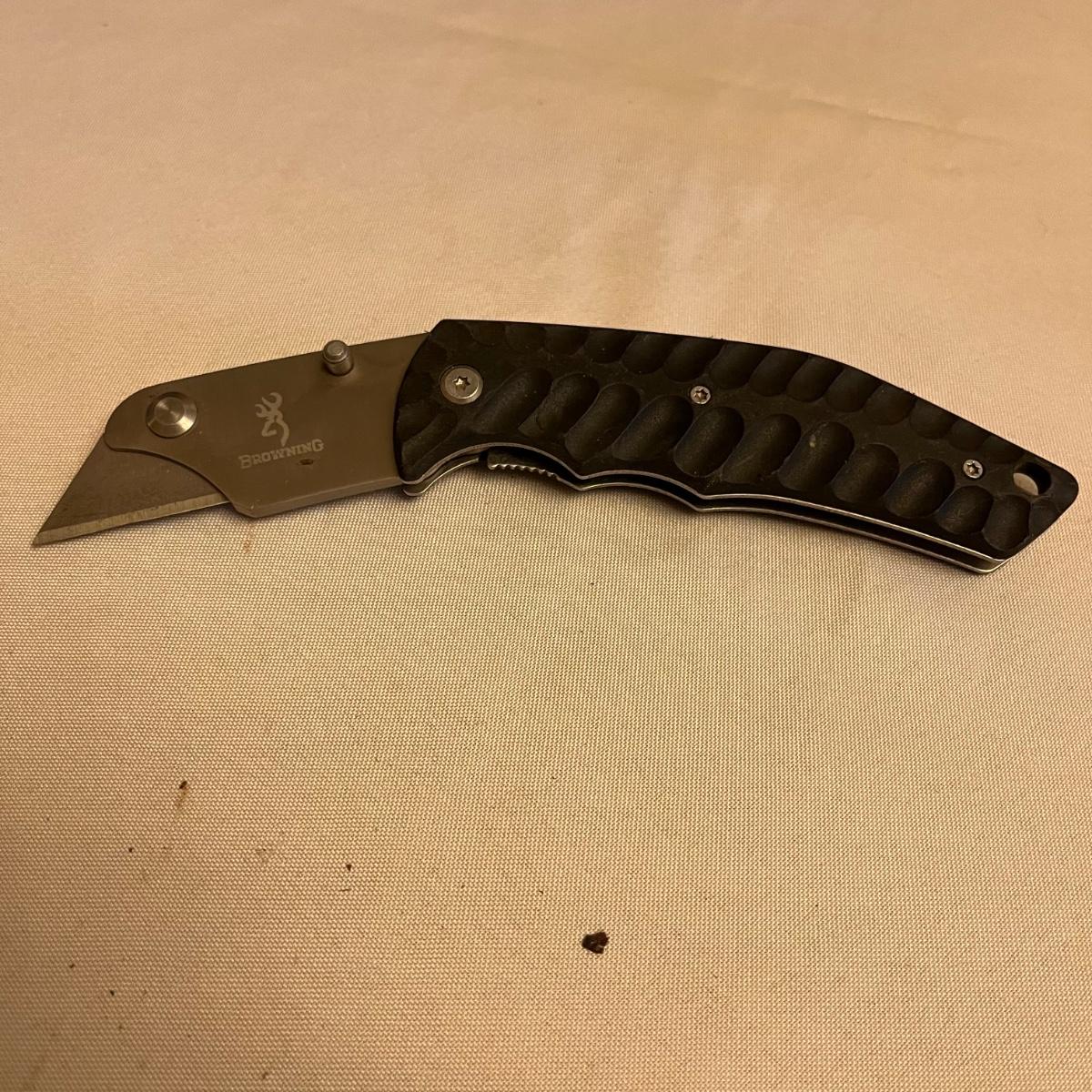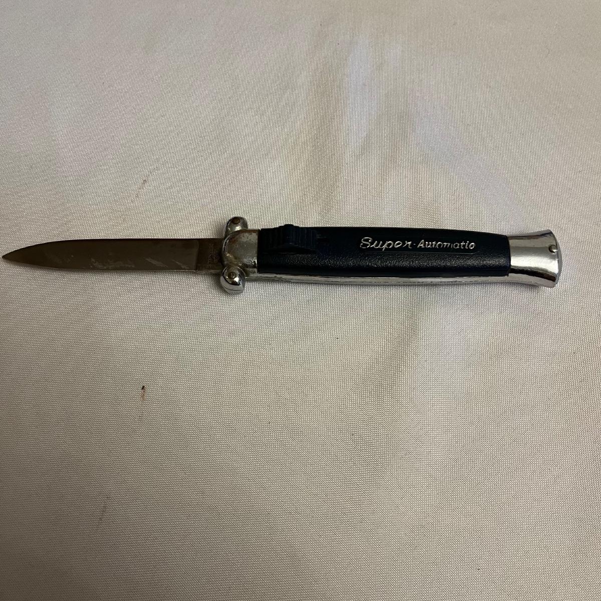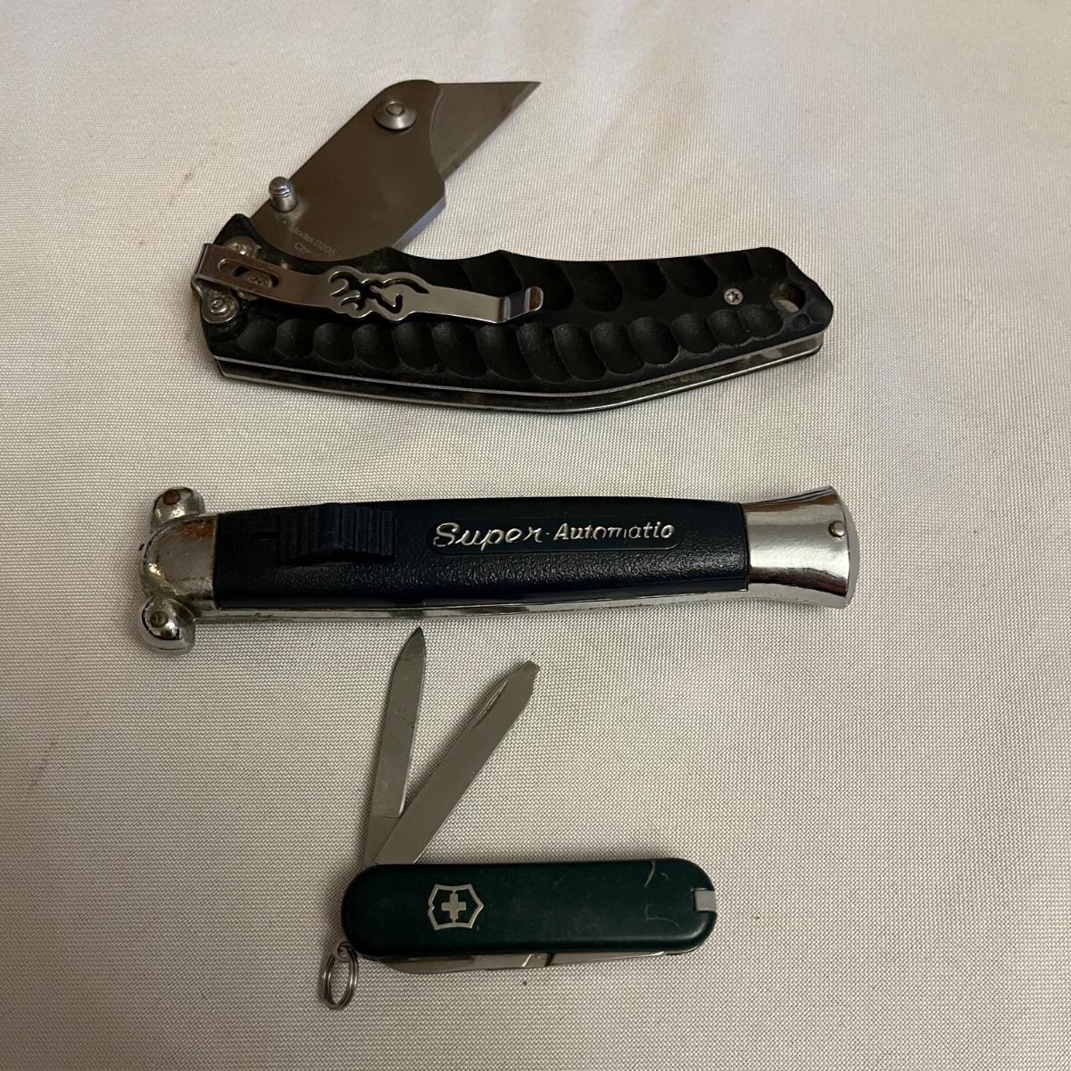 Lot includes a Browning razor blade knife, Victornox Swiss Army knife, and a Super Automatic knife that measures 8” when open.