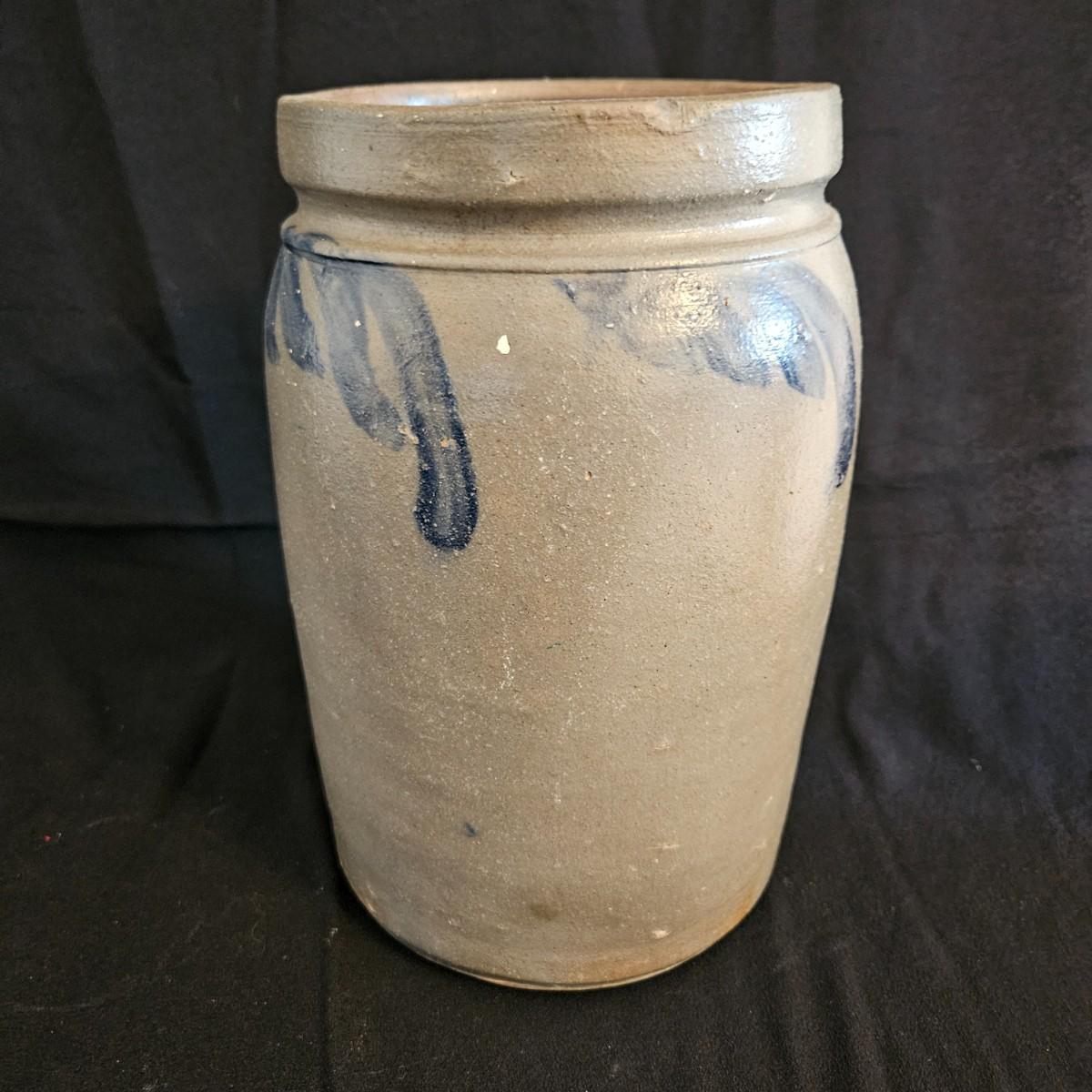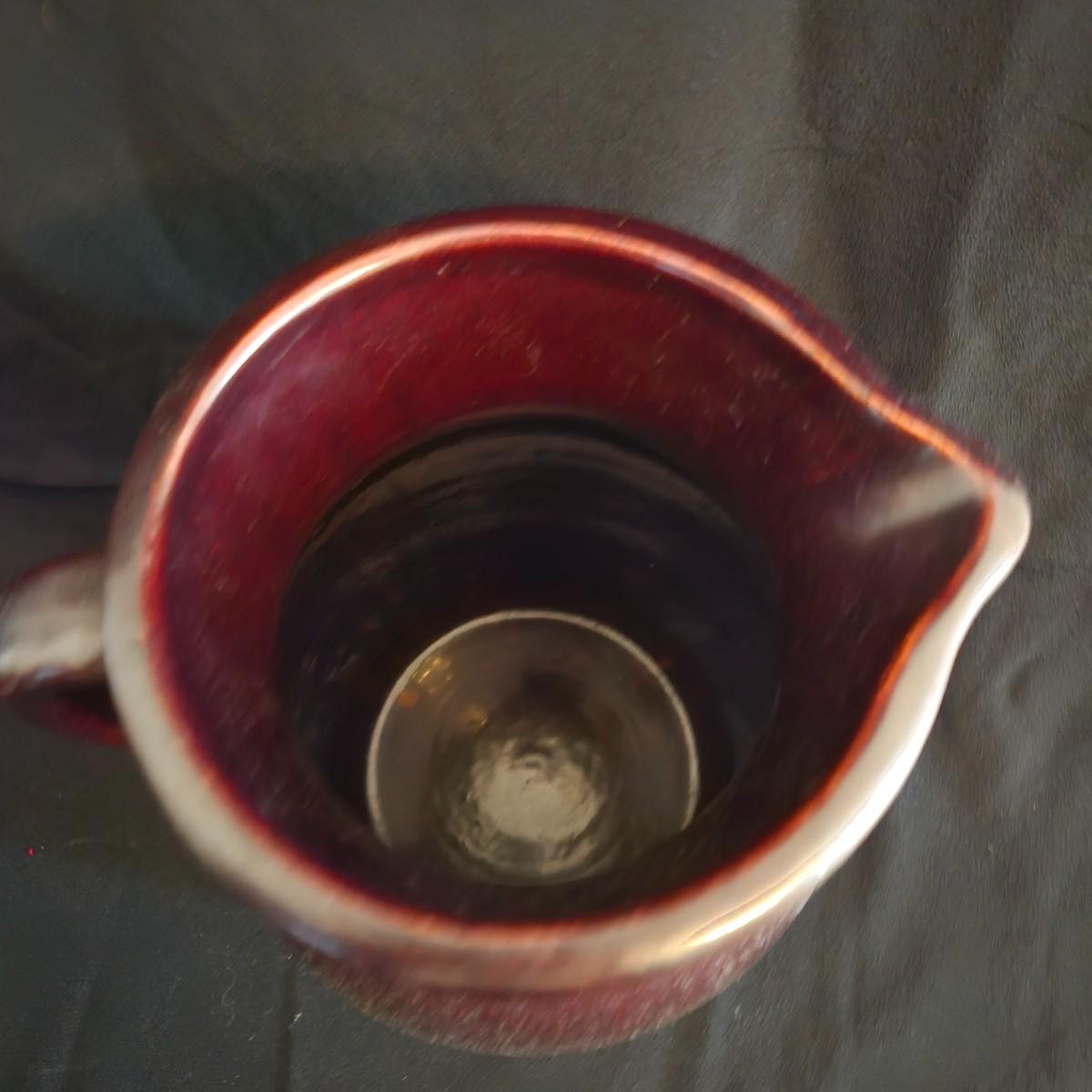 A trio of pottery pieces that includes a large pitcher, a small pitcher and a crock. The large pitcher measures approximately 7"D x 10"H. Shipping available