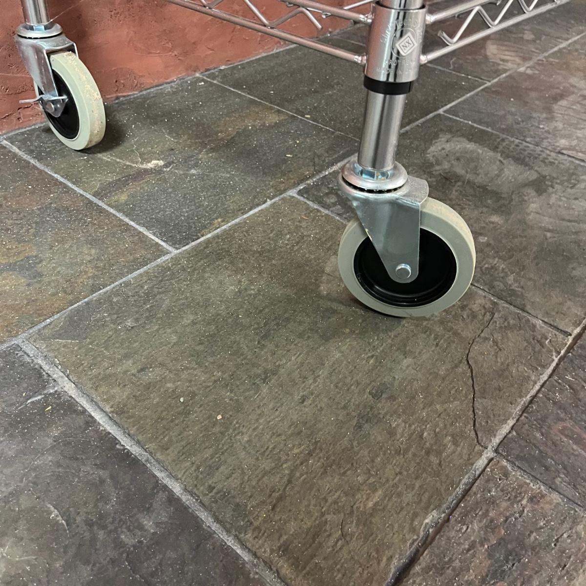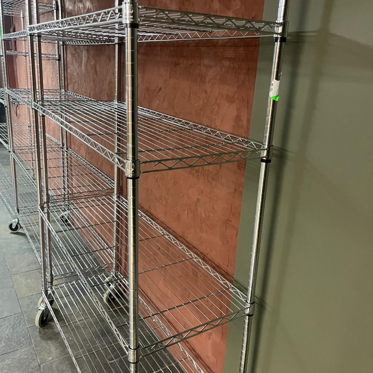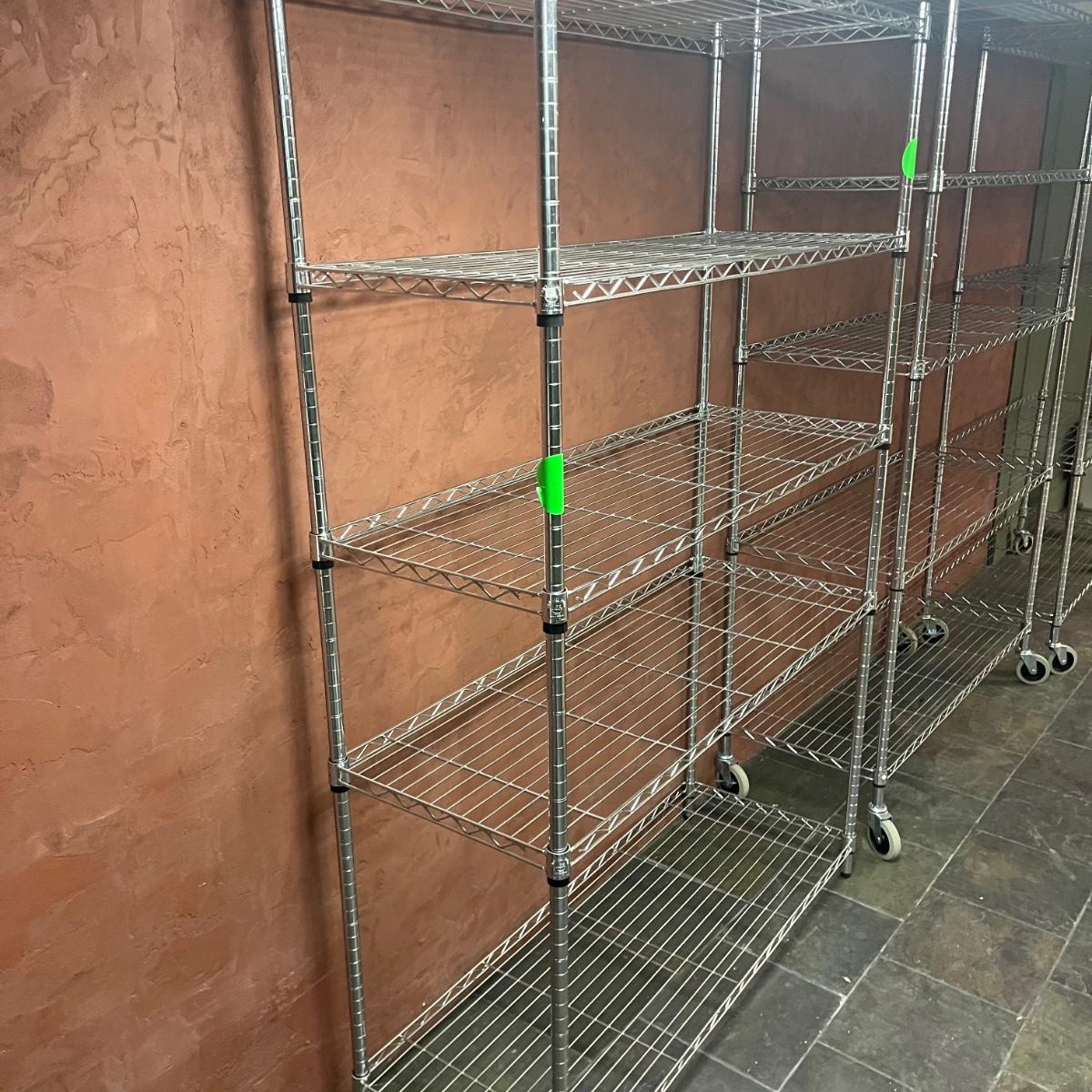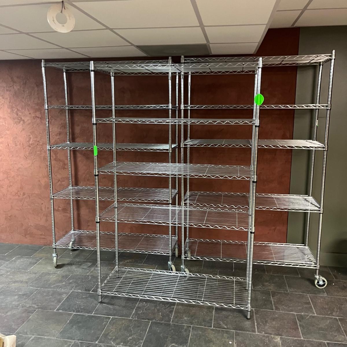 Lot includes three Shelf Tech System chrome shelving units with five adjustable shelves on each unit. Two units have wheels and measure 18” x 48” x 79”. There are some stickers stuck on the shelves that could leave residue if removed.