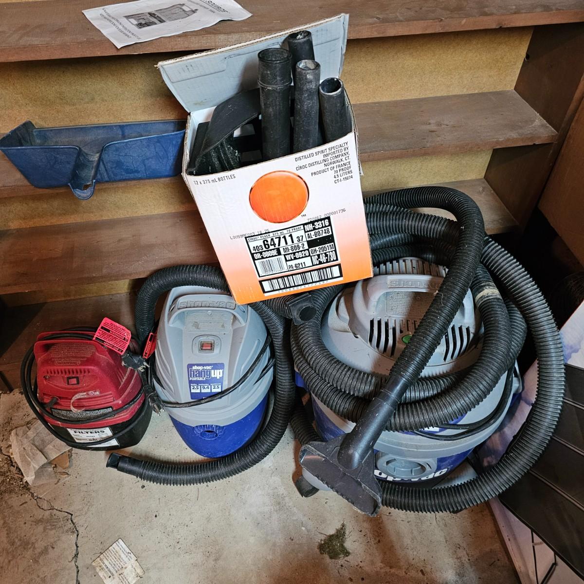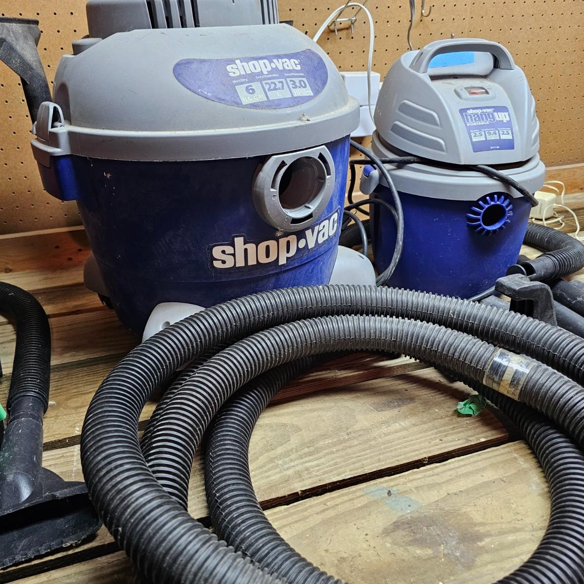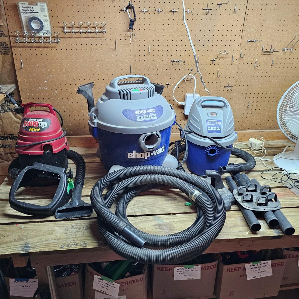 Three different sizes of Shop Vac brand vacuums. Two hang up style and one floor vac. Each has it's own hose and there are some additional accessories. Smallest item is a mini hang-up, measures 9" x 10" x 13"H, has hanging bracket for wall mount. Mid size unit is also wall mount, is 2.5gal capacity, measures 10 " x 13" x 15" H. Largest unit is a 6gal capacity, measures 16" x 19" x 19"H, has 14 foot hose. There arecalso four 14" tubes for extended reach. All units powered on when plugged in. See photos for details. Local pickup only.