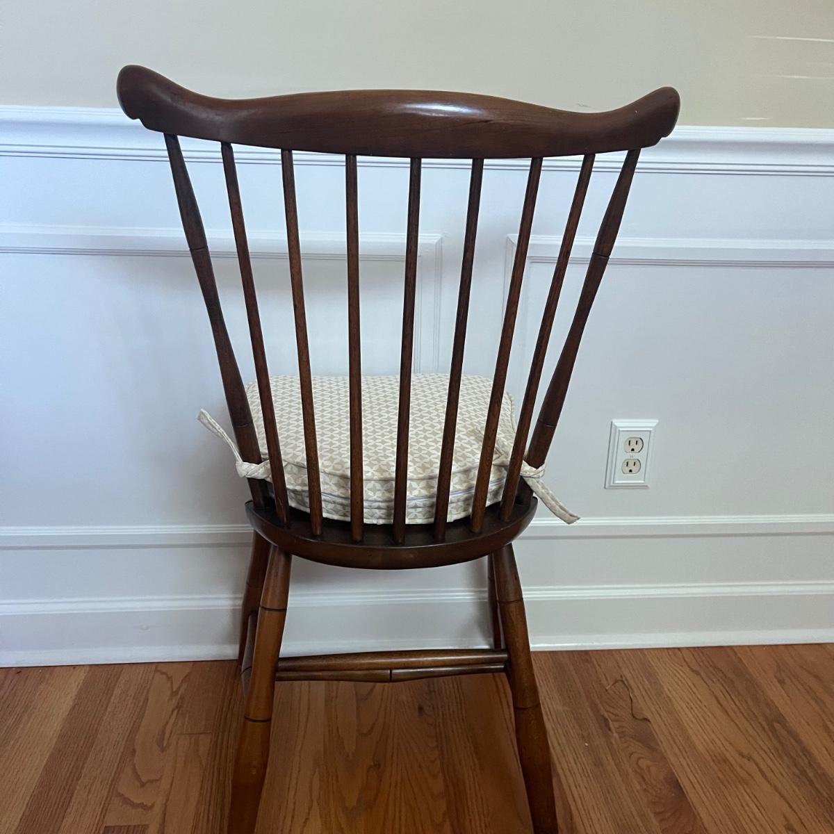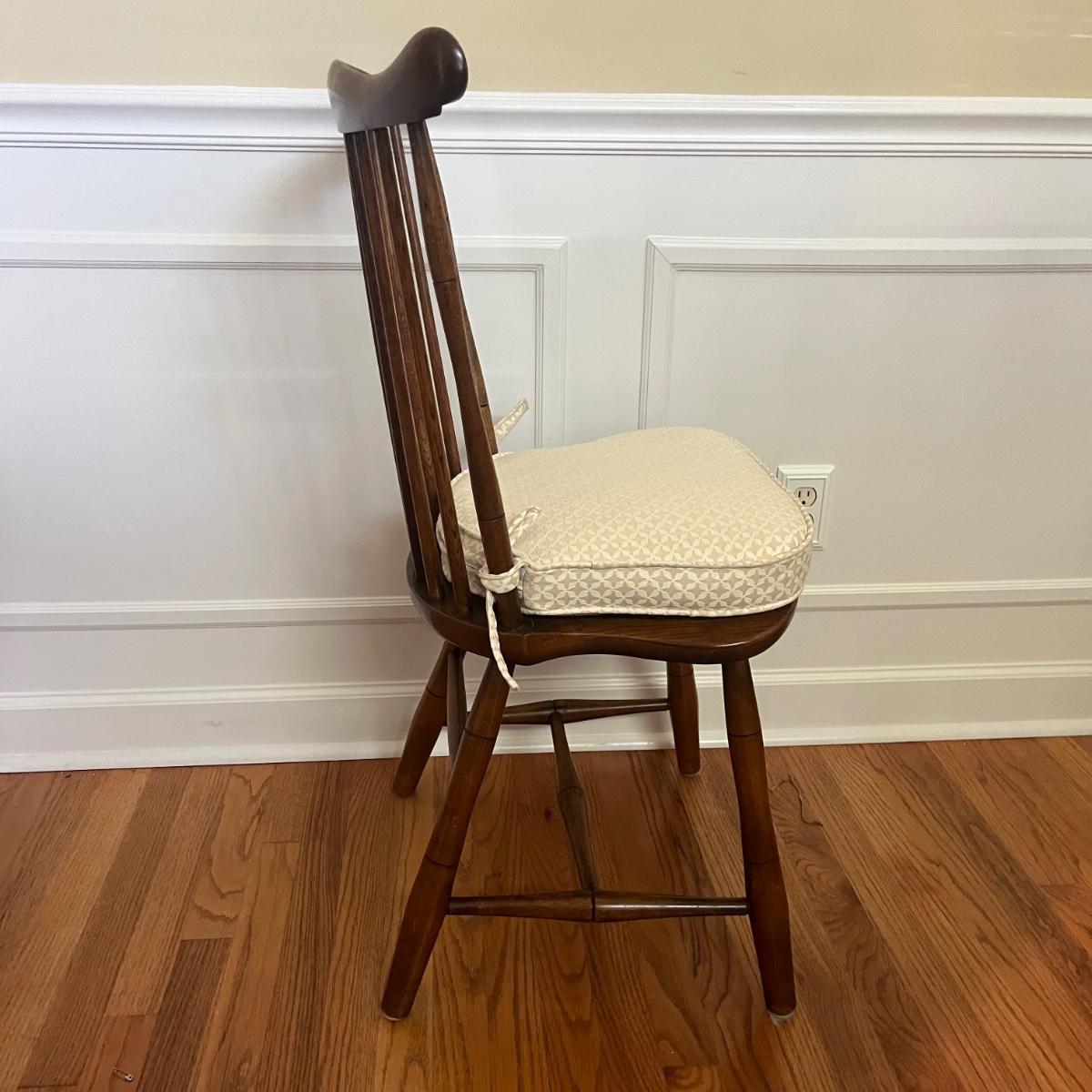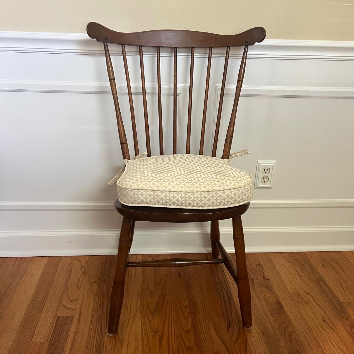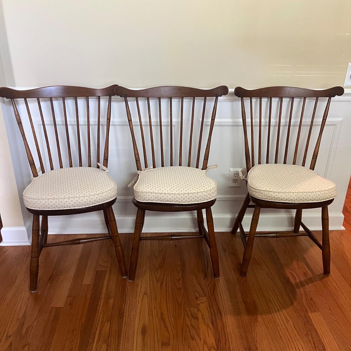 Lot includes three Sikes spindle back wooden chairs. Chairs measure 17.5” x 23” x 37”H with a seat height of 18”. Also includes four tie on seat cushions. Chairs have scratches on seats, see pictures.