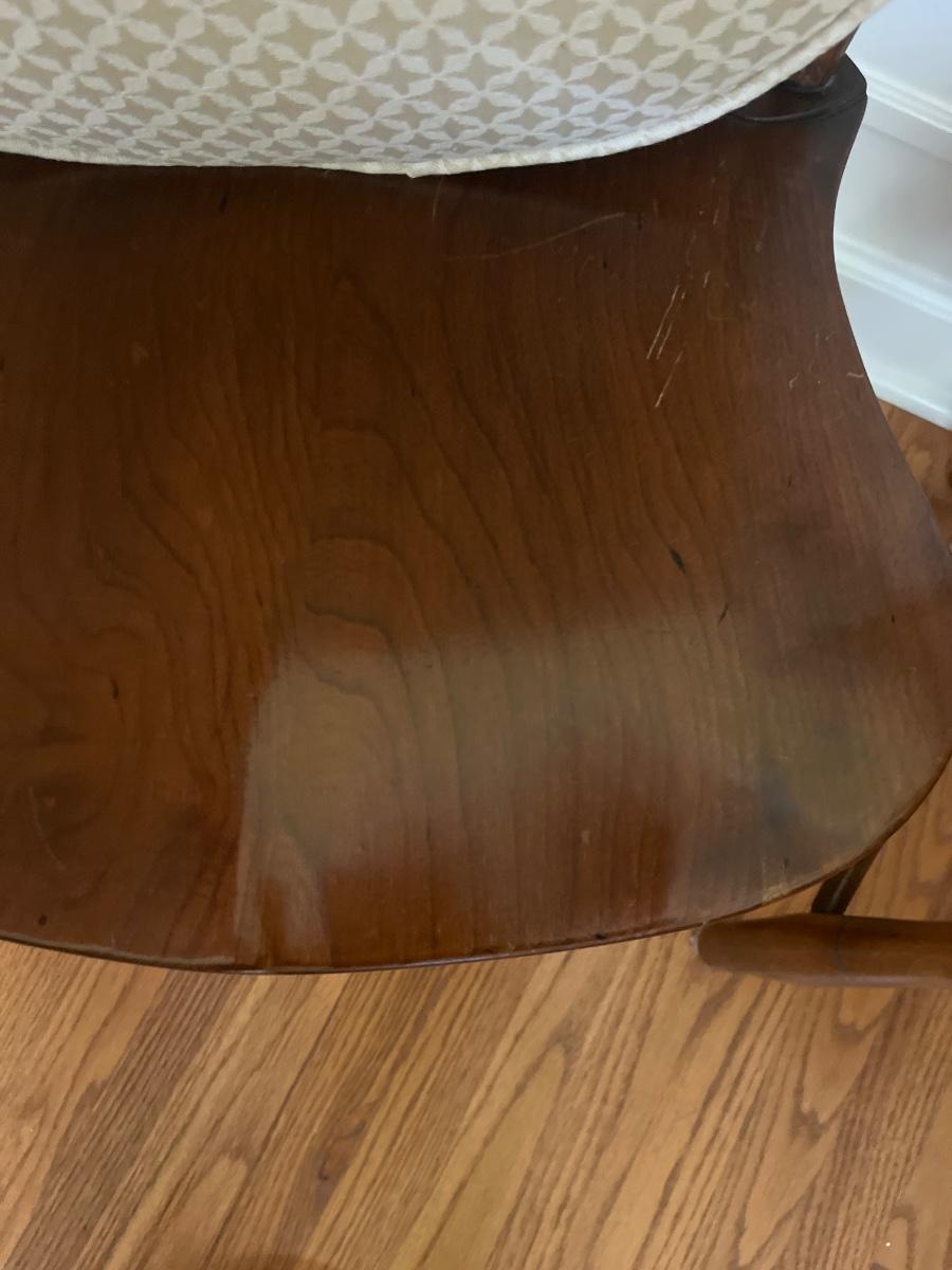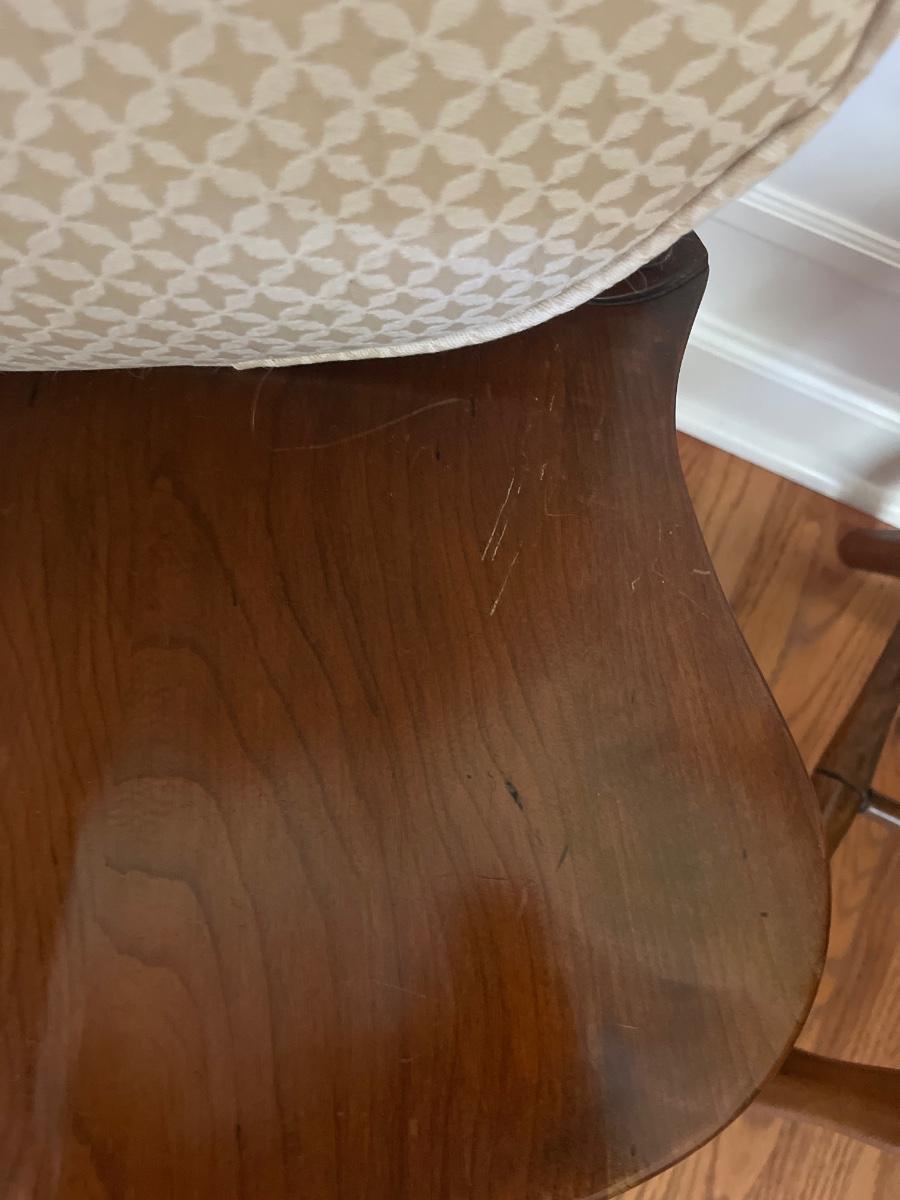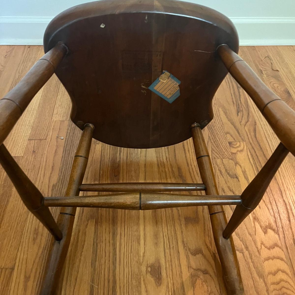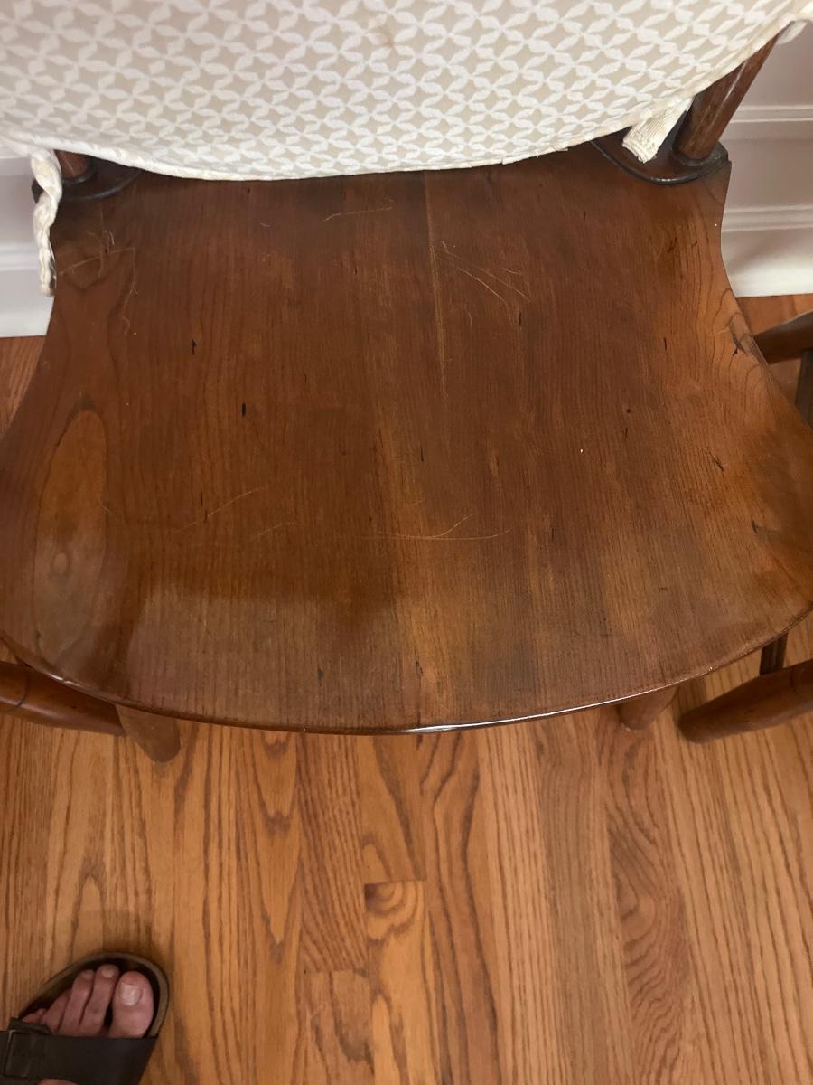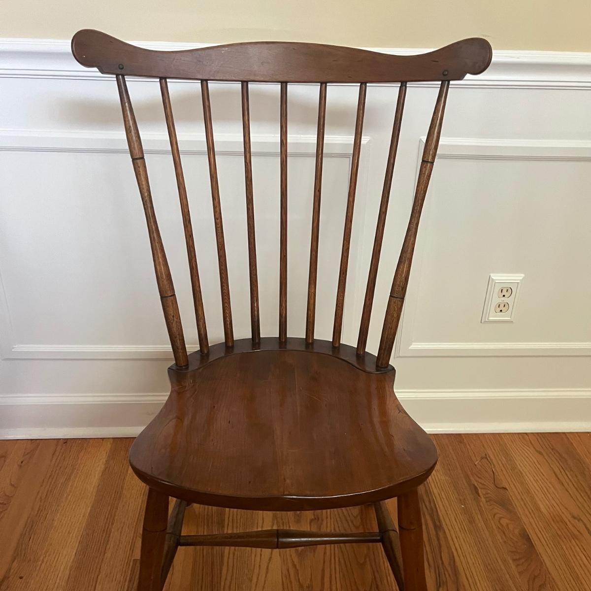 Lot includes three Sikes spindle back wooden chairs. Chairs measure 17.5” x 23” x 37”H with a seat height of 18”. Also includes four tie on seat cushions. Chairs have scratches on seats, see pictures.