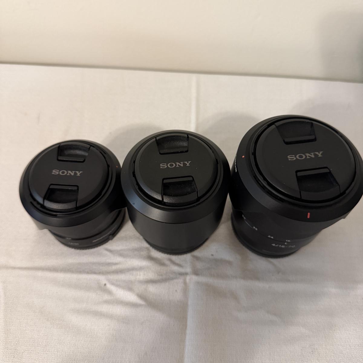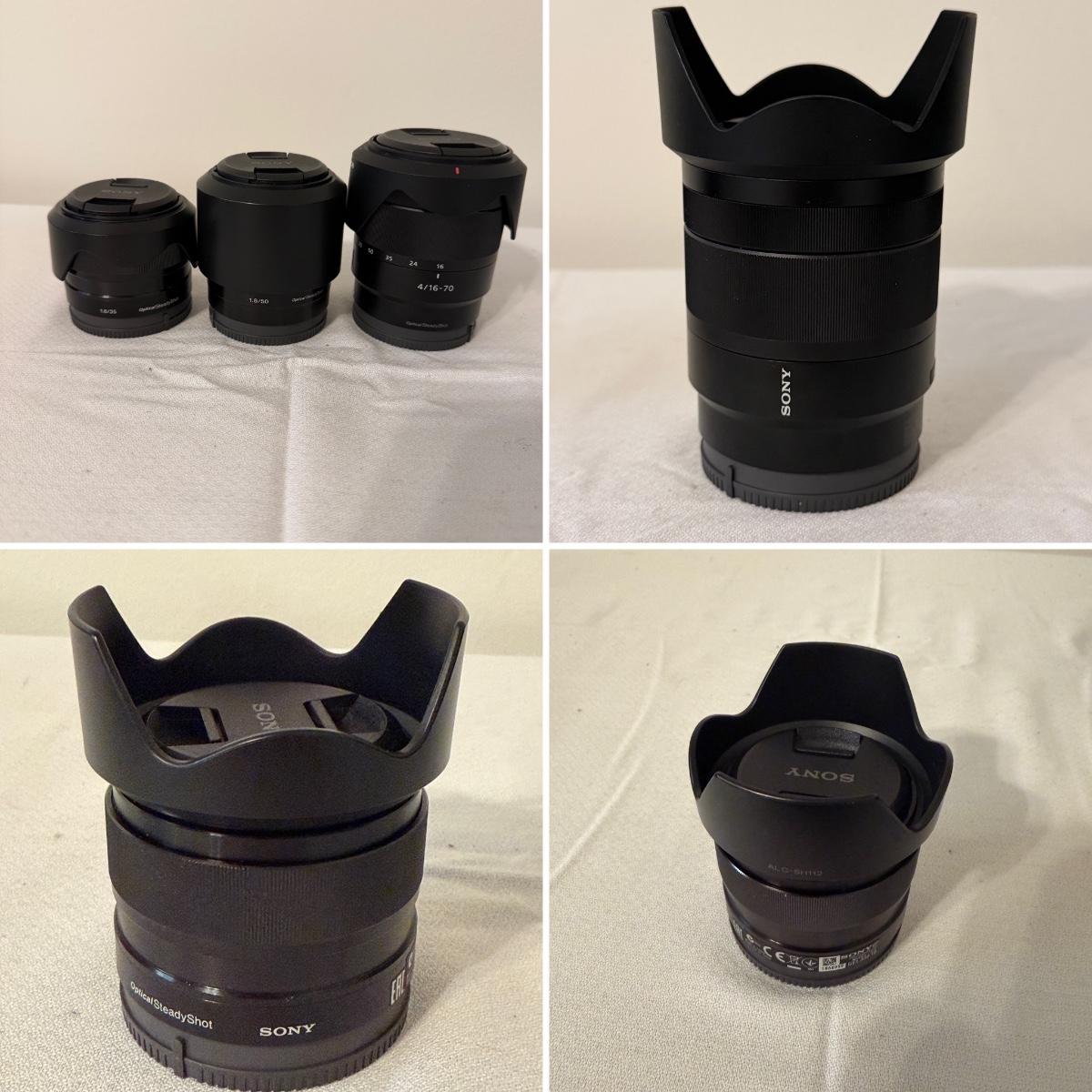 Lot includes a Sony lens model #s SEL35F18, SEL1670Z and SEL50F18 with one original box. Also includes lens hoods on each lens.