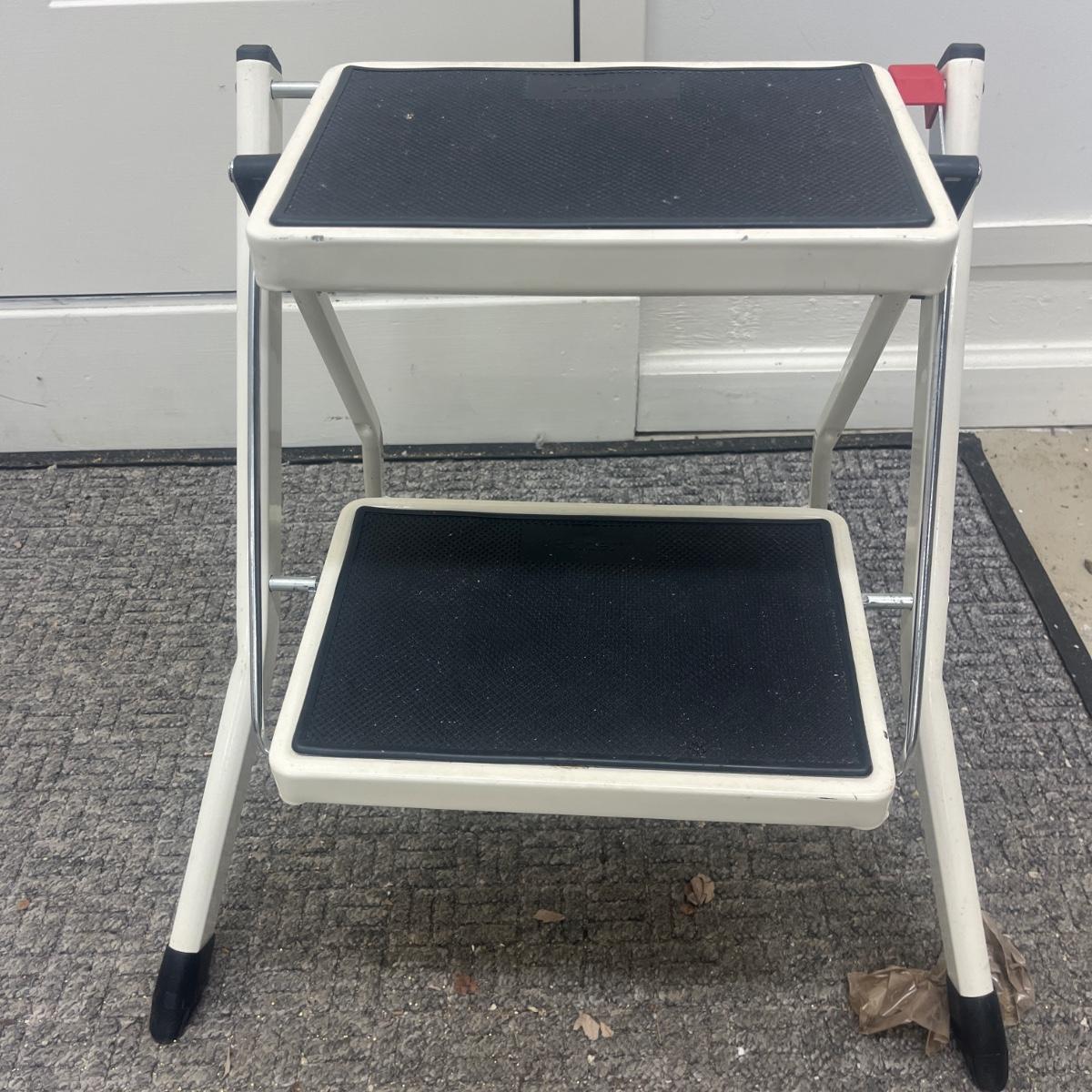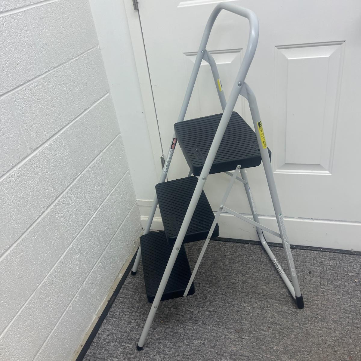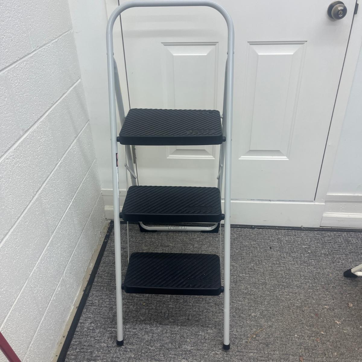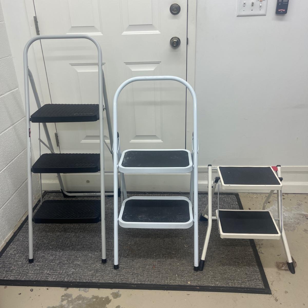 Lot includes a Cosco step stool, Polder step stool and a large unbranded step stool. Largest step stool measures 17” x 27” x 45”H.