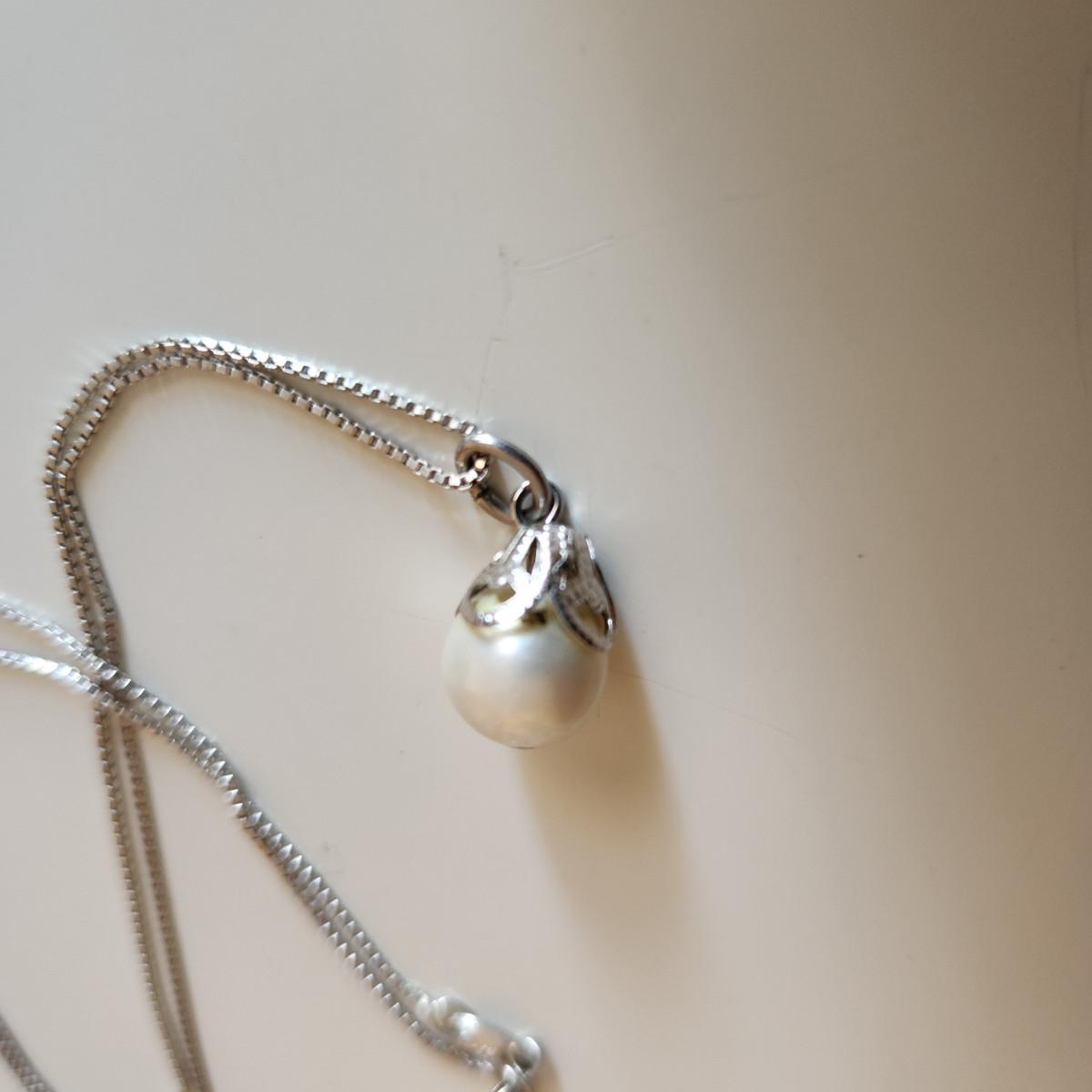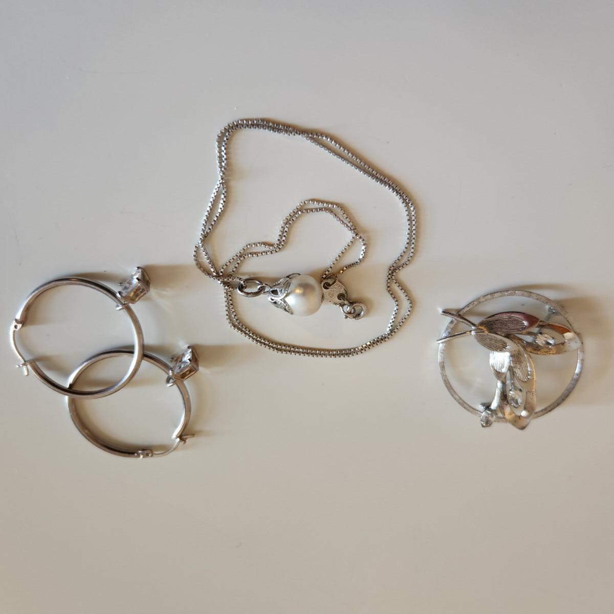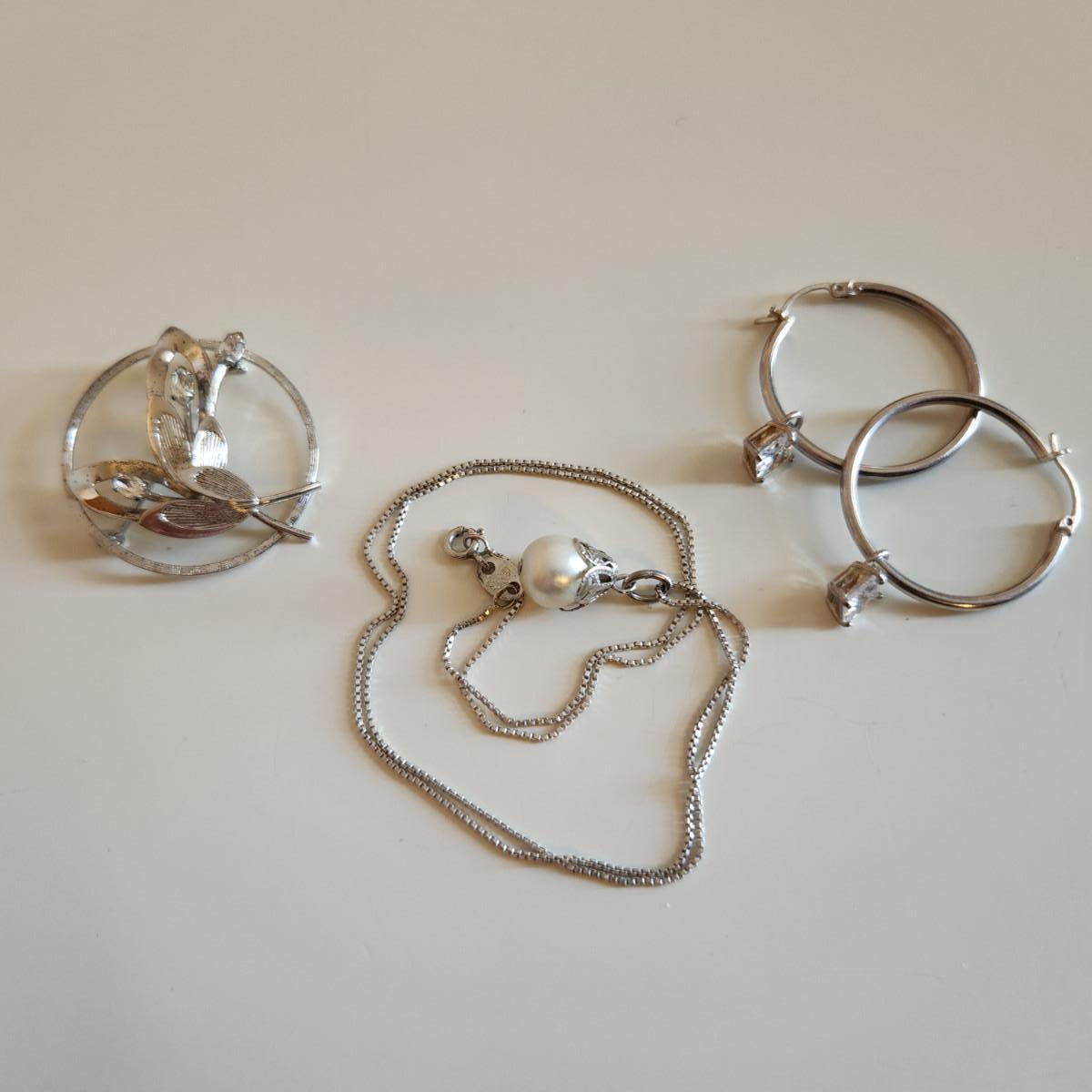This auction lot is for a Trio of Sterling Silver Jewelry. This trio consists of a fancy pin with cut glass gems, a pair of sterling earrings with cut glass stones and a very nice 18-inch necklace with a drilled pearl as pendant. All are marked 925. Buying as a lot.