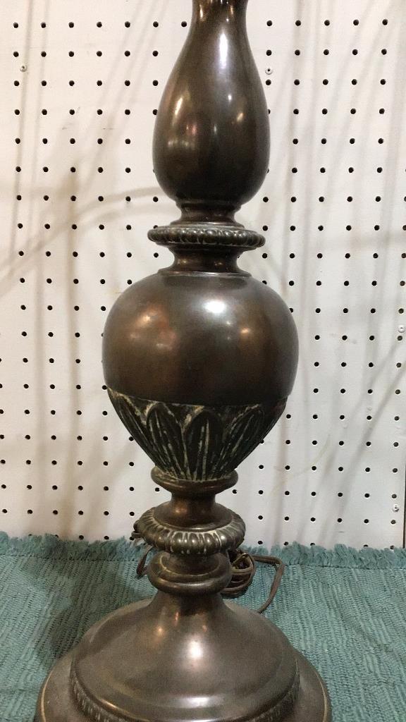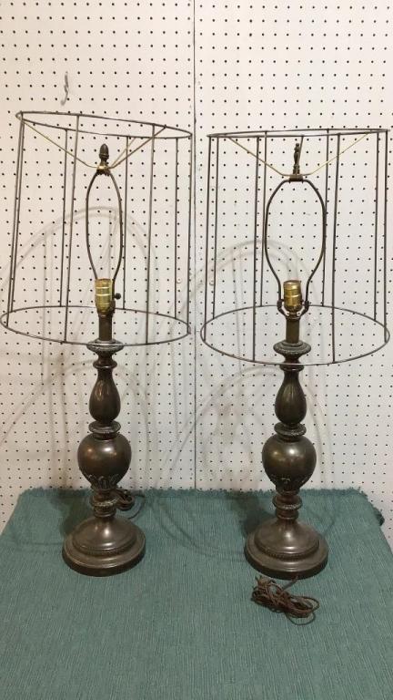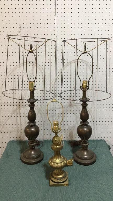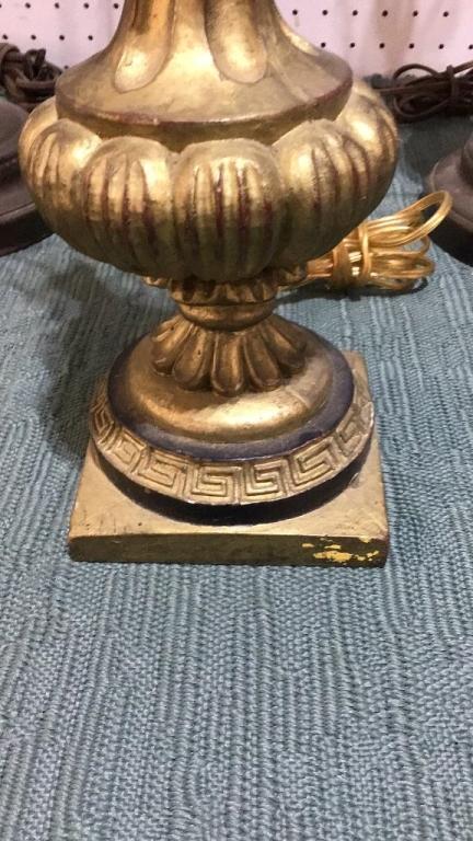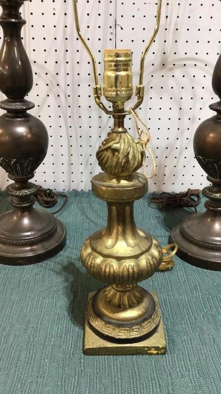 Pair of brass lamps, 34 inch, with harps and shade frames, heavy, leaf pattern..Gold lamp, 21 inch, wood, Greek Key pattern at base, harp, no finial.