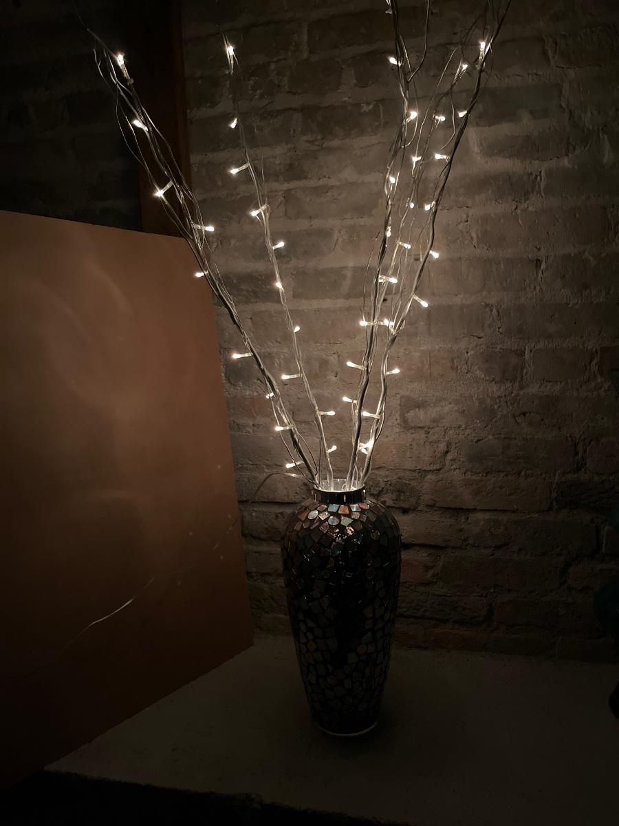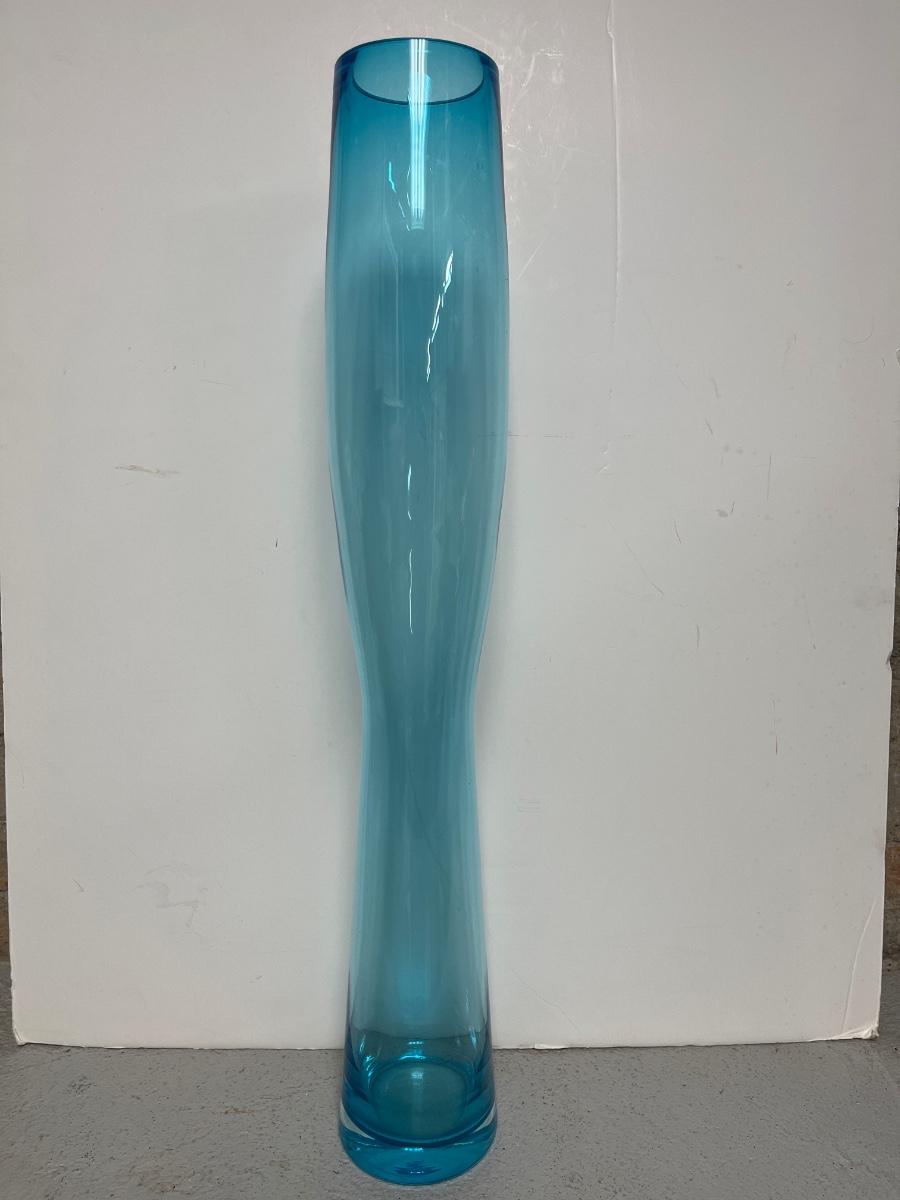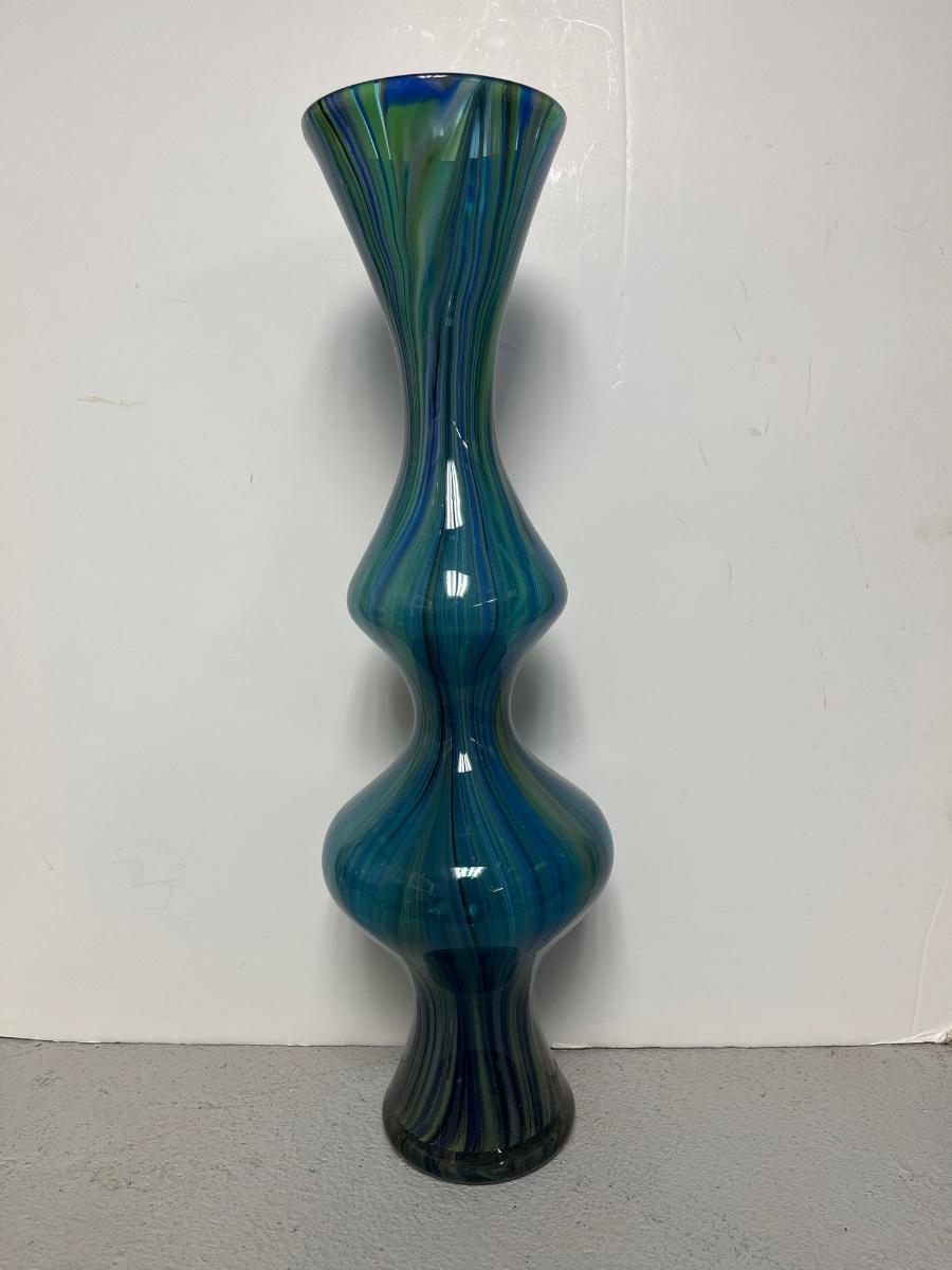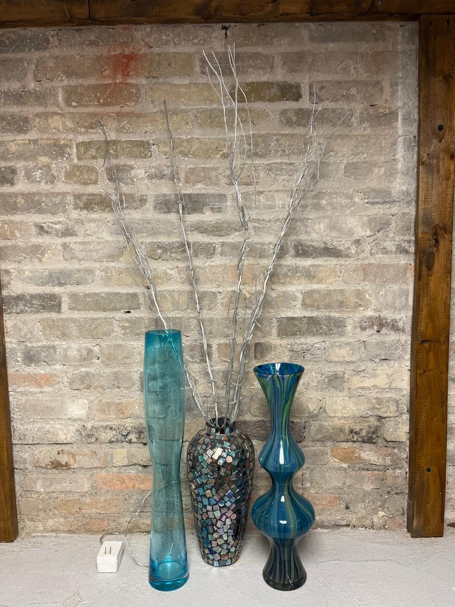 Mosaic vase with lighted branches is 14 1/2” without branches & approximately 4’ with branches, blue green swirl vase is 20 1/2” and aqua vase is 24” and handmade in Poland