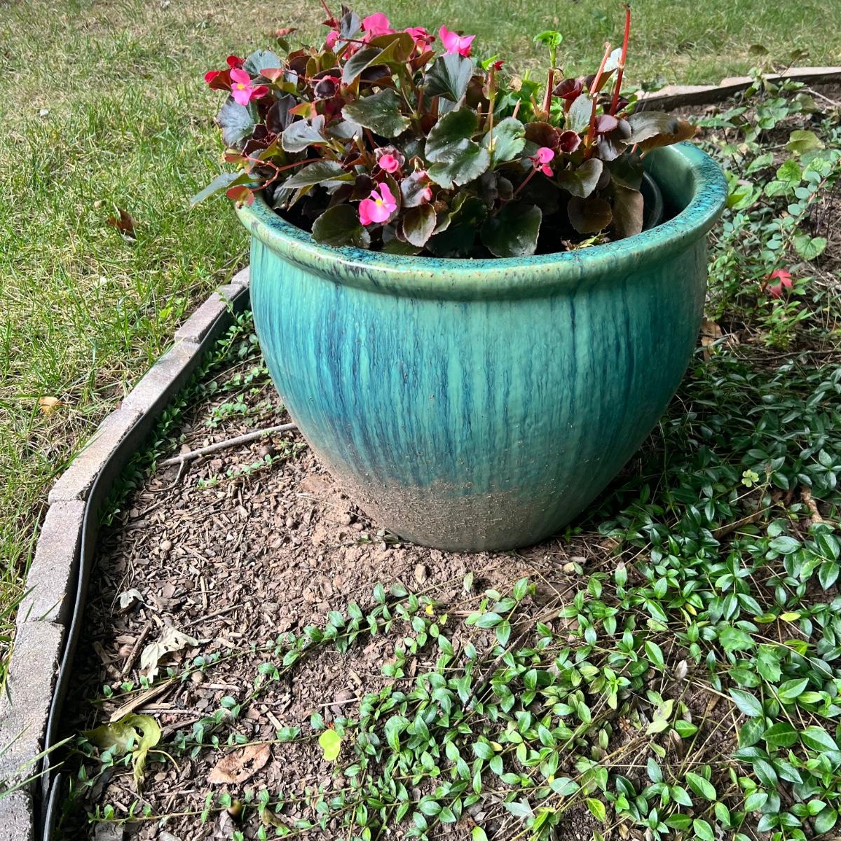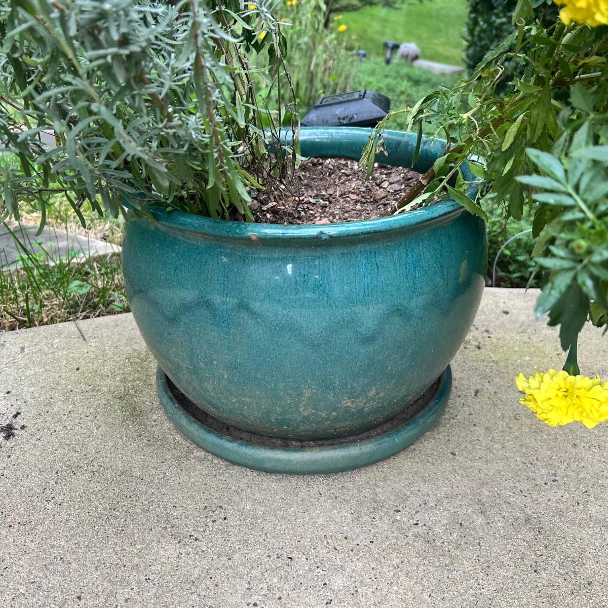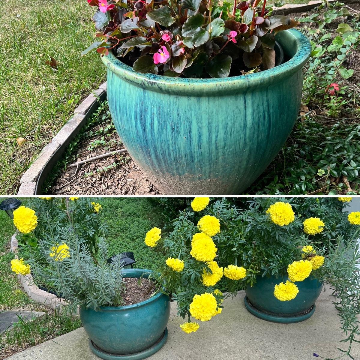 Three plant pots with a teal glaze. Plants are included but please note that our photos were taken in late August and we cannot guarantee the health and/or flowering come pick up day. The largest pot measures 18” x 16”H and has a drainage hole; the Begonia plants are housed in an inner black plastic pot. The two smaller pots with Marigolds measure 12”D x 9”H and have built in drip trays.