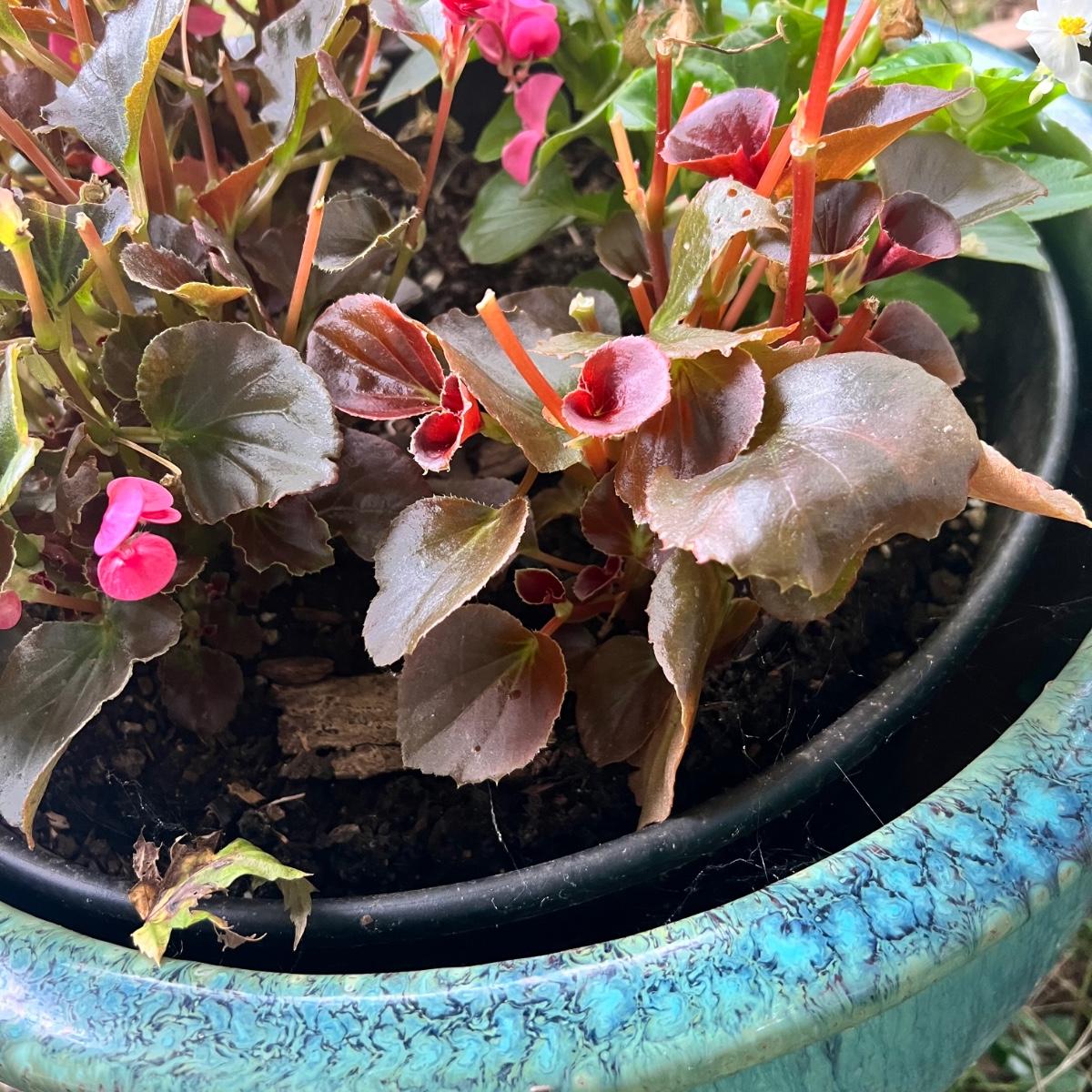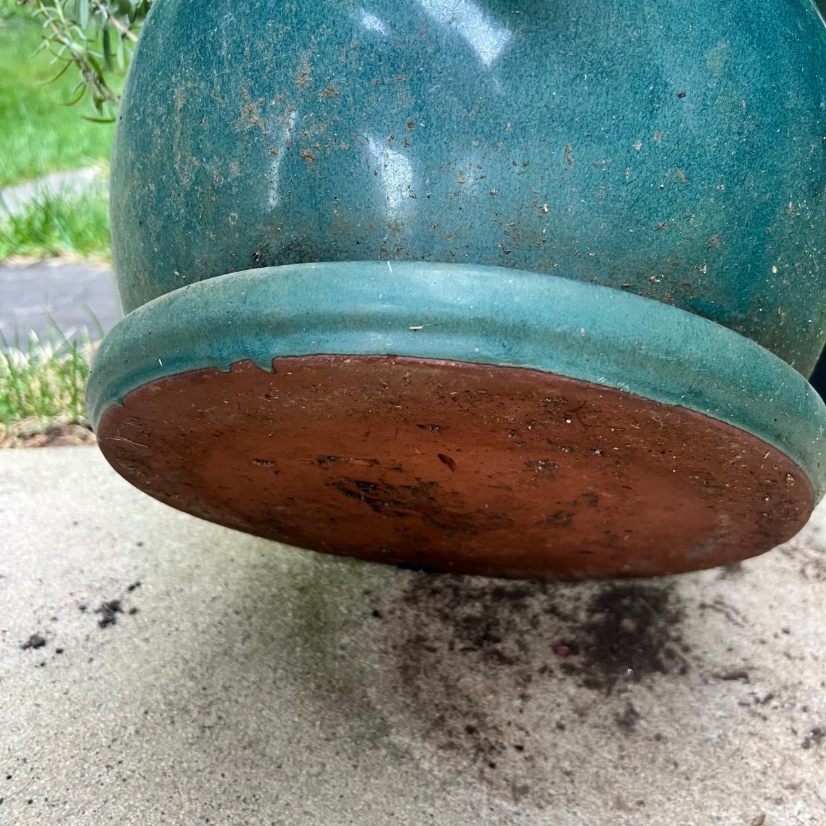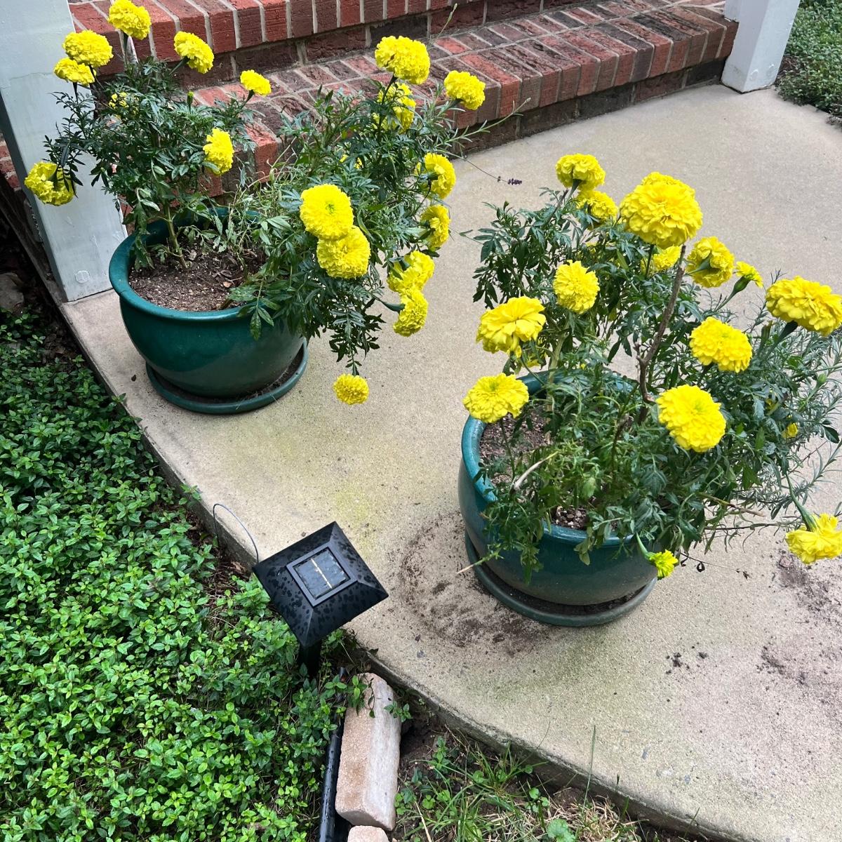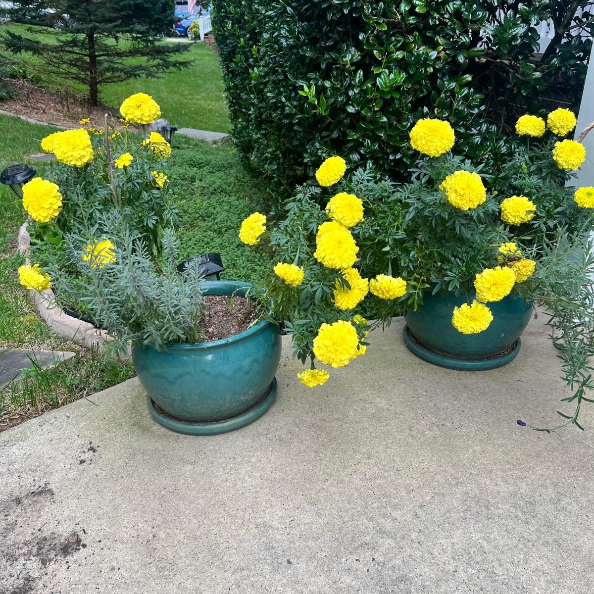 Three plant pots with a teal glaze. Plants are included but please note that our photos were taken in late August and we cannot guarantee the health and/or flowering come pick up day. The largest pot measures 18” x 16”H and has a drainage hole; the Begonia plants are housed in an inner black plastic pot. The two smaller pots with Marigolds measure 12”D x 9”H and have built in drip trays.