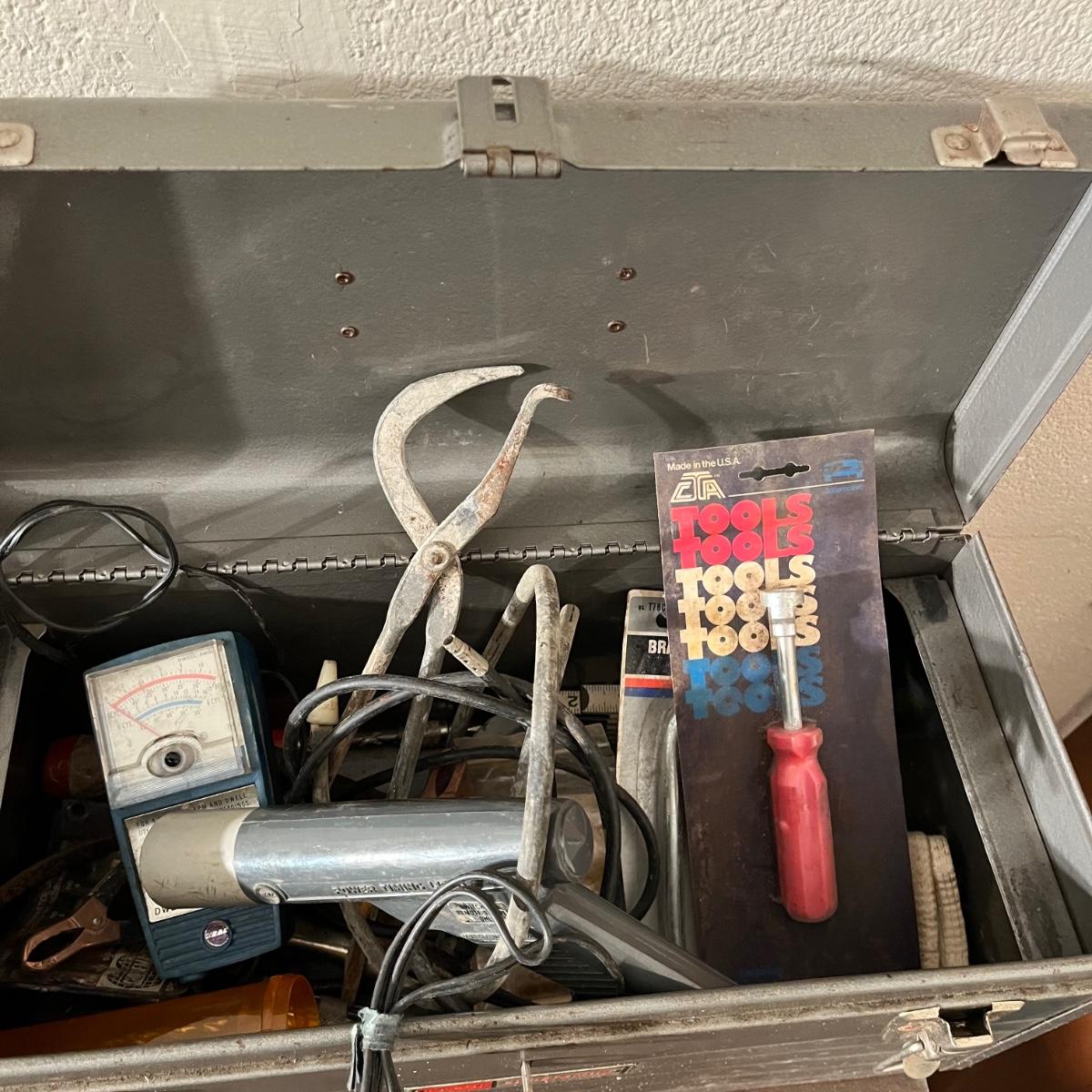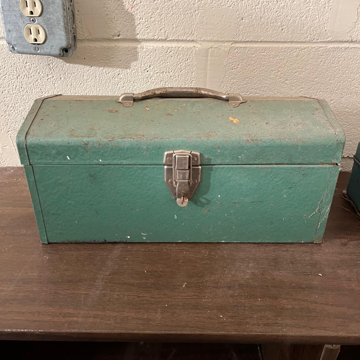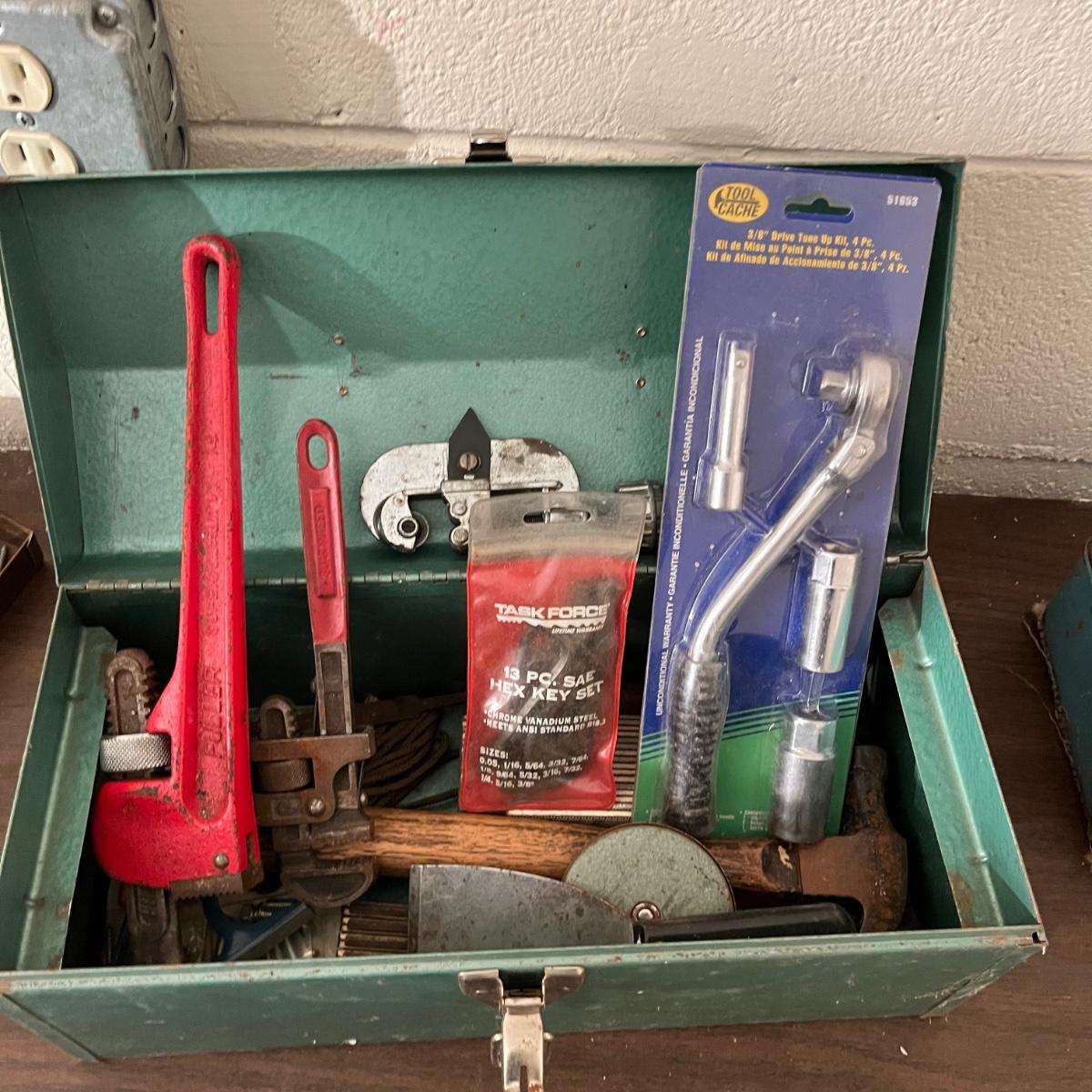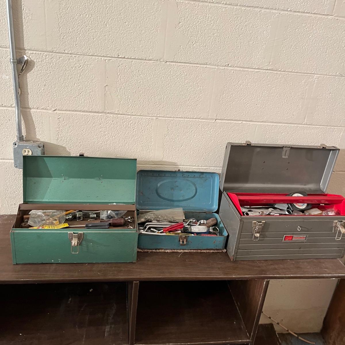 Lot includes a Craftsman toolbox with timing light, tach and dwell, wrenches and more, blue toolbox contains Craftsman stubby 3/8” drive ratchet, wrenches and more. Also includes a green toolbox with pipe wrenches, ratchet, hammer and more. All toolboxes are metal. Craftsman toolbox measures 8” x 18”. 9”.