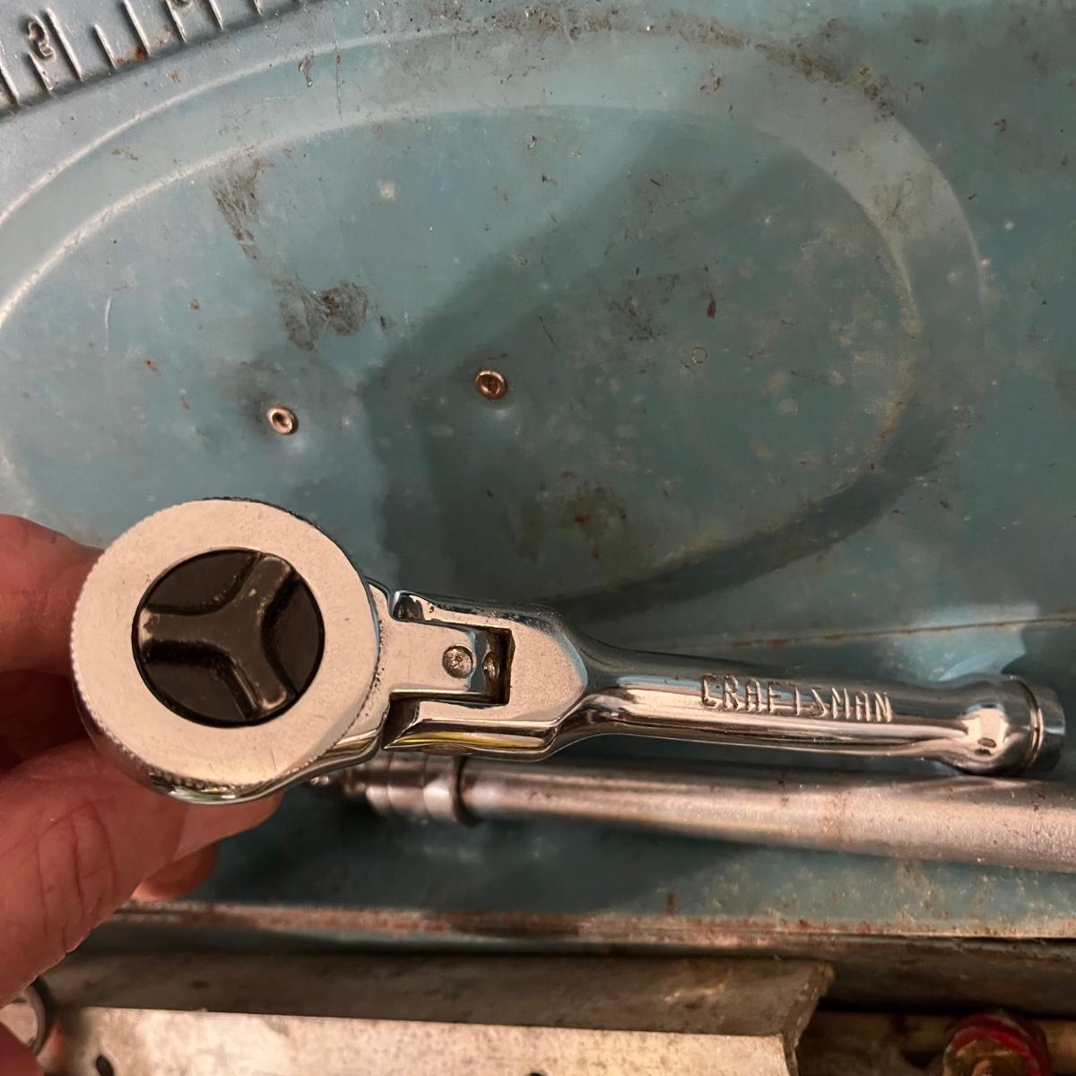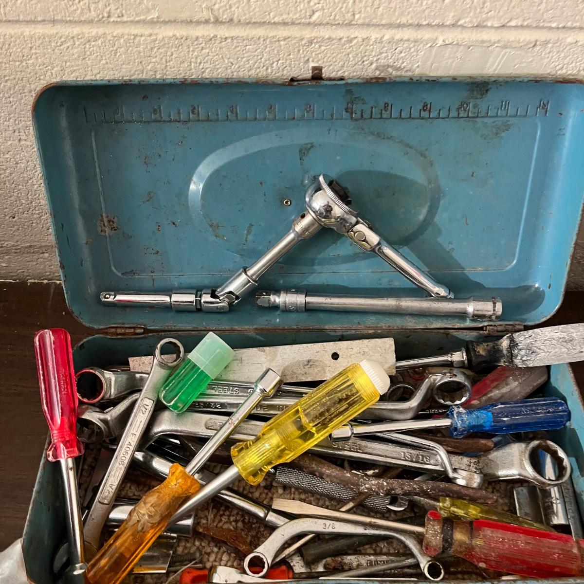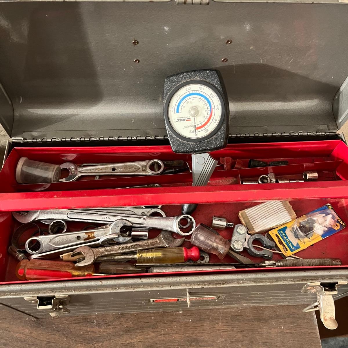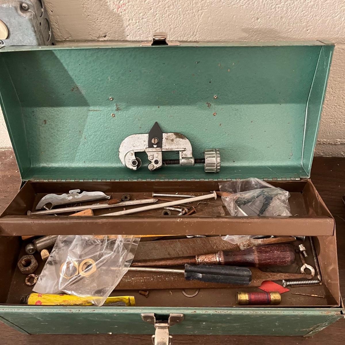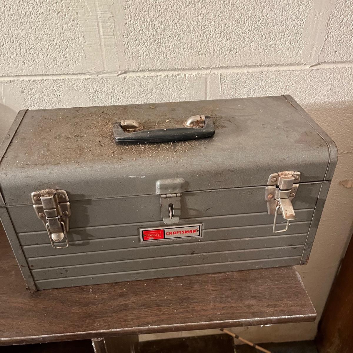 Lot includes a Craftsman toolbox with timing light, tach and dwell, wrenches and more, blue toolbox contains Craftsman stubby 3/8” drive ratchet, wrenches and more. Also includes a green toolbox with pipe wrenches, ratchet, hammer and more. All toolboxes are metal. Craftsman toolbox measures 8” x 18”. 9”.