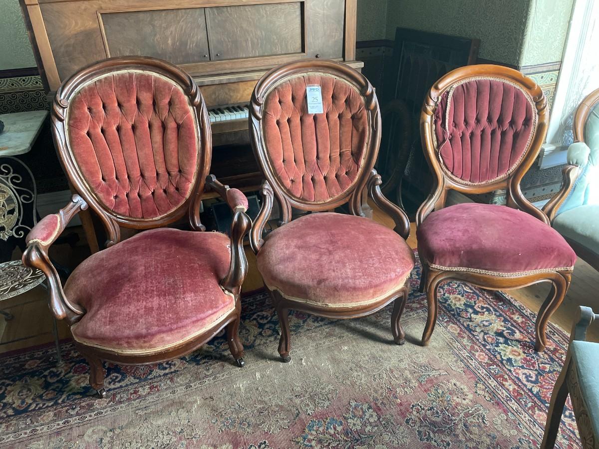 Faded Red Velvet with Tuft back. 1 with arms, 2 armless.