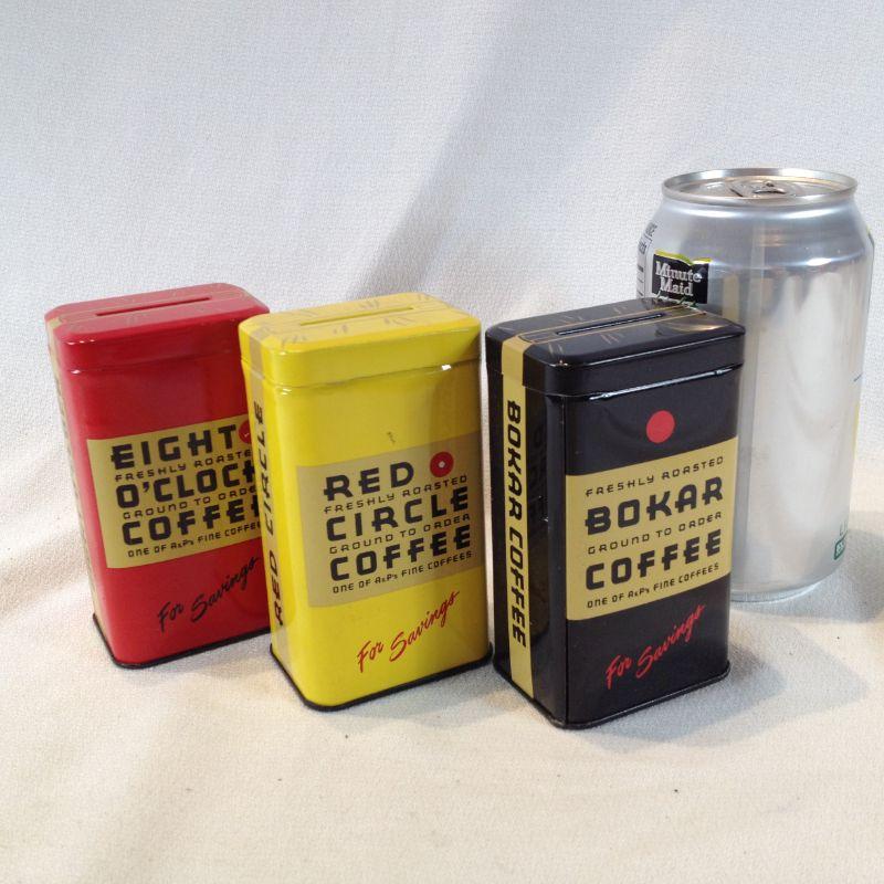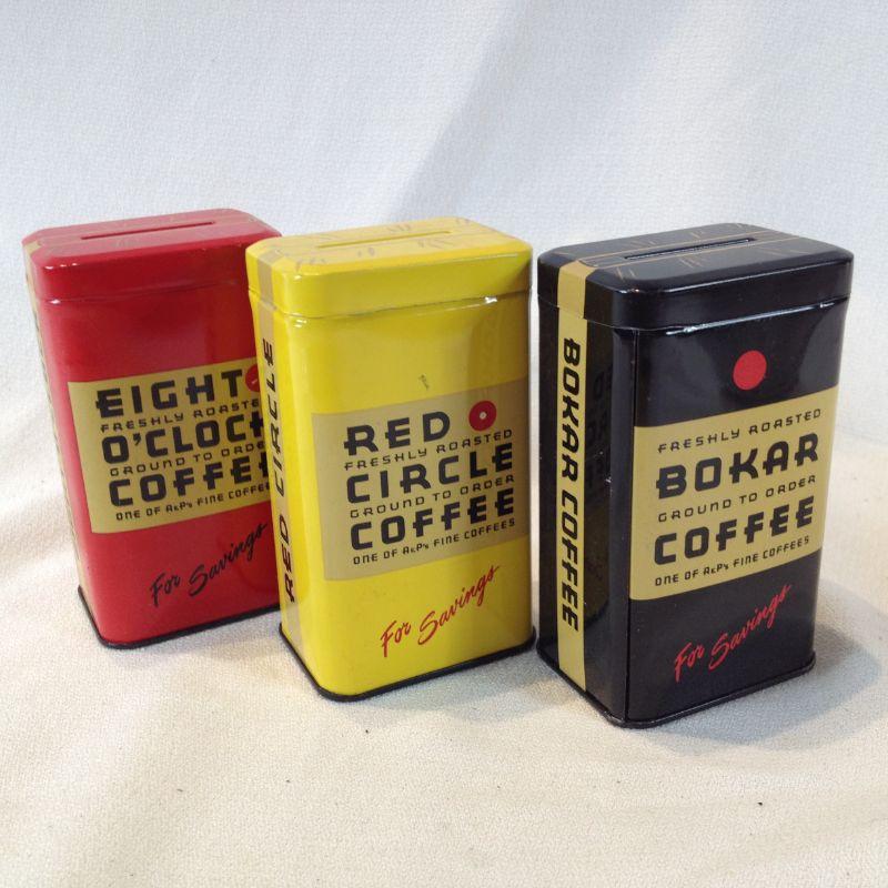 This offering is for a set of Vintage Coffee Tin Banks. The three banks were promotional items for Bokar, Red Circle and Eight O'Clock Coffee Companies. They are as new and are in very good condition. Unused.