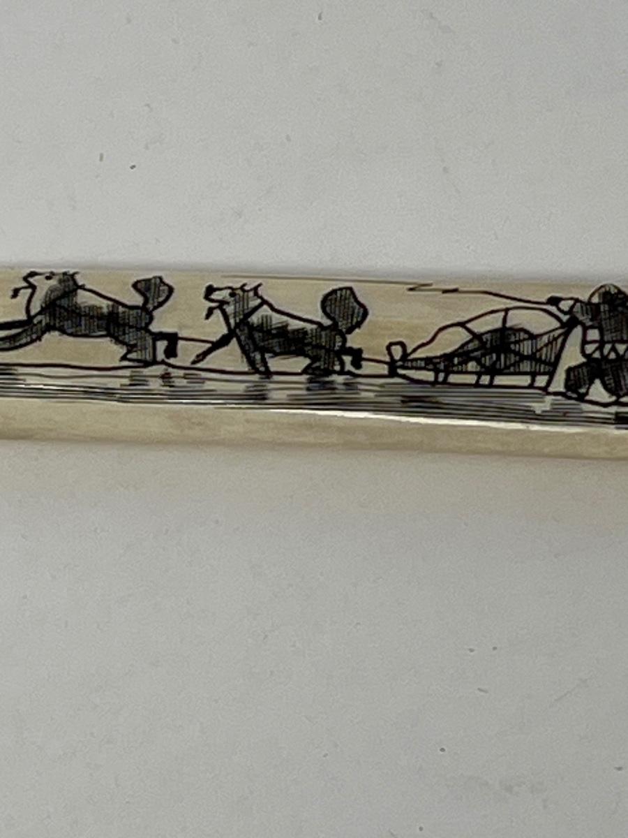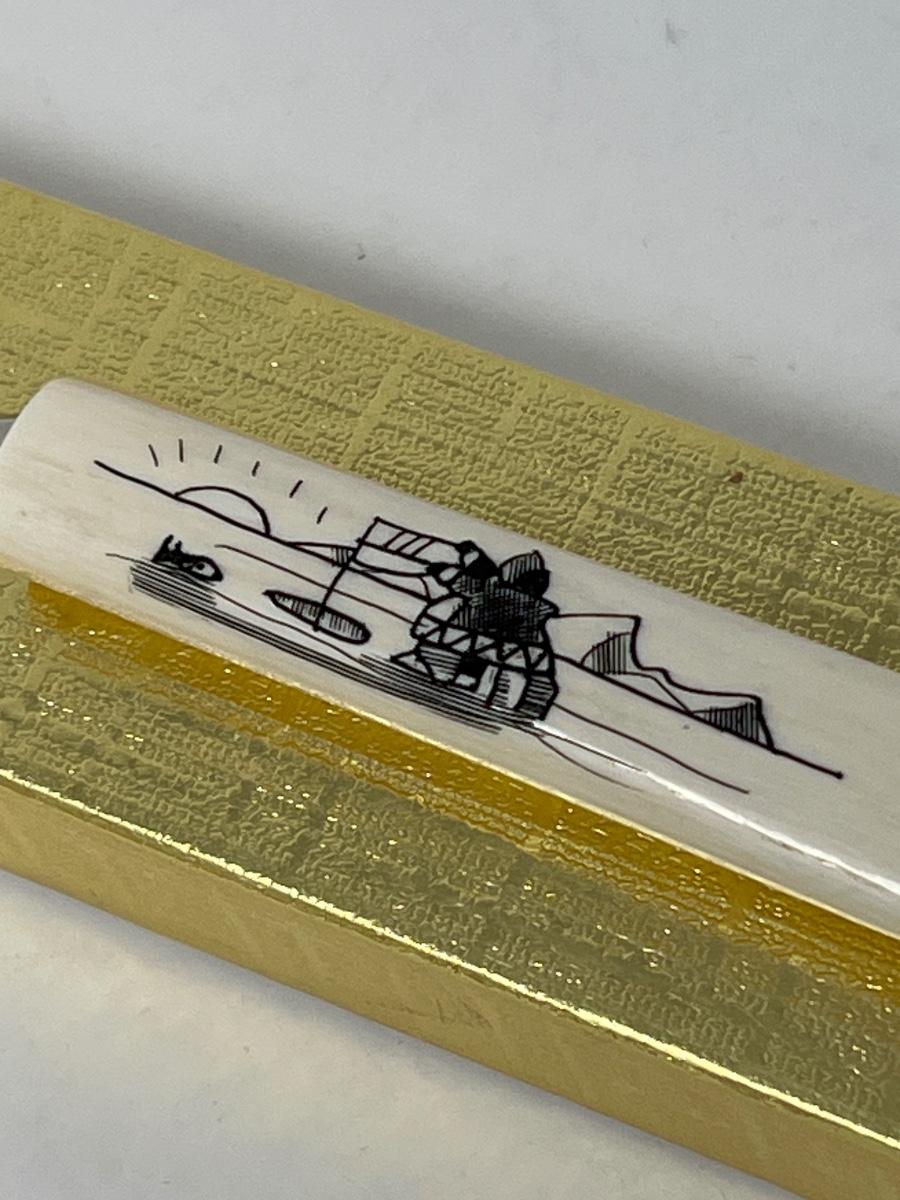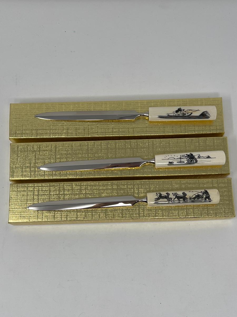 Three (3) stainless steel letter openers with etched bone handles. Alaskan scenes. Each opener has a gold gift box. Size: 8” in length.