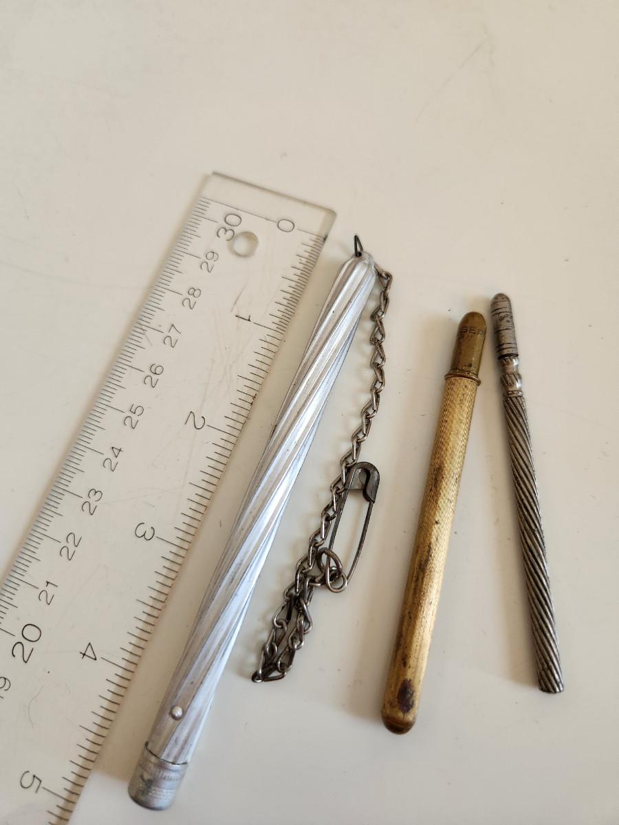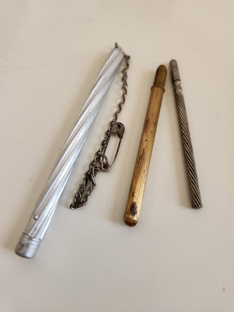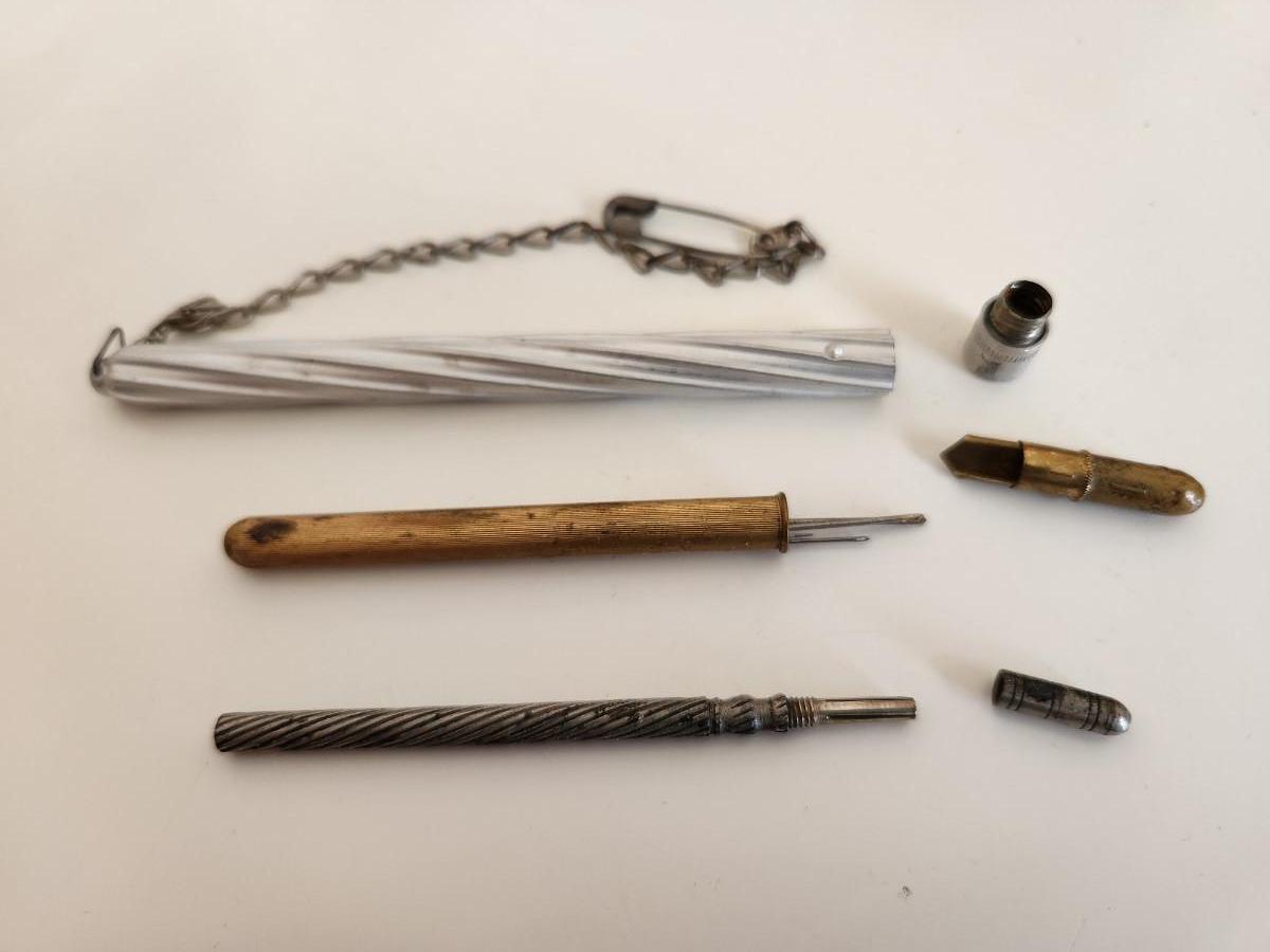 This lot is for a Trio of Vintage Needle Cases. These nifty little items from the past are needle (or possible pencil lead) holders. The brass one has a selection of needle within. The aluminum case has a chain with a safety pin - a very utilitarian piece. The smallest piece is very thin, but heavy for its size.