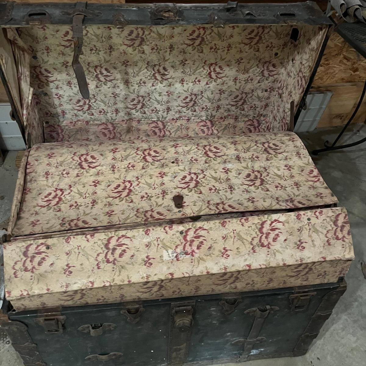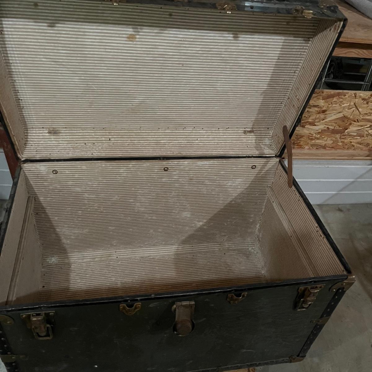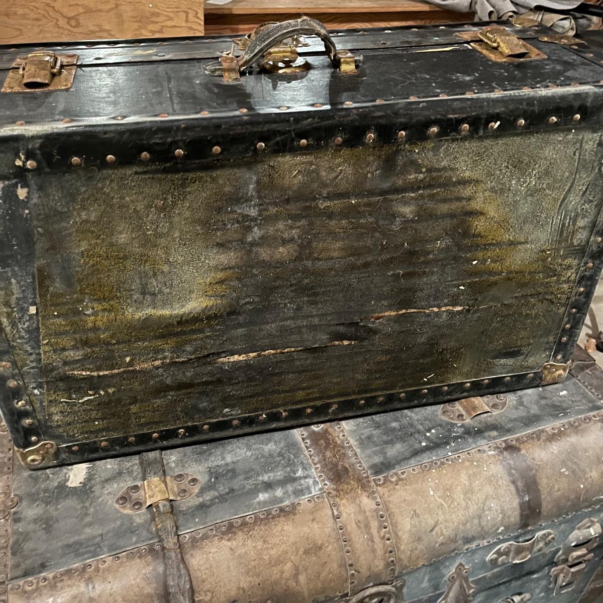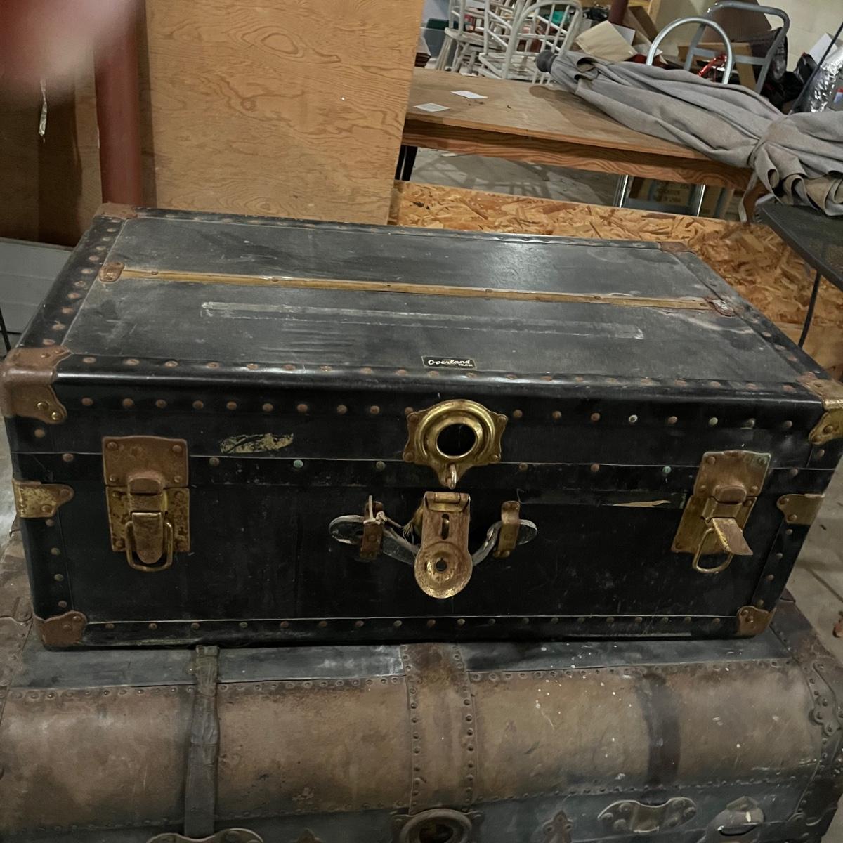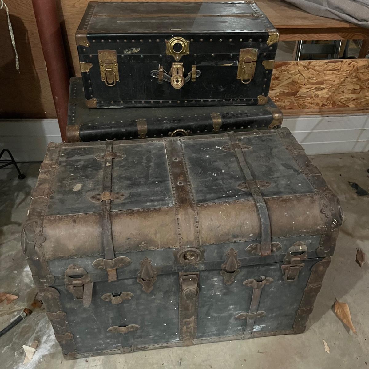 Lot includes one Overland brand trunk, one round-edged trunk with inserts, and one square topped trunk with insert. Overland trunk has wear on bottom and all three trunks have the smell of mildew, so you will want to air them out.