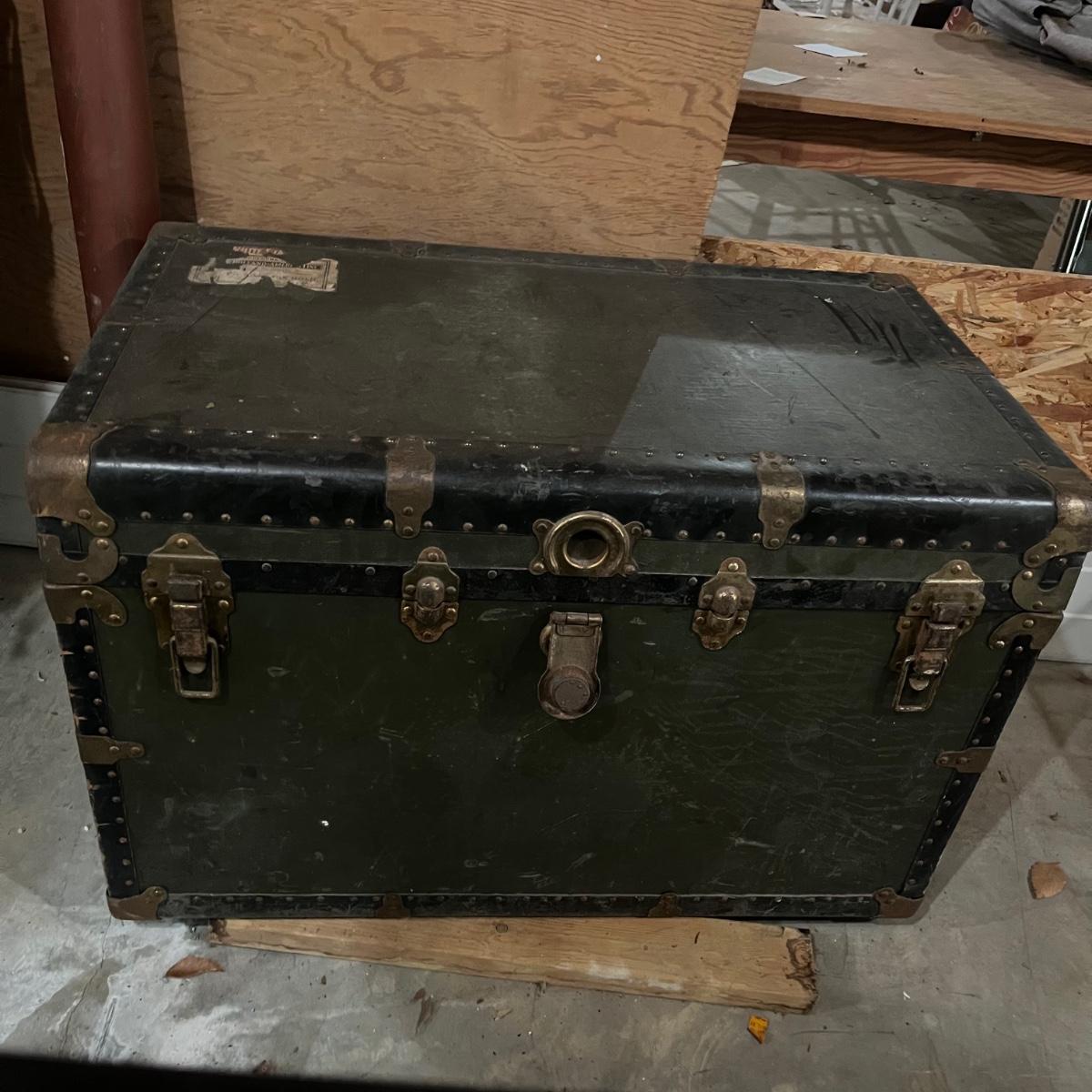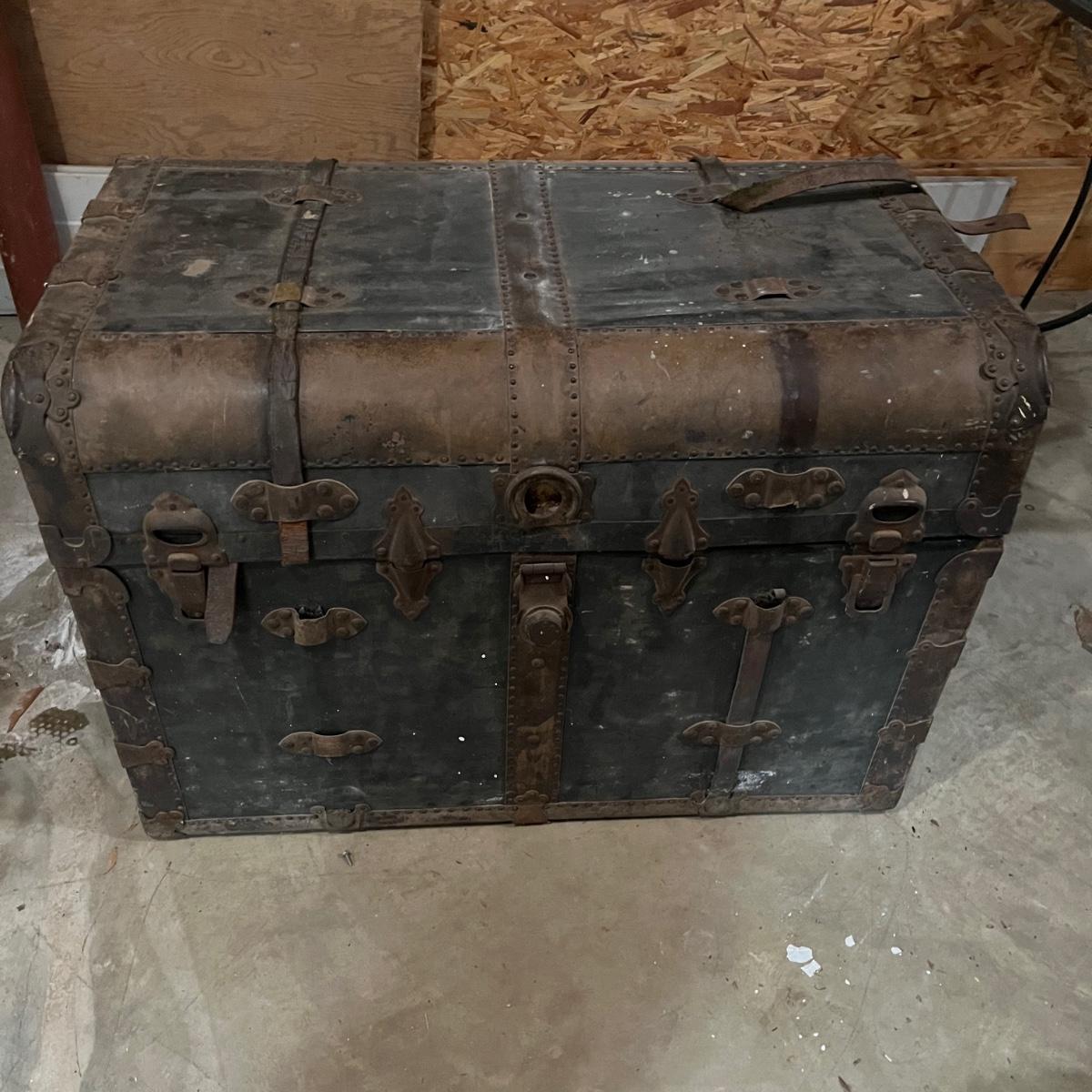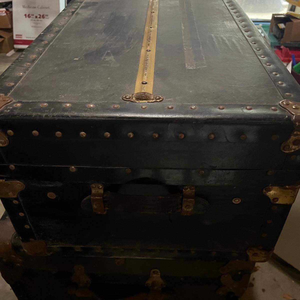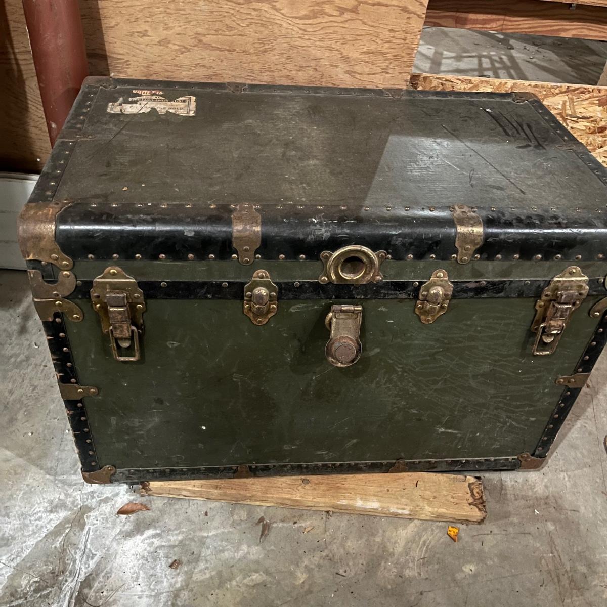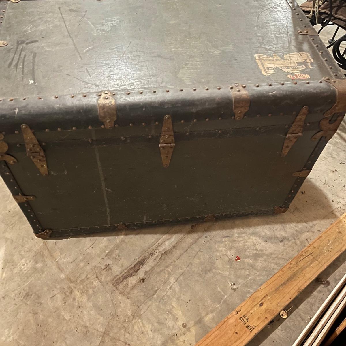 Lot includes one Overland brand trunk, one round-edged trunk with inserts, and one square topped trunk with insert. Overland trunk has wear on bottom and all three trunks have the smell of mildew, so you will want to air them out.