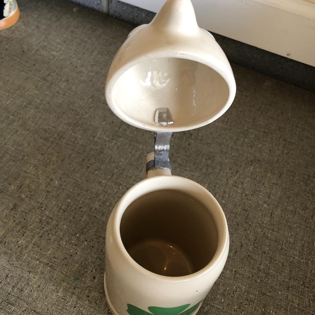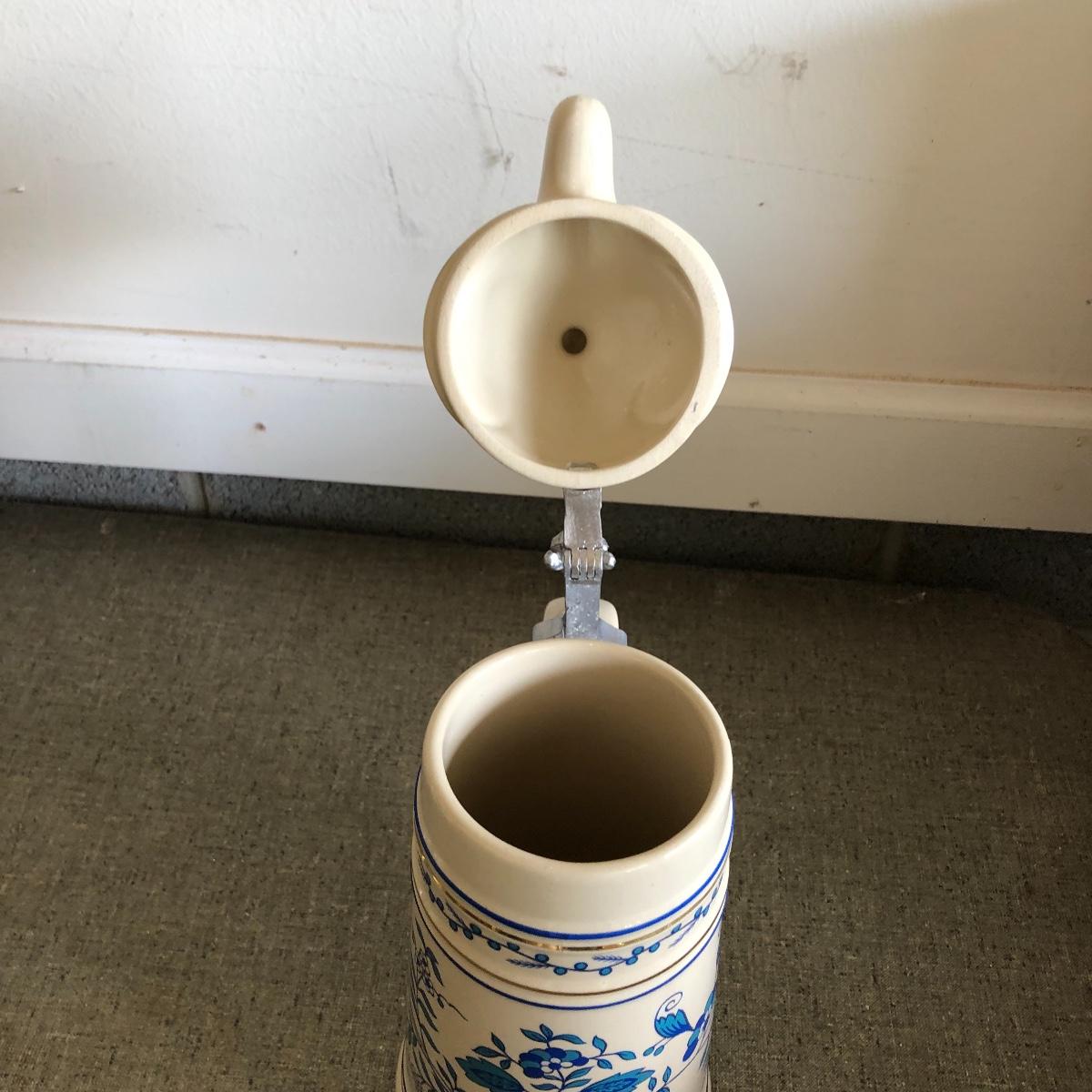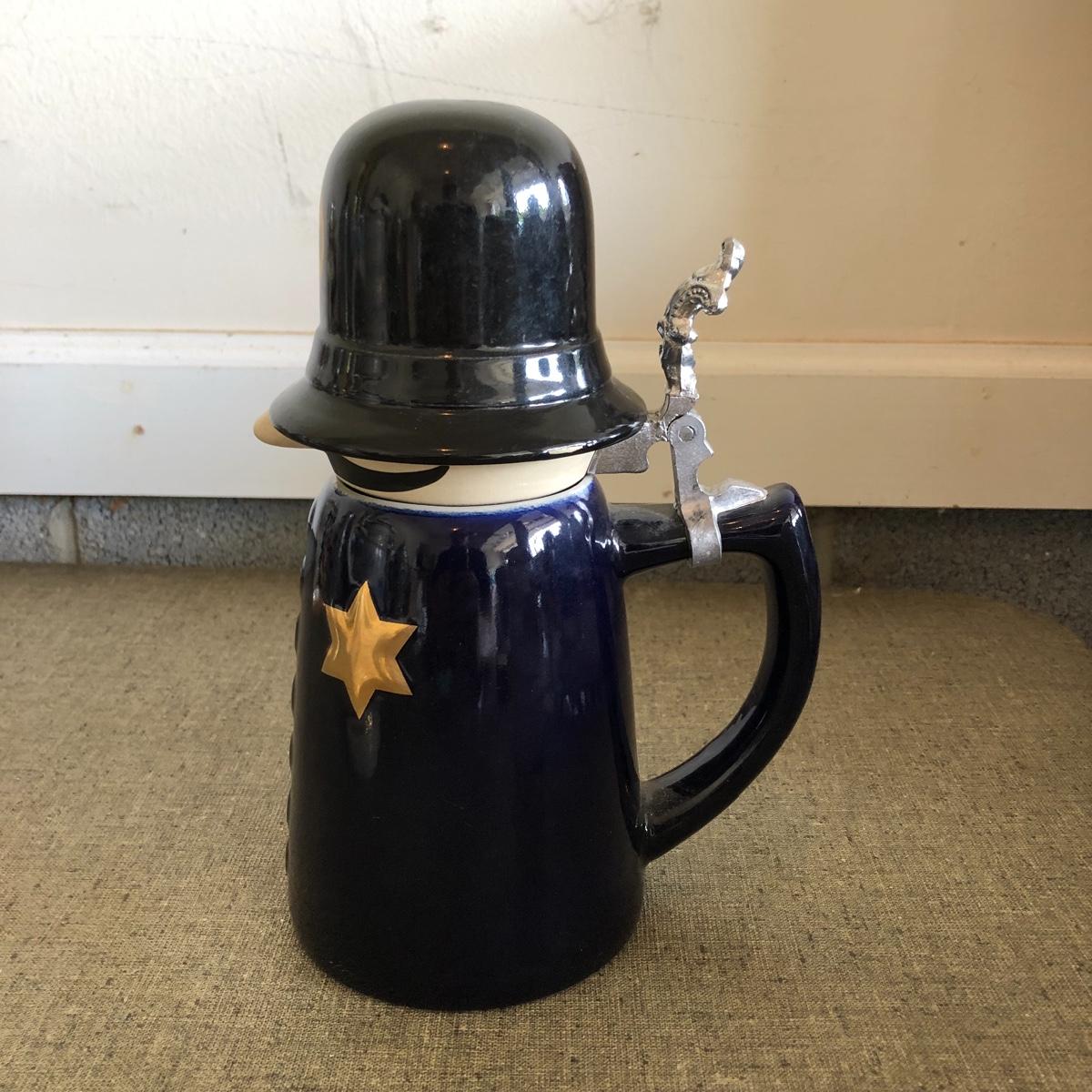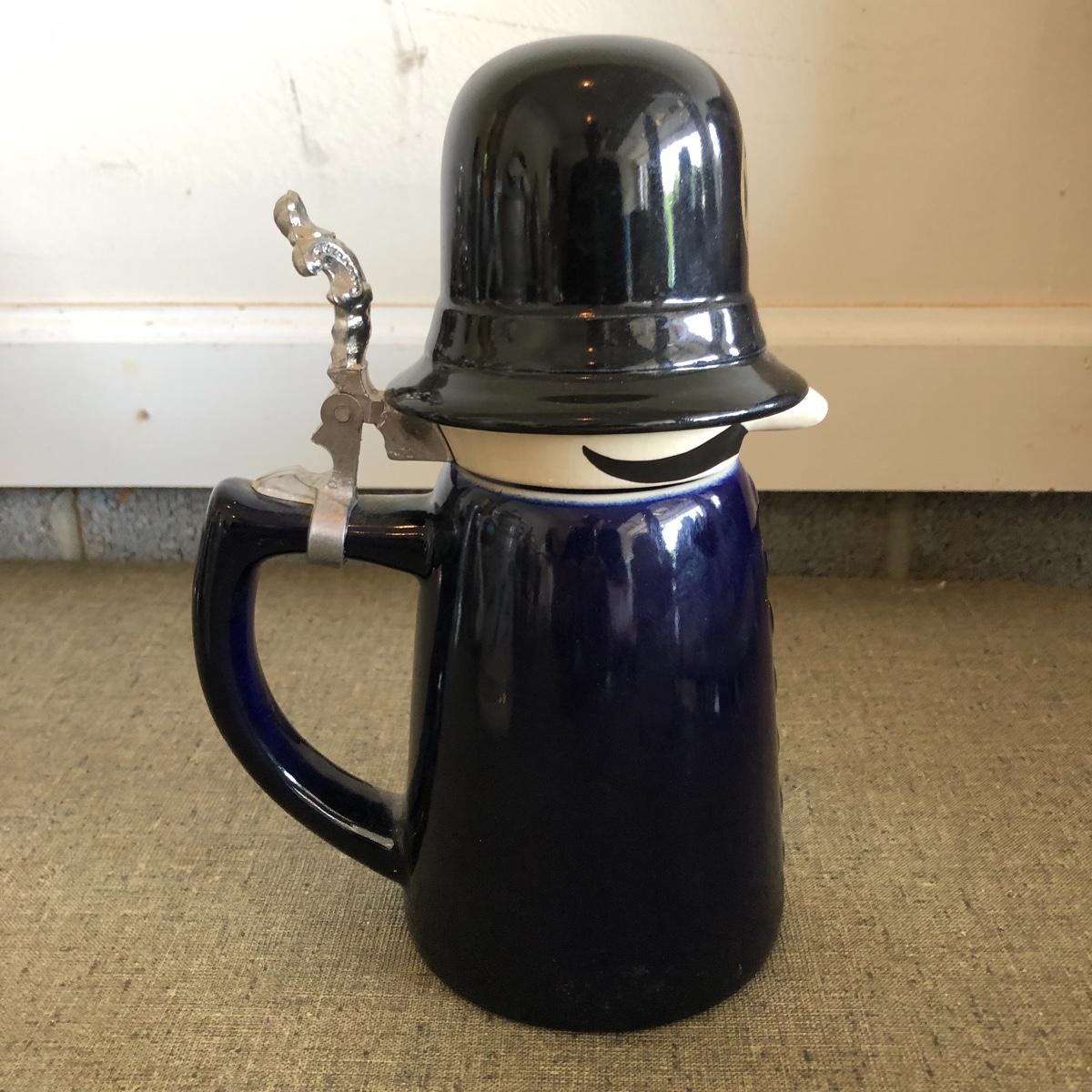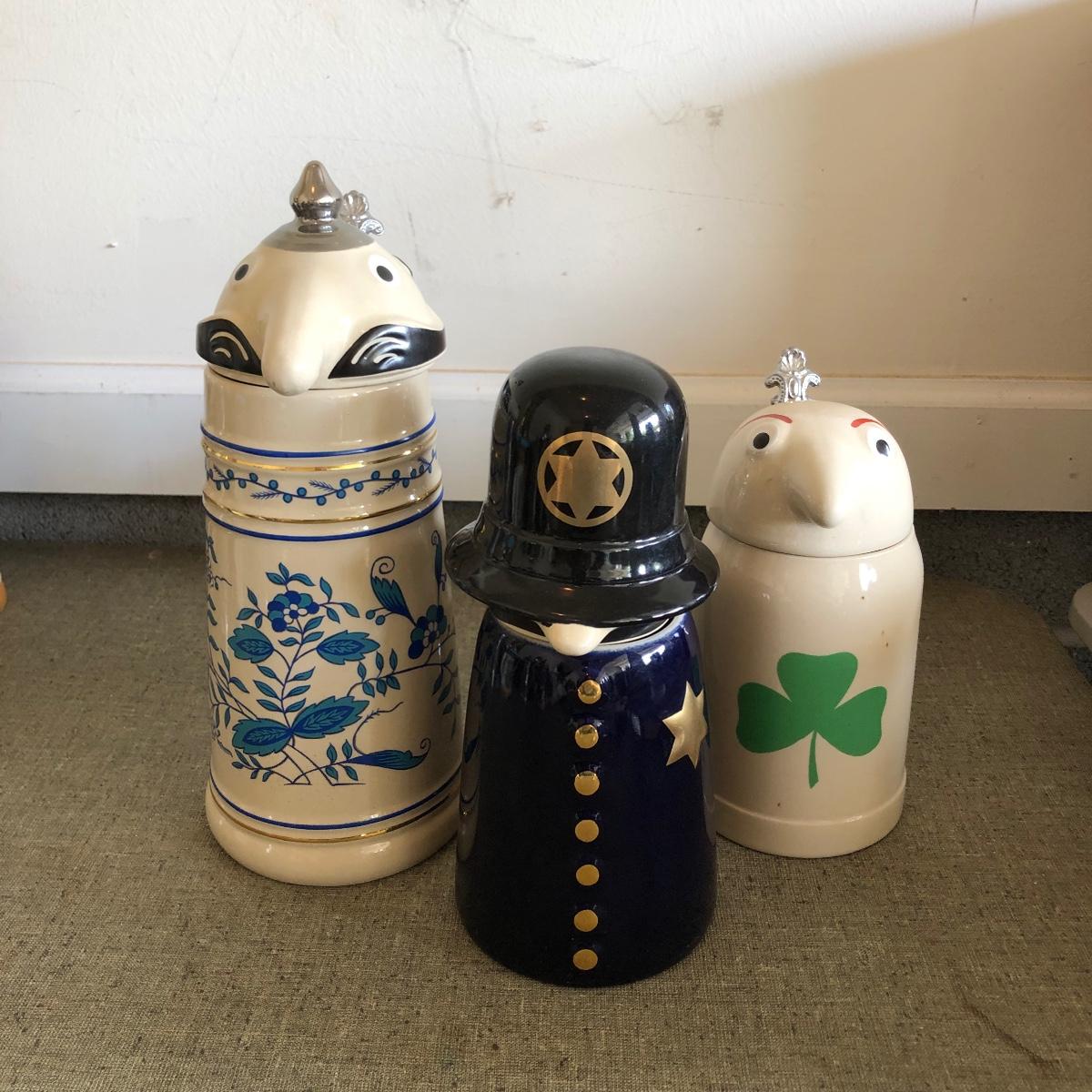 Lot includes Police officer style Beerstein, three leaf clover Beerstein and a mustached Beerstein all marked Webco Made in Germany. Largest Beerstein measures 4.25”D x 11.50”D.