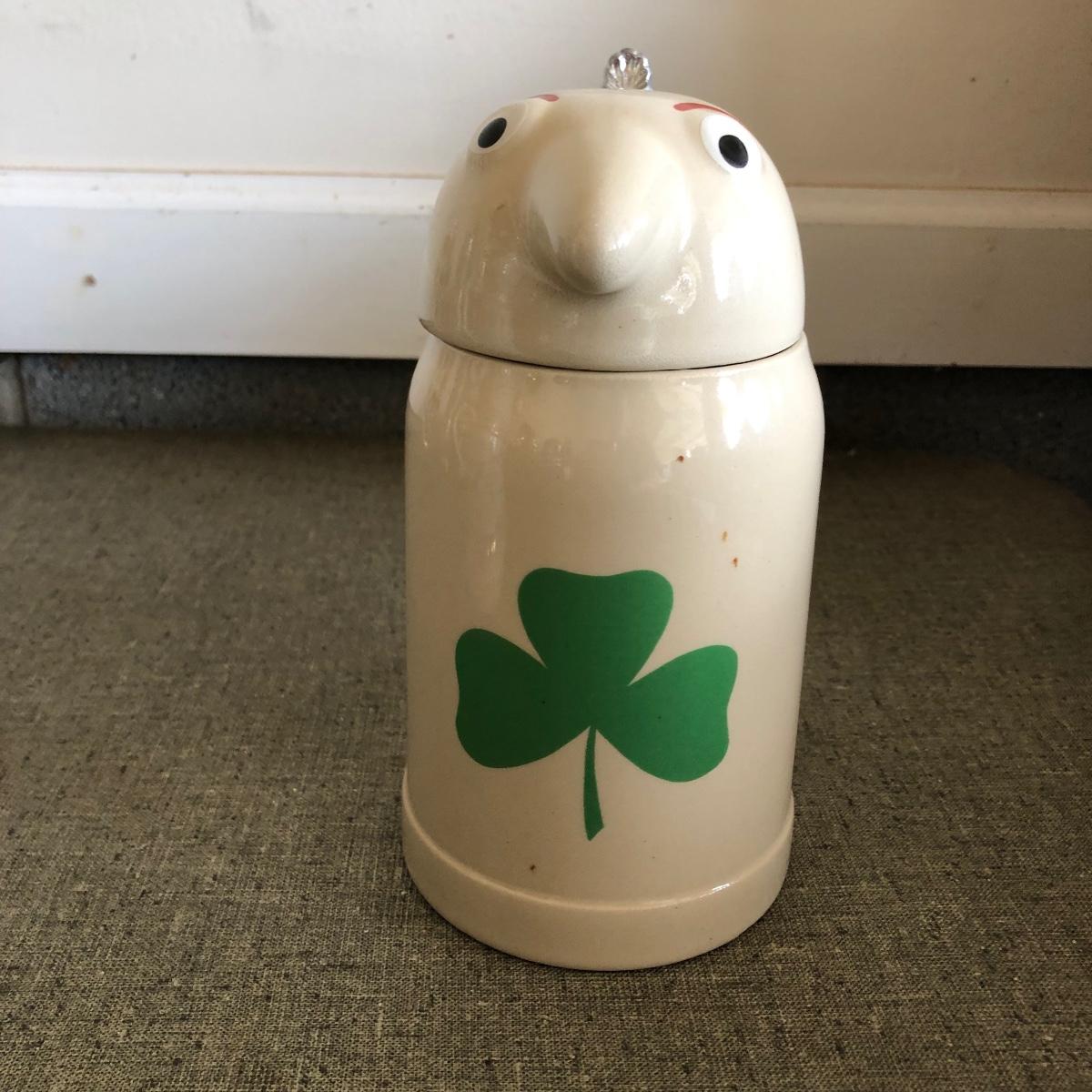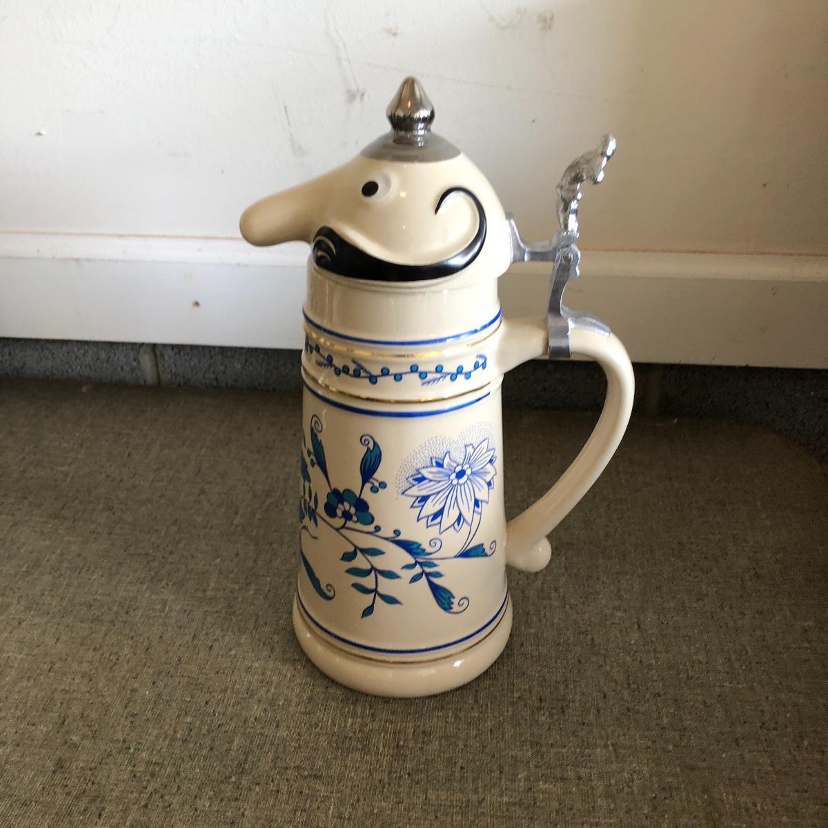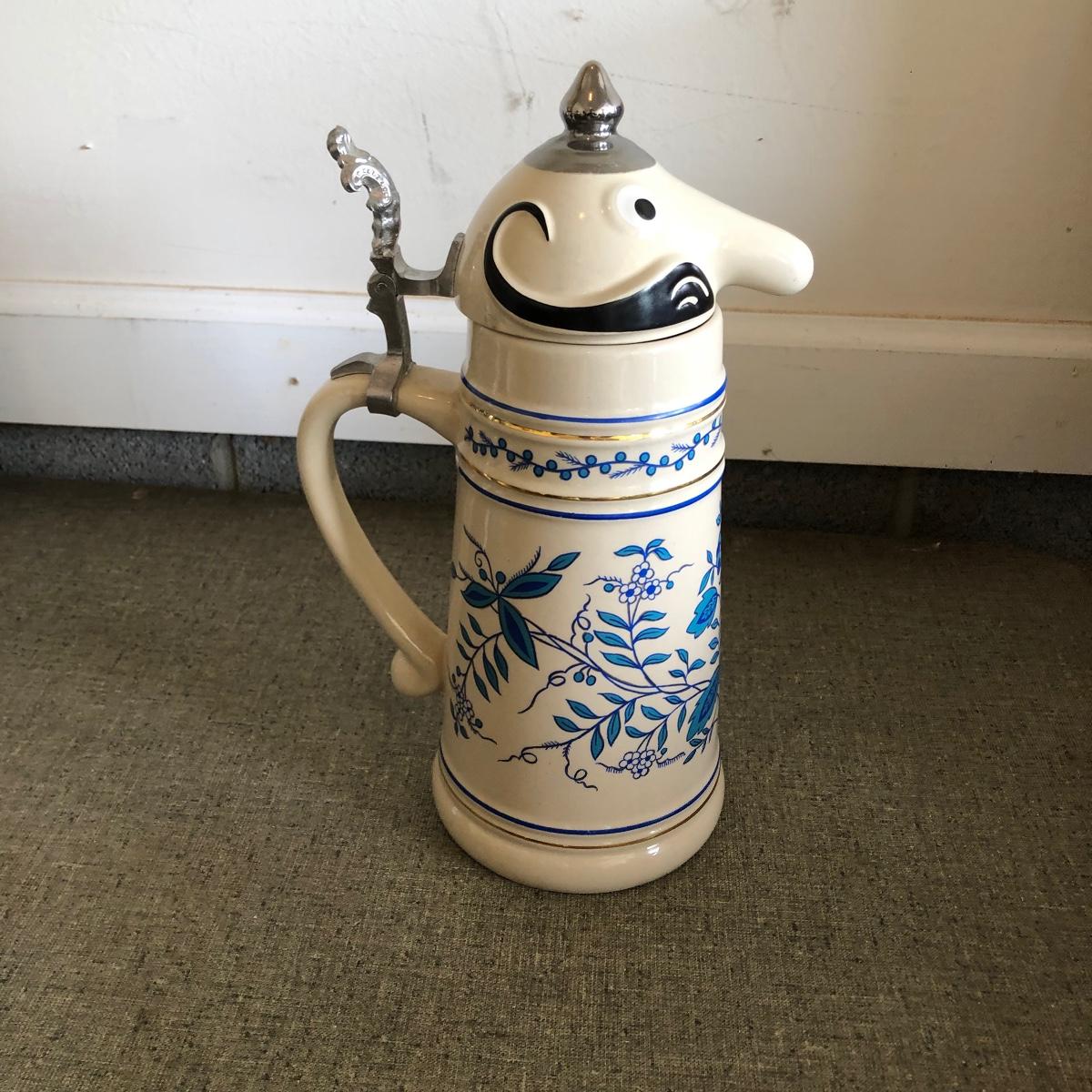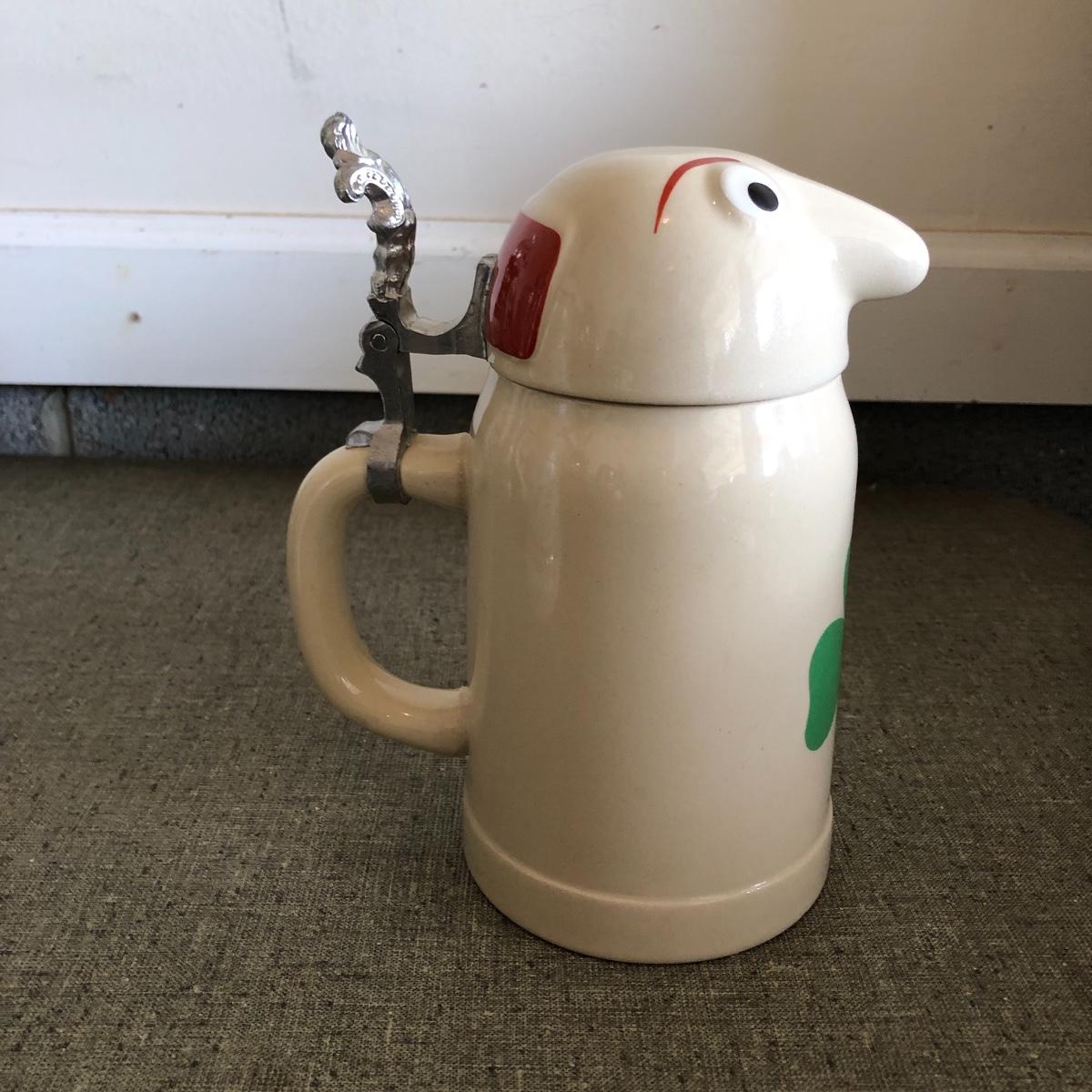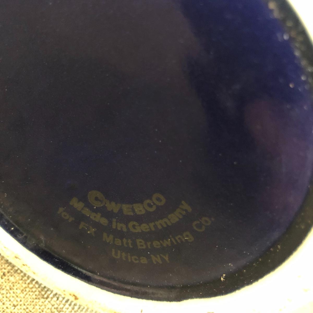 Lot includes Police officer style Beerstein, three leaf clover Beerstein and a mustached Beerstein all marked Webco Made in Germany. Largest Beerstein measures 4.25”D x 11.50”D.
