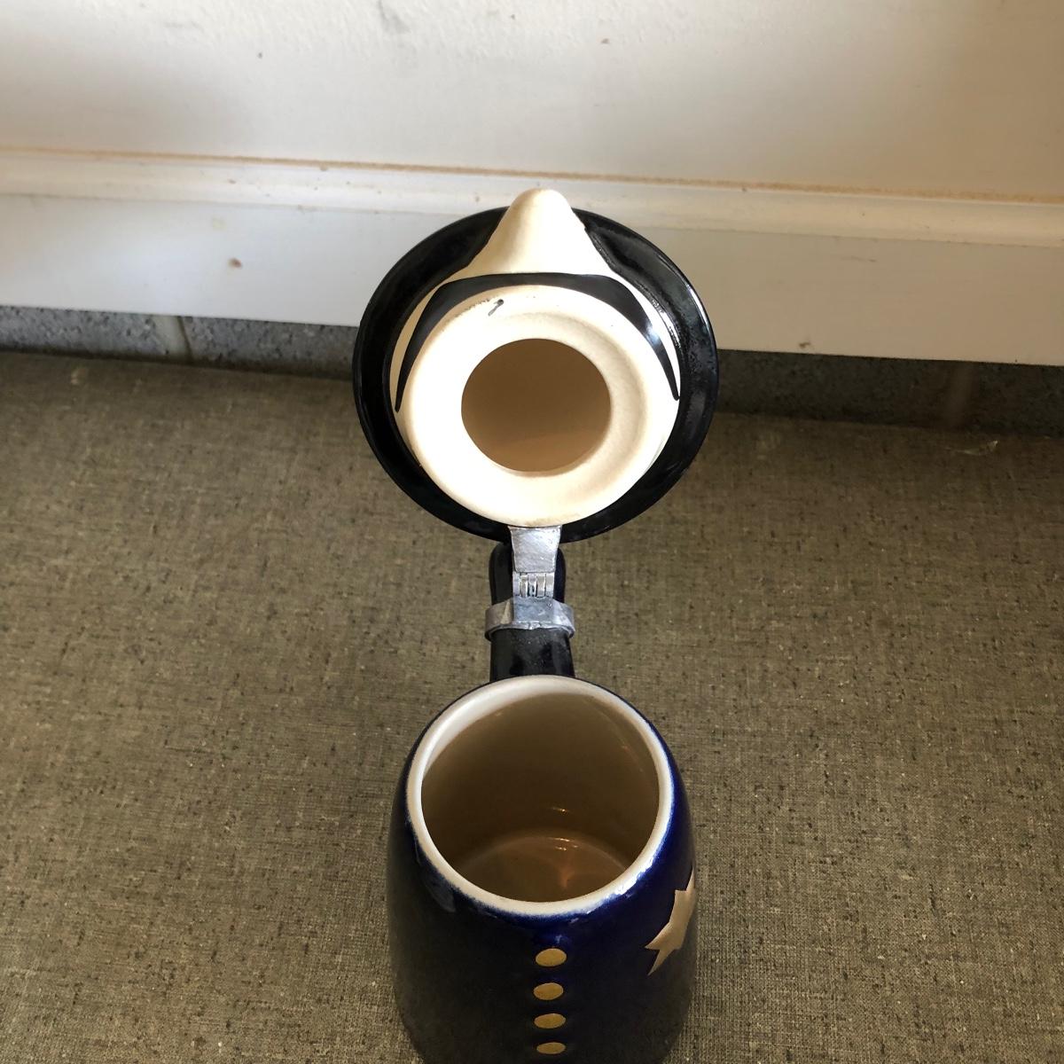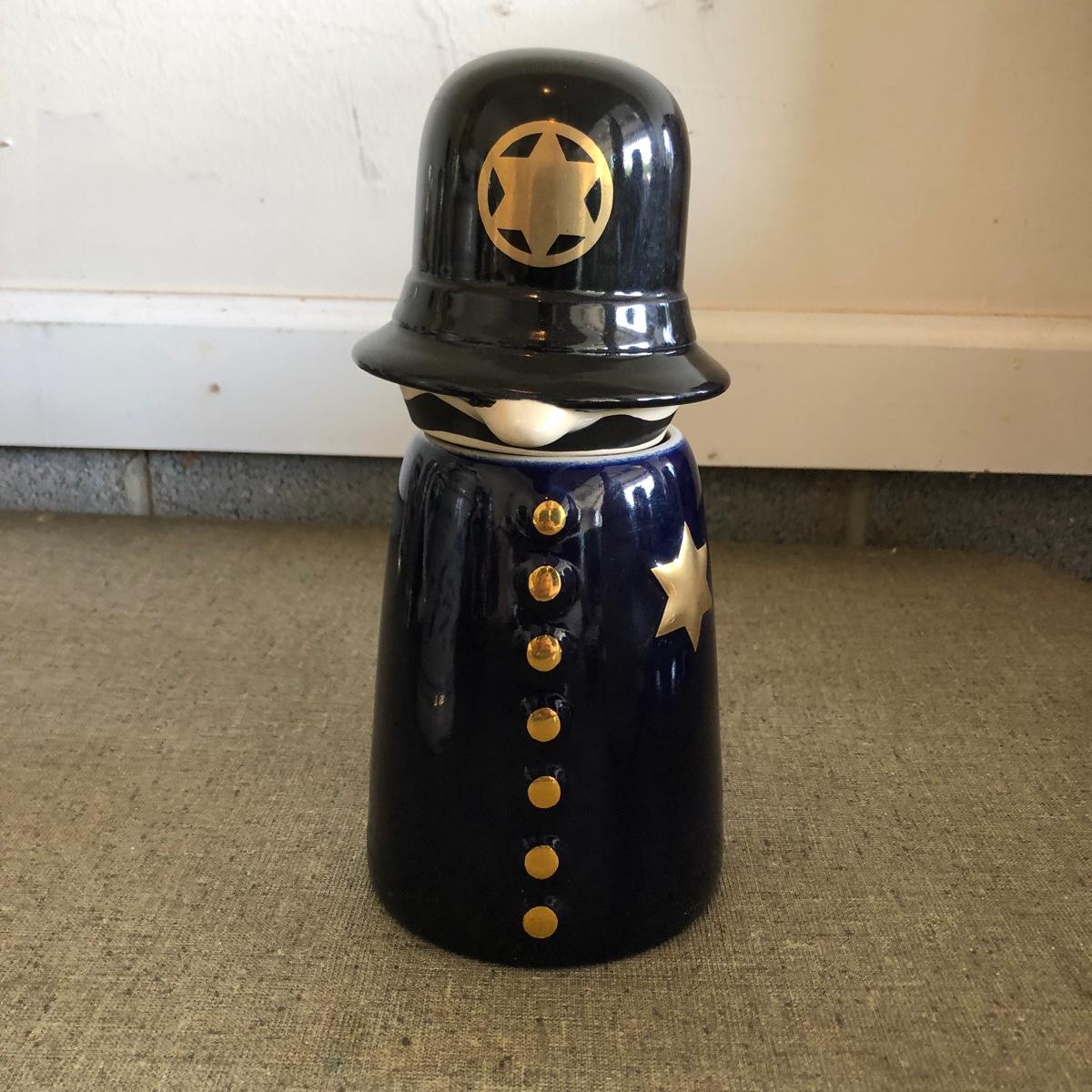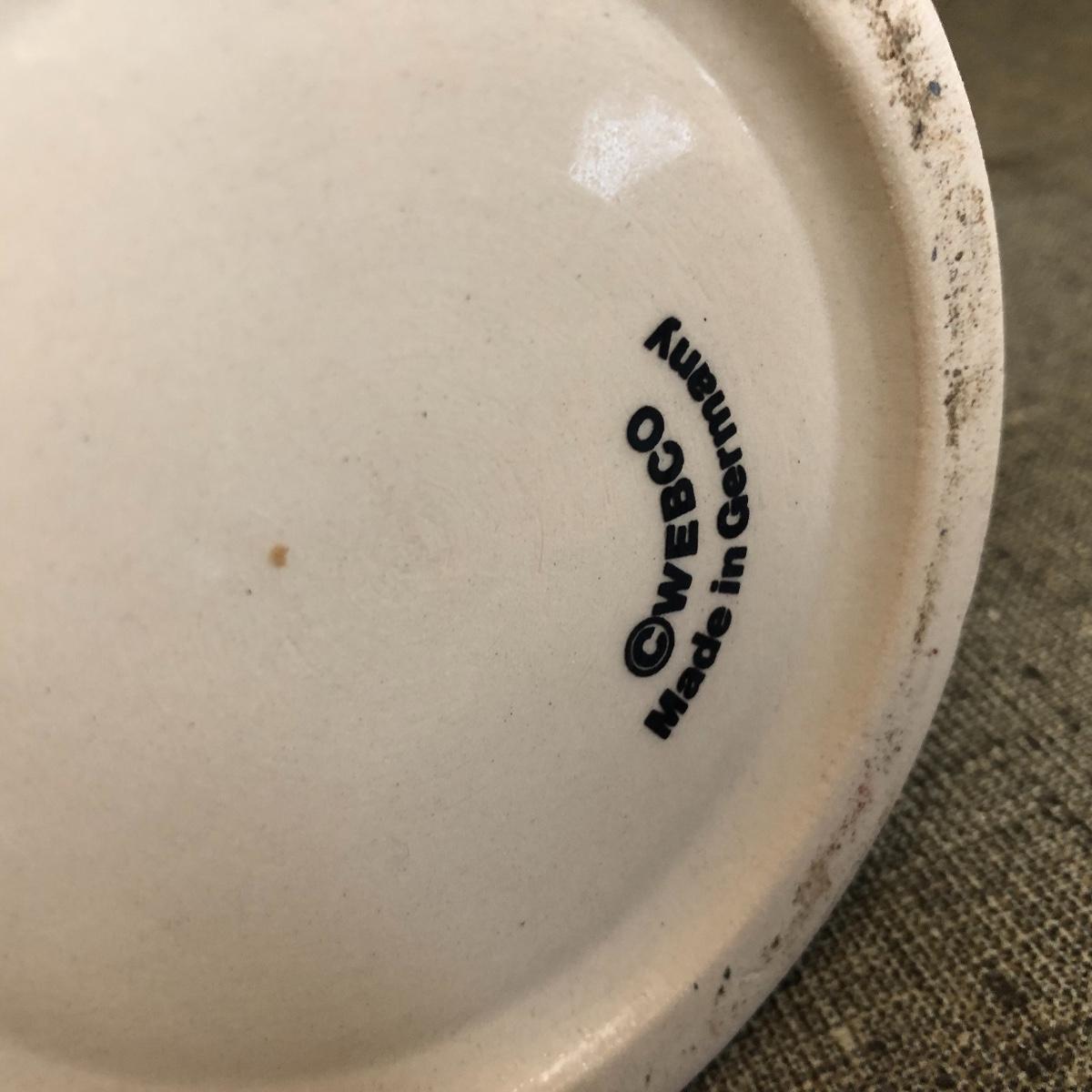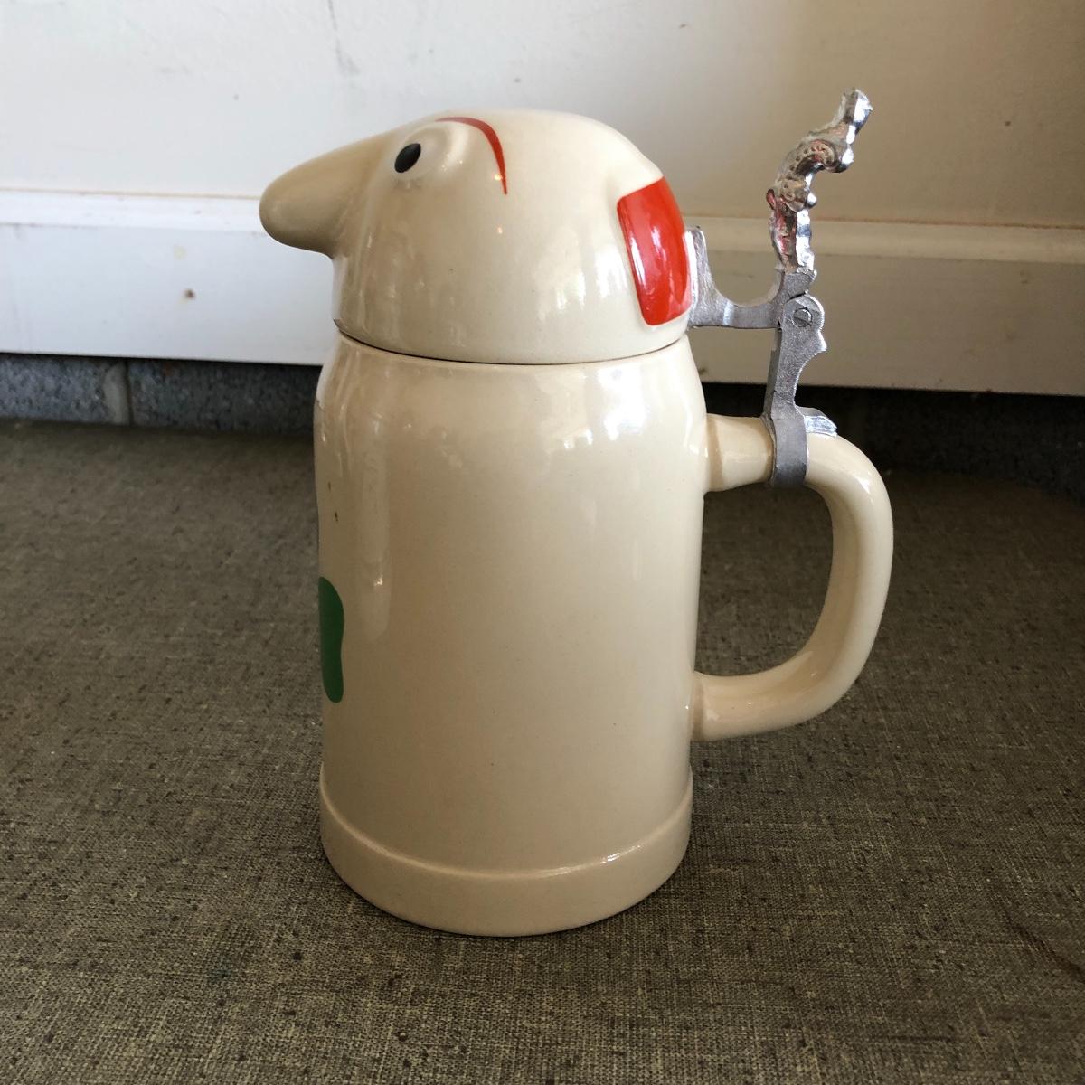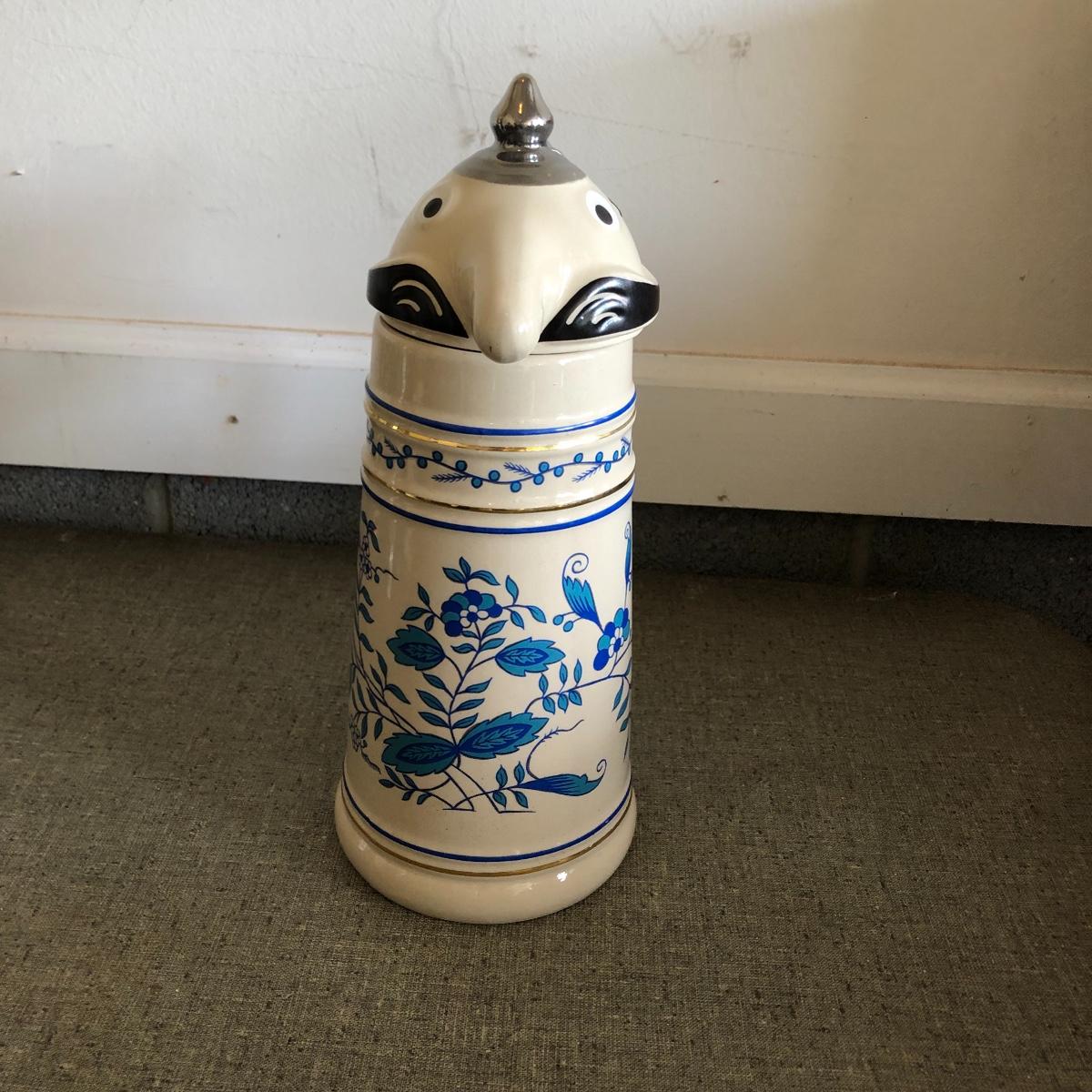 Lot includes Police officer style Beerstein, three leaf clover Beerstein and a mustached Beerstein all marked Webco Made in Germany. Largest Beerstein measures 4.25”D x 11.50”D.
