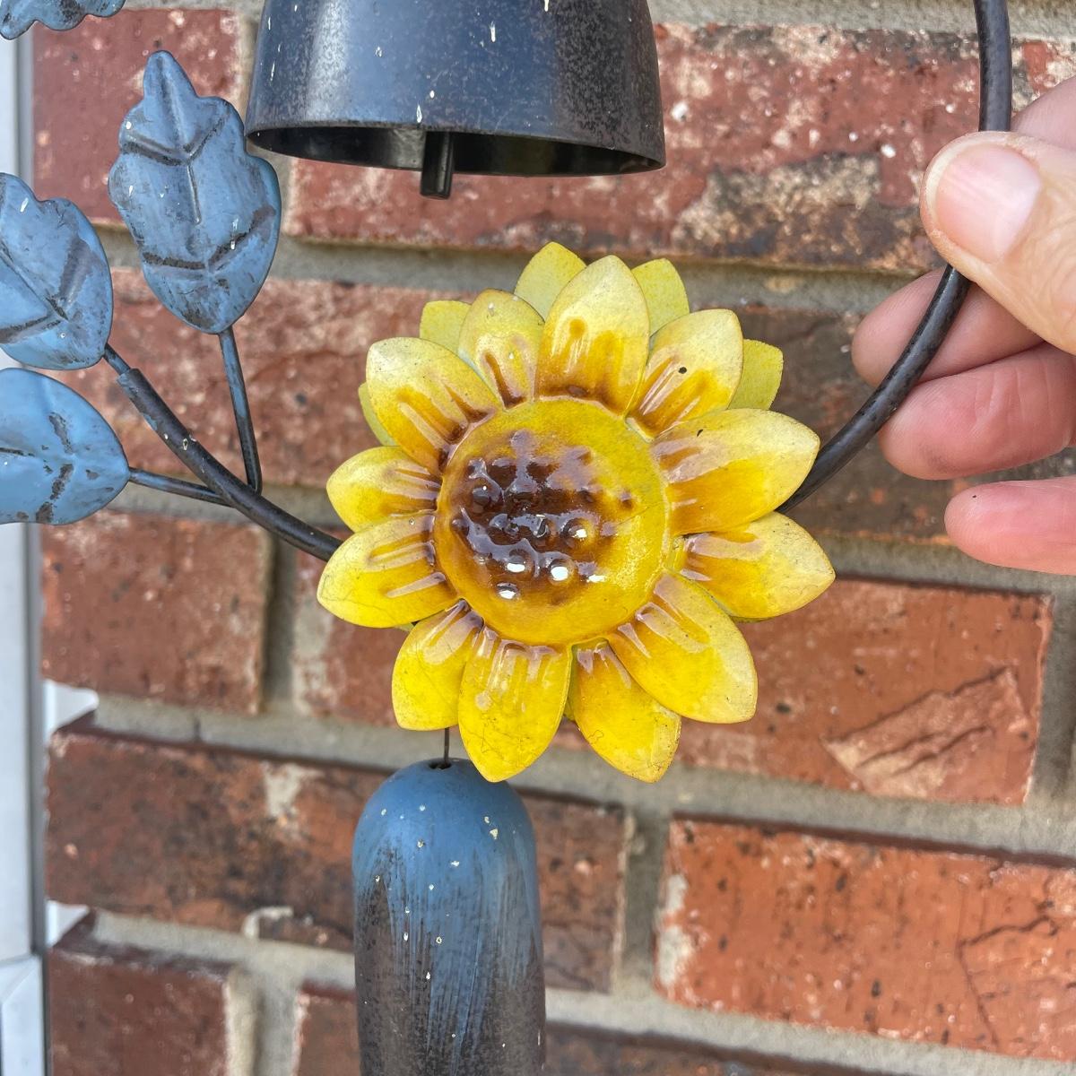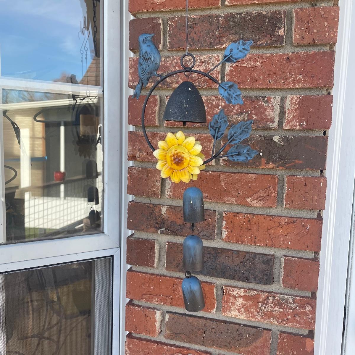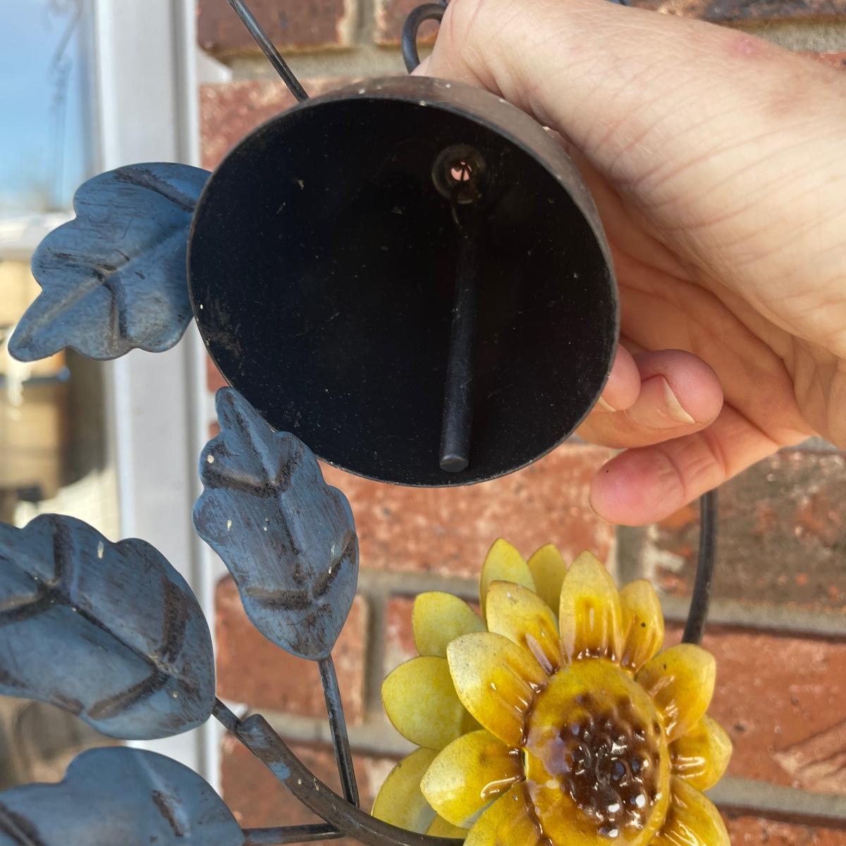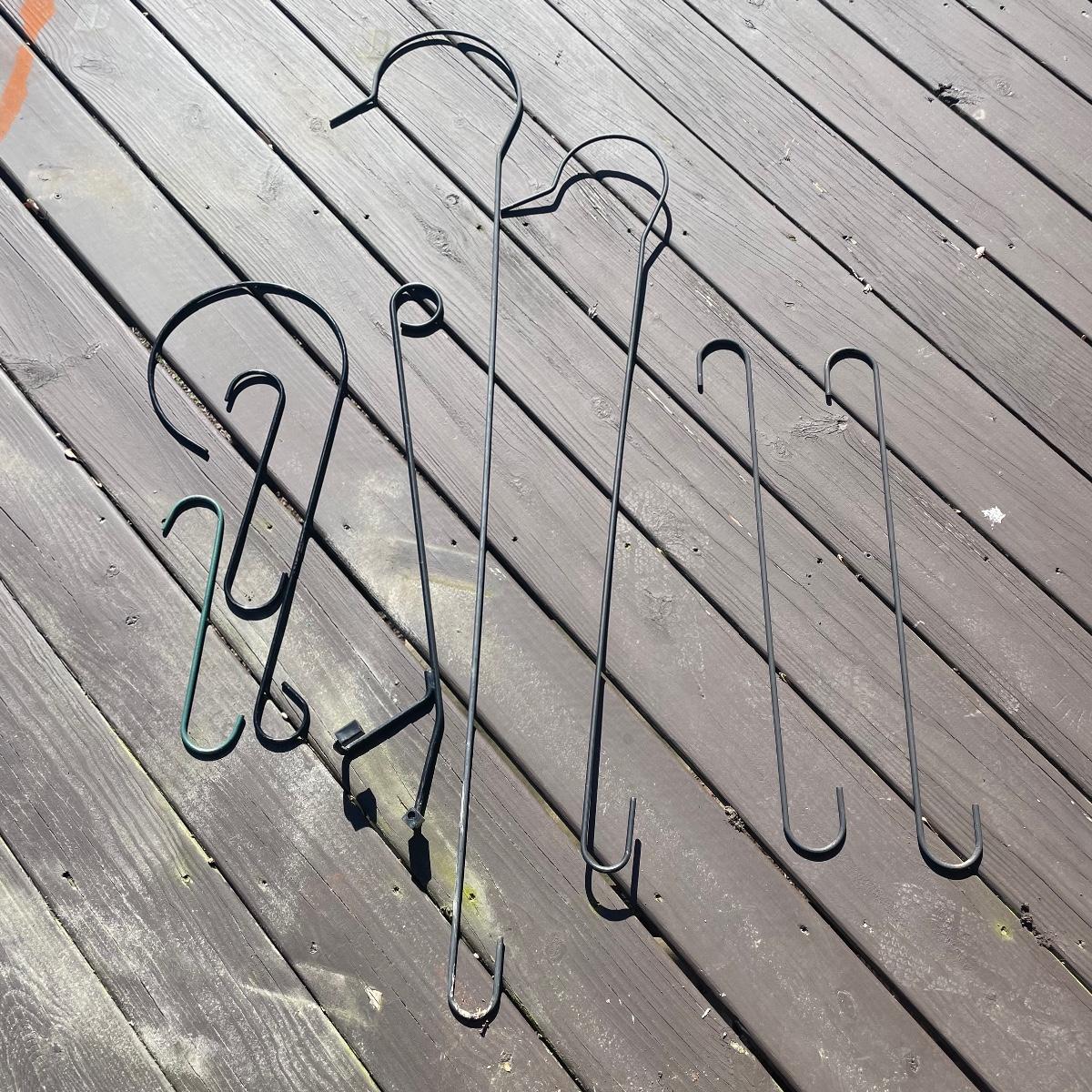 A great trio of wind chimes here with largest being the purple painted metal one that measures 9” diameter x 20” long (not including the rope). The smaller sunflower one has four bells, all are metal. Also included are nine hanging hooks, some have rubber coating, all are metal. Largest hook measures 48” long.