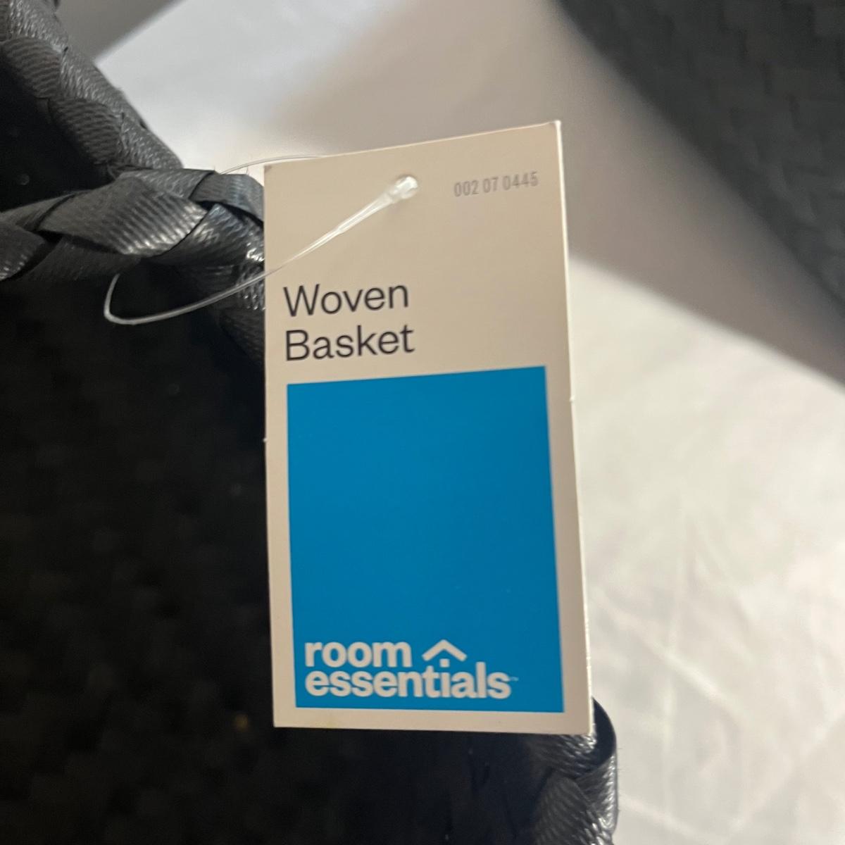 Lot includes a pair of woven nylon room essentials baskets that measure 15” x 19” x 9” and a smaller plastic woven basket.