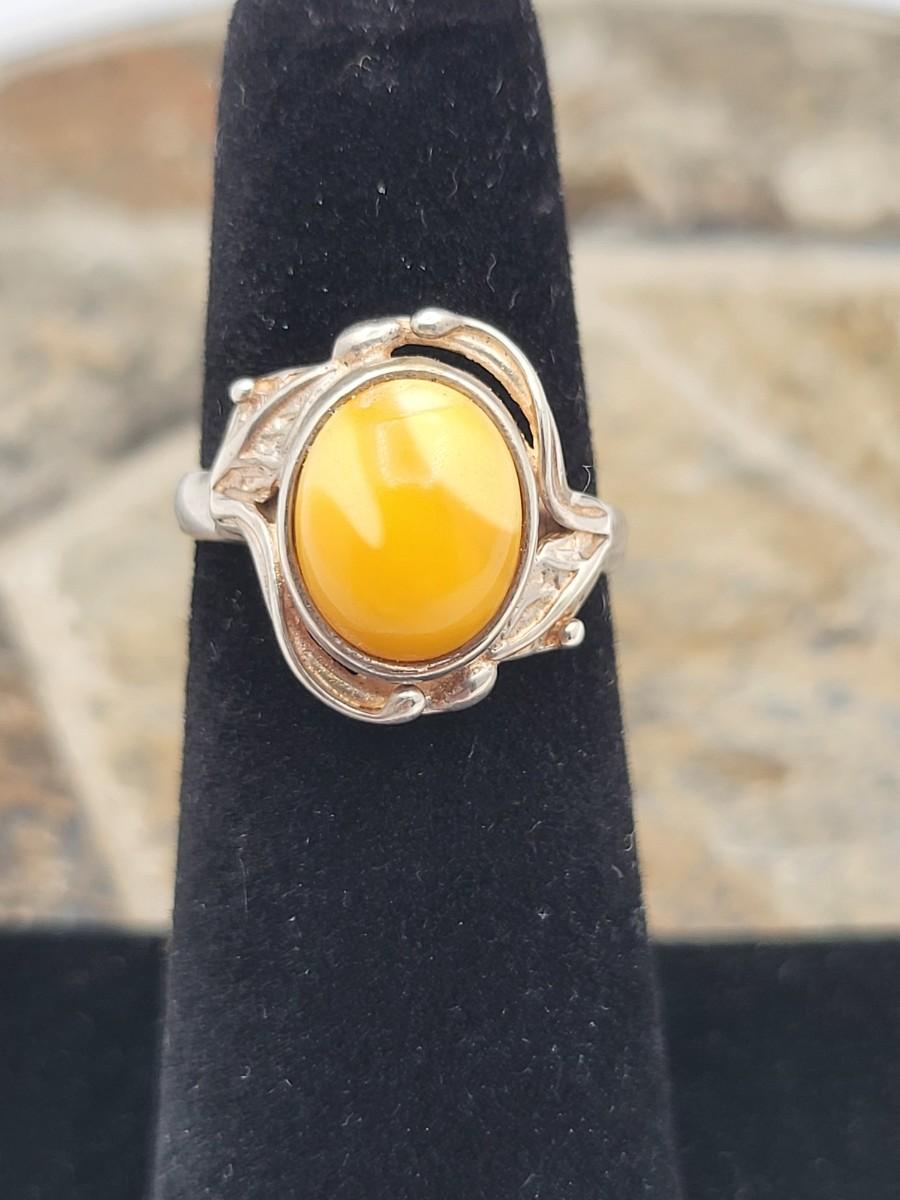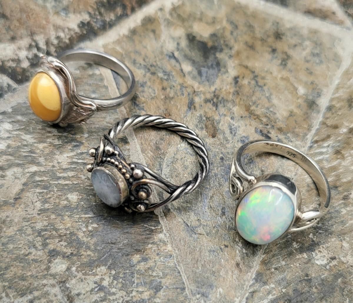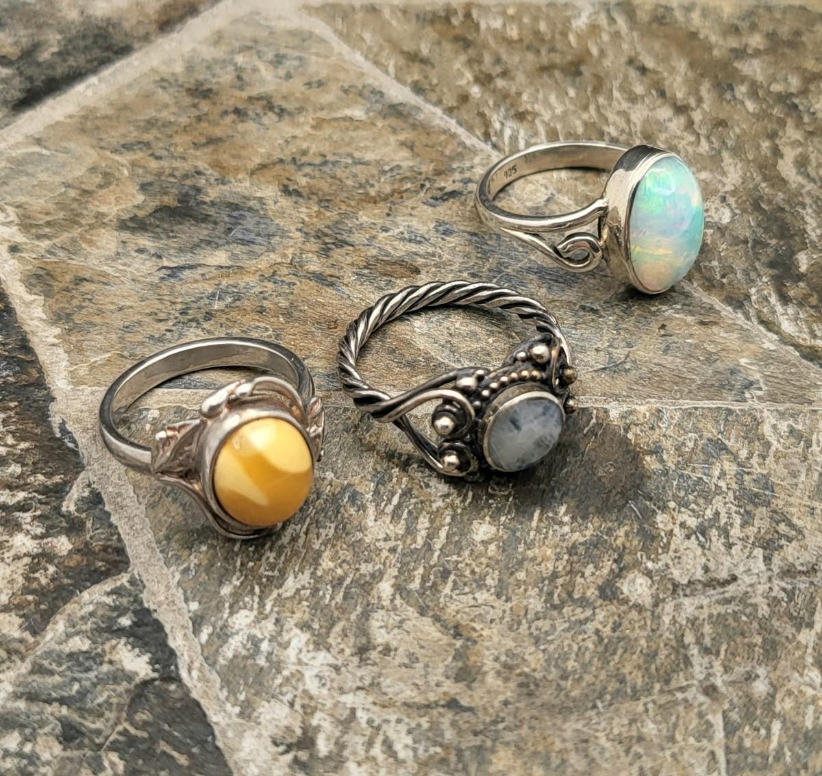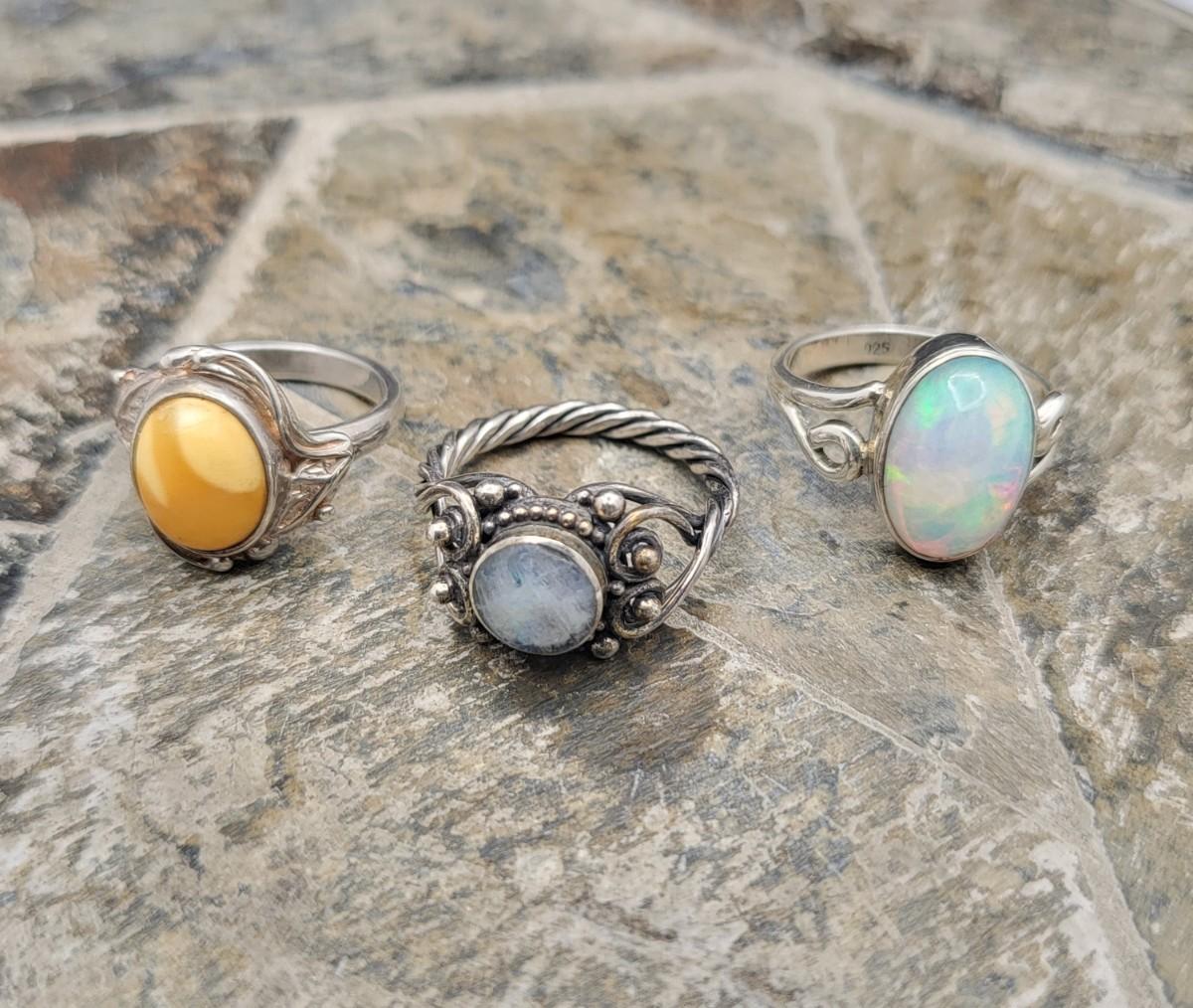 Marbled butterscotch Amber, size 4. Heart and twist band, round Labradorite stone, size 5.5. Oval Opal ring size 5.5. Total weight is 9.5 grams.