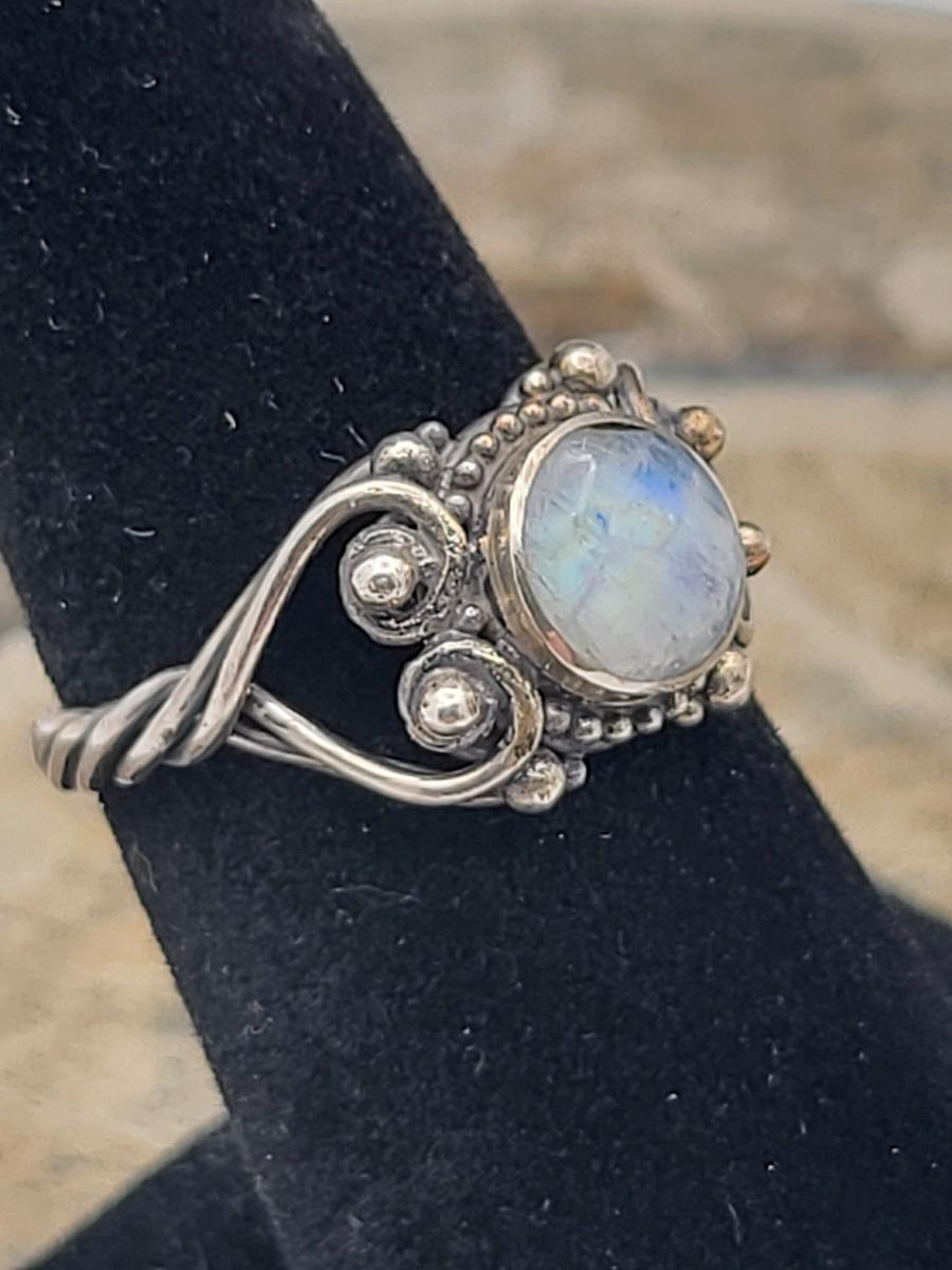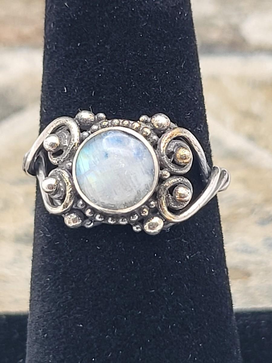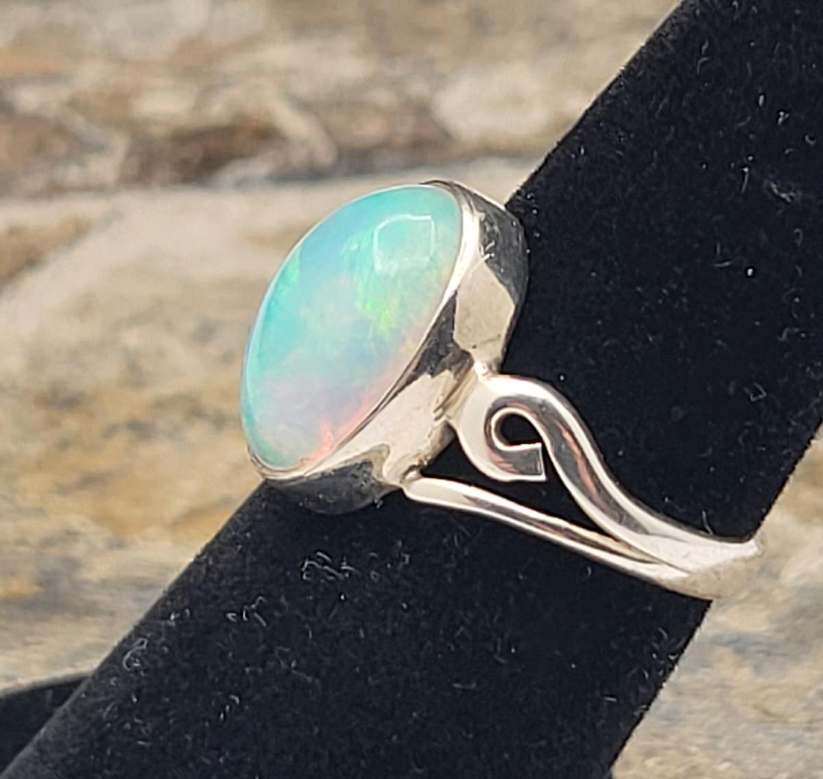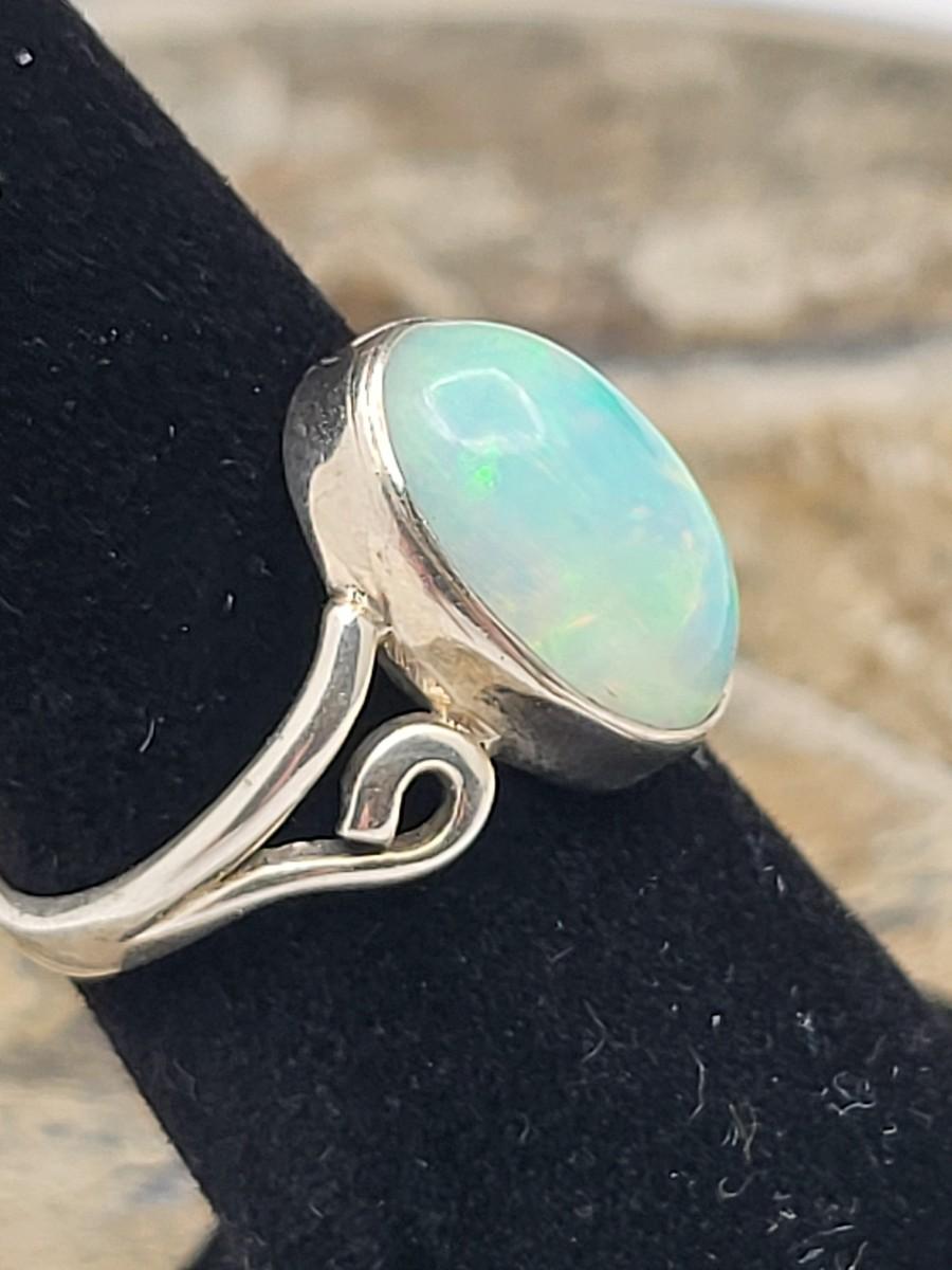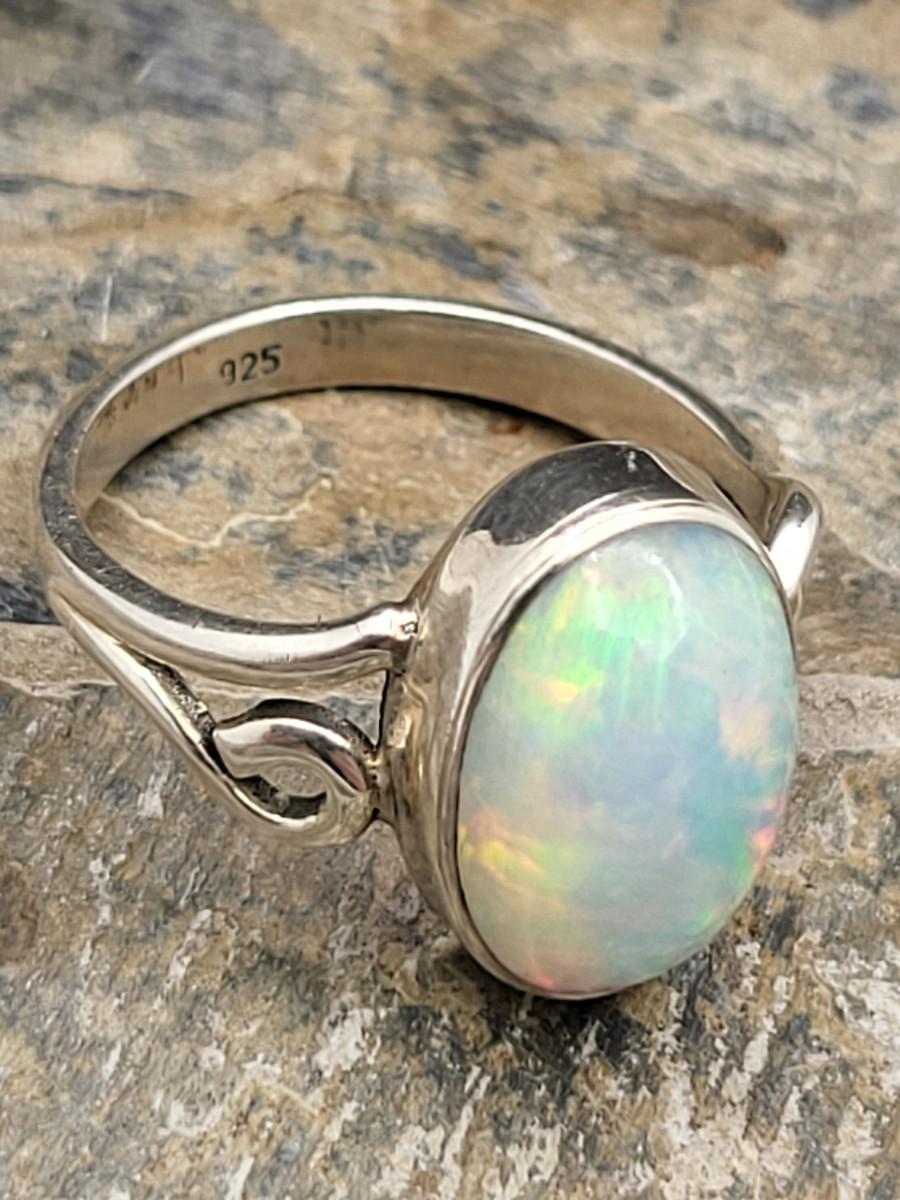 Marbled butterscotch Amber, size 4. Heart and twist band, round Labradorite stone, size 5.5. Oval Opal ring size 5.5. Total weight is 9.5 grams.