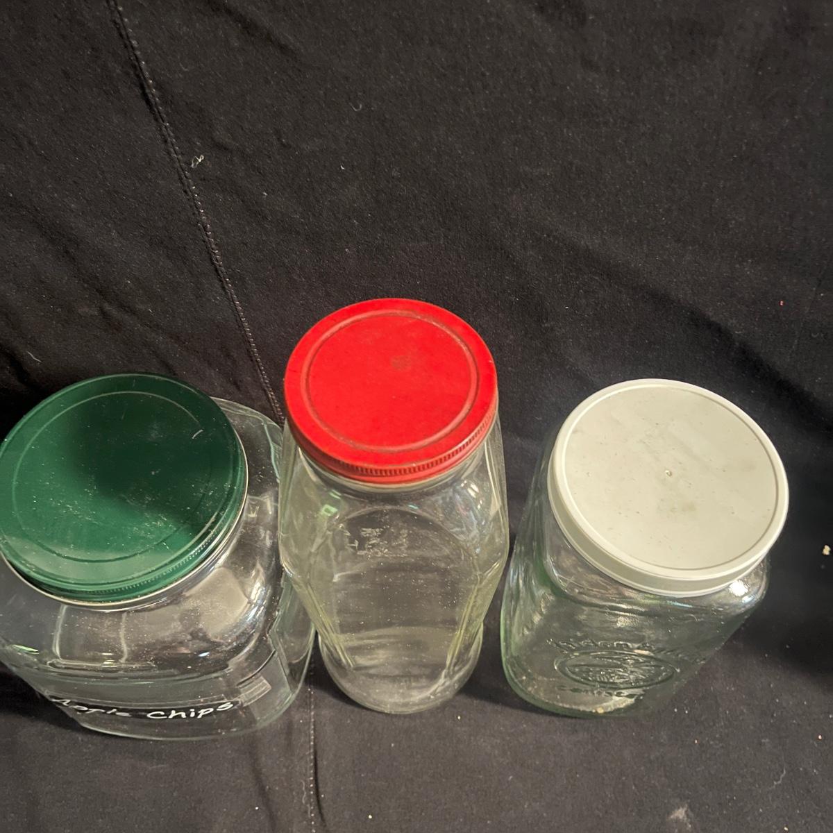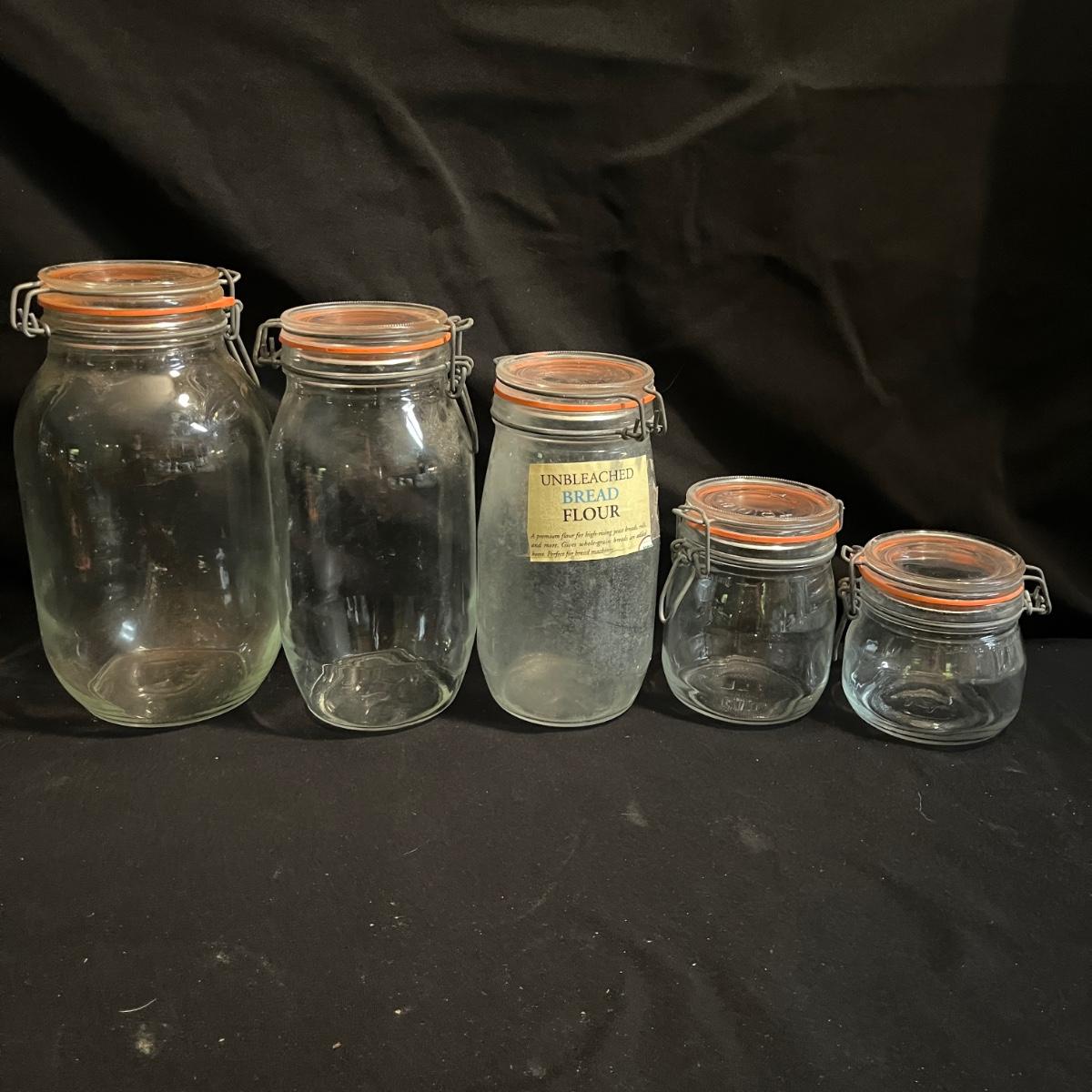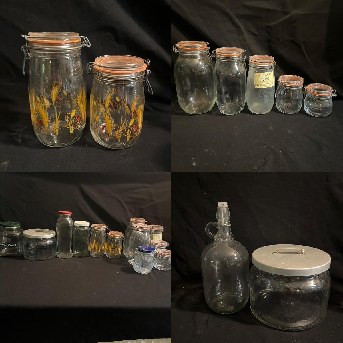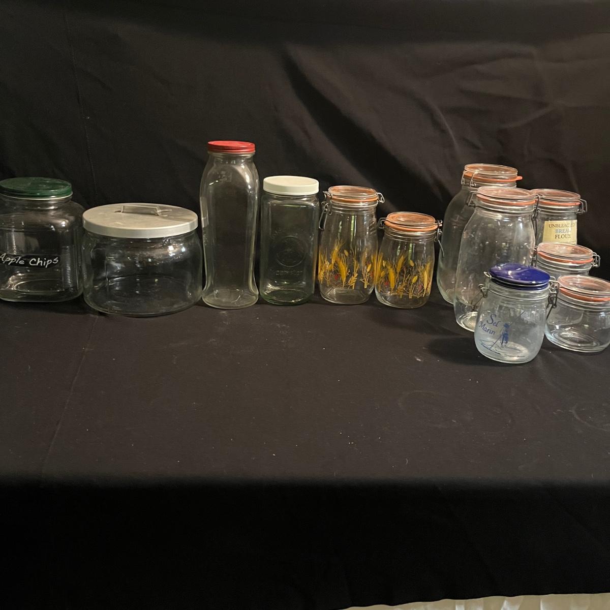 Lot includes four Triomphe wire bale lid glass canisters, four unmarked wire bale lid glass canisters, four large jars and one bottle with wire bale lid. Largest canister measures 5.5”D x 11”H.