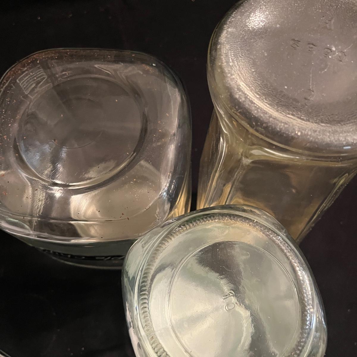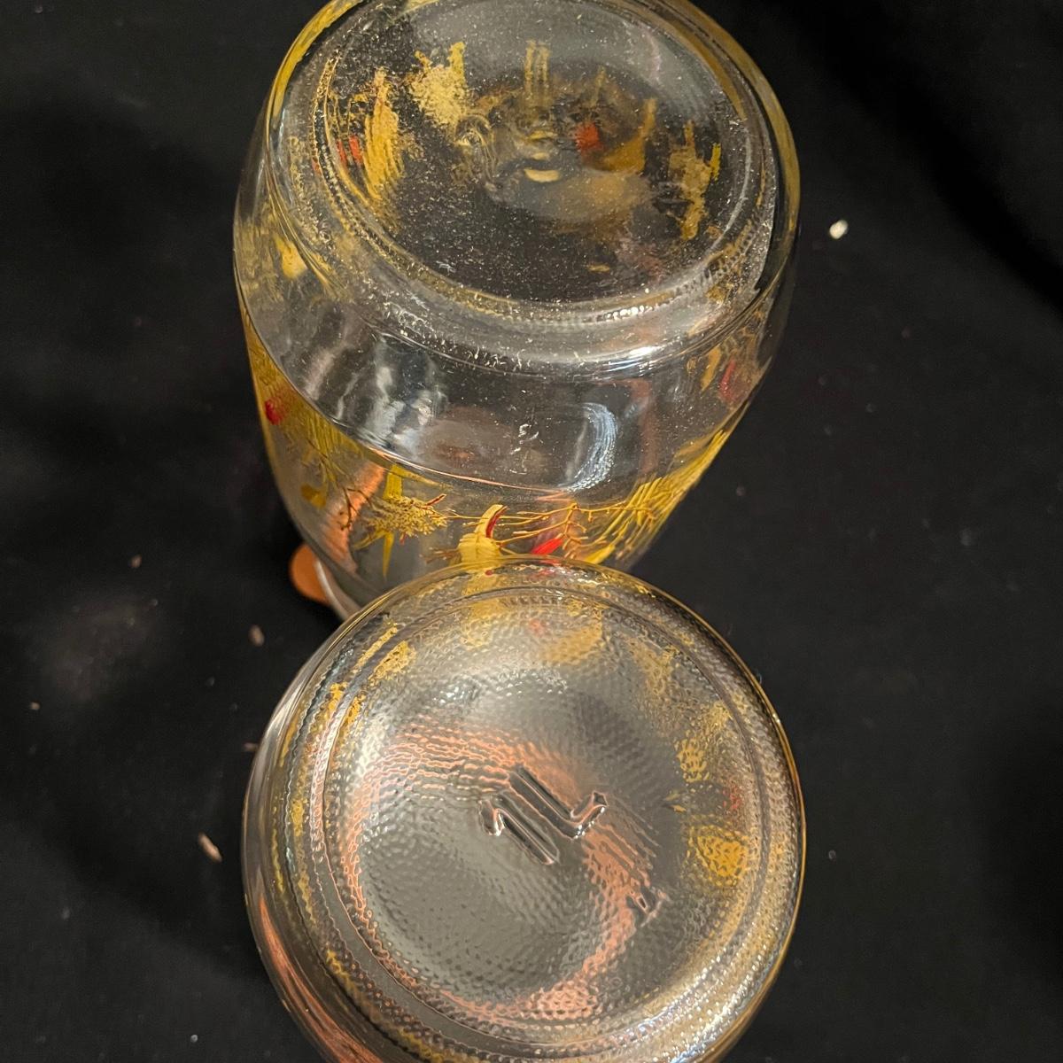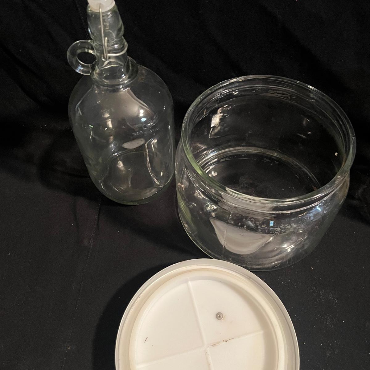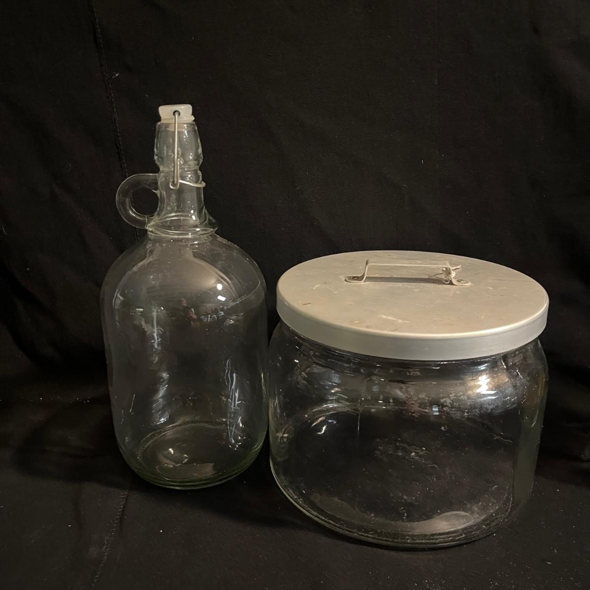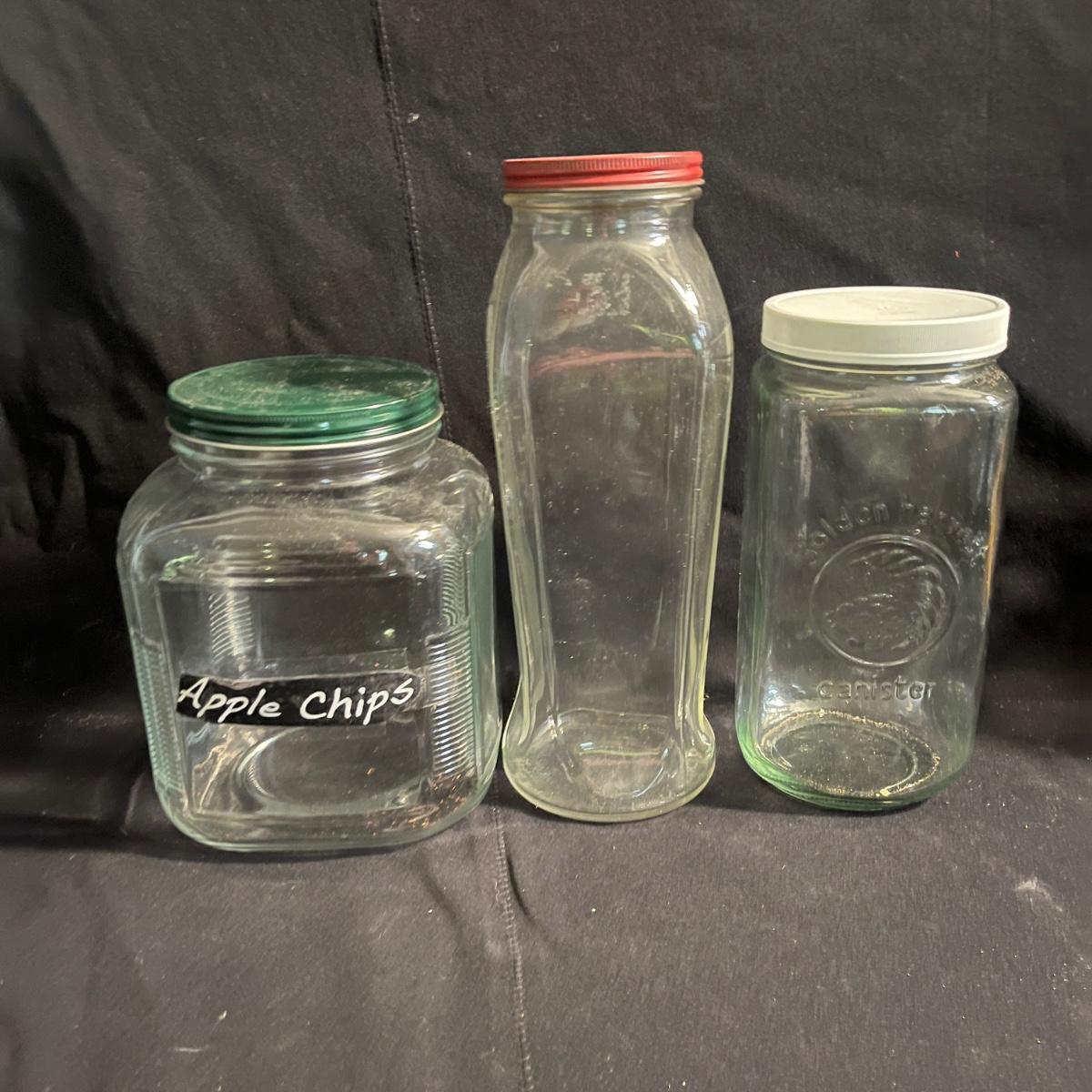 Lot includes four Triomphe wire bale lid glass canisters, four unmarked wire bale lid glass canisters, four large jars and one bottle with wire bale lid. Largest canister measures 5.5”D x 11”H.