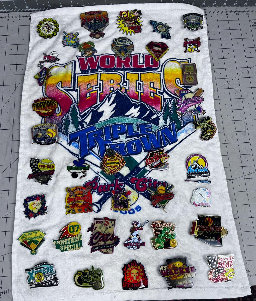 Triple Crown Park City World Series, Bar Towel Covered with Girls Fast Pitch Softball pins